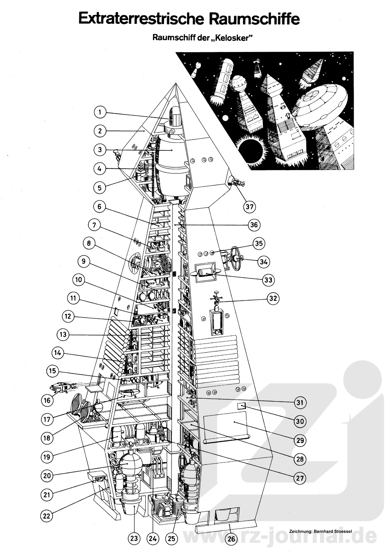 Allgemeines: Die Kelosker sind die herrschende Rasse der Kleingalaxis Balayndagar und eines der sieben Konzilvölker. Sie sind Meister des mehrdimensionalen Denkens und beherrschen sogar die Mathematik der 7. Dimension. Trotz ihrer Genialität im geistigen Bereich sind sie durch ihren Körperbau unfähig, komplizierte technische Geräte selbst herzustellen und zu bedienen. Ihre Raumschiffe werden von dem Konzilvolk der Laren nach ihren Plänen für sie gebaut. Die Bedienungsinstrumente der Raumschiffe sind sehr robust und einfach gebaut, damit die Kelosker sie auch bedienen können. Ihre Raumschiffe besitzen keine einheitlichen Formen, da die Kelosker ständig auf der Suche nach neuen Formen und Verbesserungen sind. Für Frachttransporte verwenden sie walzenförmige Schiffe mit rundem Bug und glattem Heck. Für ihre Forschungsflüge verwenden sie Raumschiffe, deren Form alles sein kann, von einer Pyramide bis zu einer auf die Spitze gestellten Doppelpyramide mit abgeschnittener Unterseite. An deren Spitzen können die verschiedensten Konstruktionen angebracht werden, wie Kugeln oder Würfel. Darin sind Spezialmaschinen oder Versuchsapparaturen untergebracht. Die Raumschiffe können eine Höhe von 1000 m haben, doch die Durchschnittshöhe beträgt etwa 600 m. Das abgebildete Raumschiff hat eine Höhe von rund 200 m und eine Maximalbreite von 70 m, sowie eine Besatzungsstärke von 80 Keloskern. |