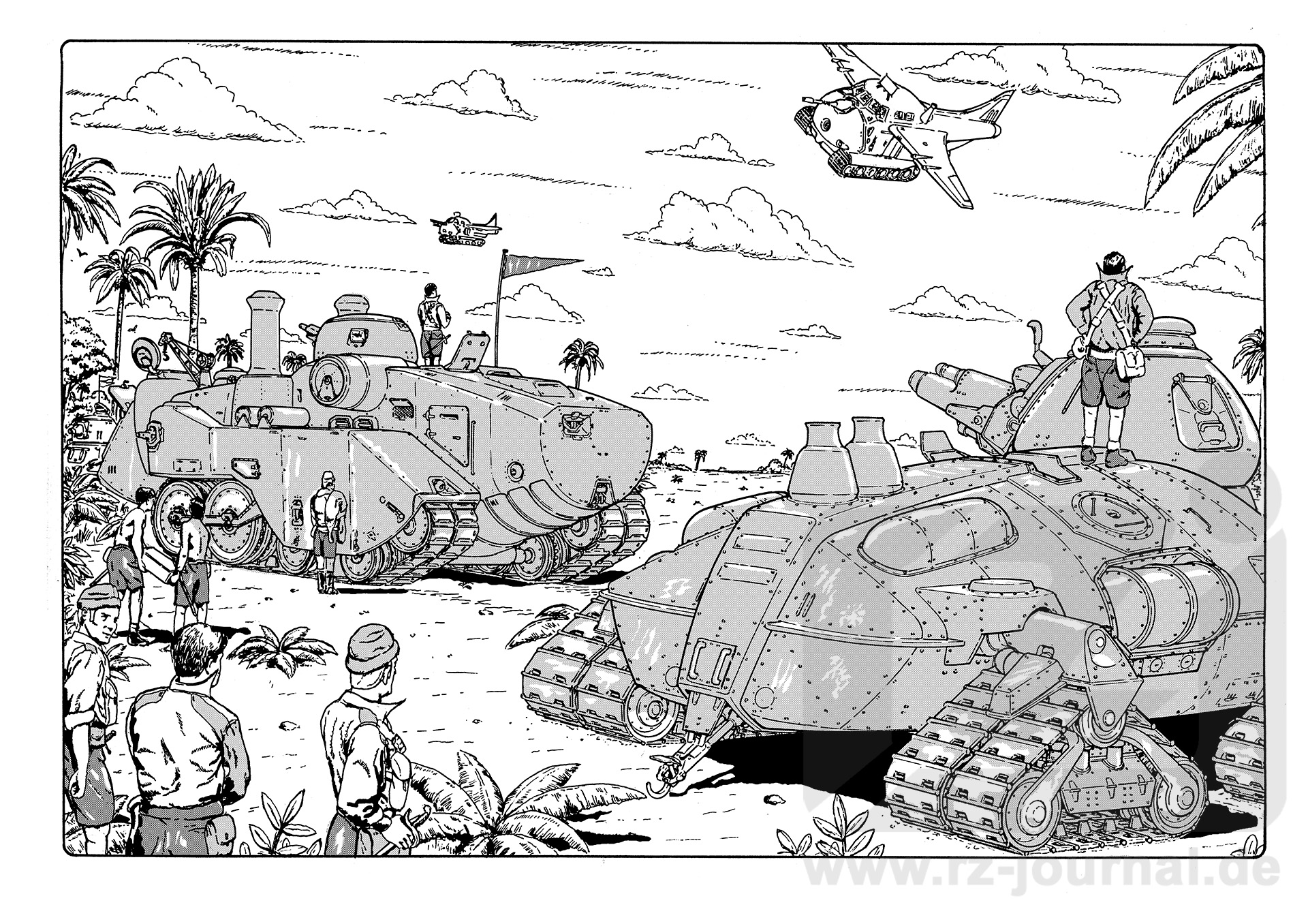 Allgemeines: Um ihre in den Festungsstädten an der Westküste Lemurias gelegenen Industrien mit Rohstoffen versorgen zu können, waren die Altlemurer gezwungen, Bergwerkssiedlungen im Hinterland anzulegen. Als der Nullzeit-Deformator der terranischen Zeitreise-Expedition ca. 52 000 v. Chr. aus dem Zeitstrom geschleudert wurde (s.a. die ersten beiden Teile dieser DB-Serie, PR 723 und 735 IV. Auflage), materialisierte er zu einem Zeitpunkt, als sich die Lage zu Gunsten der Präbios entwickelt hatte. Die Bio-Züchtungen kontrollierten sämtliche Gebiete, die nicht im direkten Umkreis der lemurischen Siedlungen und Stützpunkte lagen - Versorgungstransporte konnten nur noch in großen, stark gesicherten Konvois erfolgen. Neben den Schutzfahrzeugen (s. Teil 1 der Serie) bestanden diese Konvois hauptsächlich aus 10-spännigen Pferdefuhrwerken und durch Dampfturbinen angetriebene, gepanzerte Zugmaschinen. Diese unterteilen sich in zwei Hauptkategorien: große Schlepp-Traktoren, die 2 - -3 Anhänger ziehen konnten, sowie Zugwagen für kleinere Lasten. Letztere erfüllten gleichzeitig eine Doppelfunktion als Schutzfahrzeuge - im Gefahrenfall koppelten sie ihre Zuglast ab und wurden dann als leichtes Panzerfahrzeug eingesetzt. In der Darstellung erkennt man vorne rechts einen solchen Zugwagen. Der Antrieb erfolgte durch eine einzelne Dampfturbine, die vier separate Doppel-Kettenlaufwerke bewegte. An seiner Front war eine drehbare Geschützkuppel montiert, die wahlweise einen Flammen-, oder einen mittelgroßen Raketenwerfer beherbergte. Das Gewicht des Fahrzeugs betrug ca. 15 Tonnen, die Reichweite mit einer Feuerungsladung ca. 150 km bei einer Höchstgeschwindigkeit von rund 60 km/h (ohne Anhängerlast). Links im Hintergrund befindet sich ein großer Schlepp-Traktor für schwere Zuglasten. Mit einem Eigengewicht von 28 Tonnen war er in der Lage, ein Gewicht von ca. 50 Tonnen zu ziehen. Die Reichweite betrug ca. 90 km, die Höchstgeschwindigkeit gut 40 km/h. Als Antrieb dienten zwei gekoppelte Dampfturbinen, auf dem Rumpfrücken befand sich oft ebenfalls eine Panzerkuppel mit einer kleineren Raketenwaffe zur Verteidigung. Im Falle eines Angriffes durch die Präbios bildeten die Fahrzeuge eines Konvois eine Wagenburg, wobei die gepanzerten Zugmaschinen und Schutzfahrzeuge im äußersten Ring standen. Ergänzt wurde das Verteidigungssystem durch fahrbare Raketenwerfer und die Raketenkarabiner der Besatzung. Die Verständigung erfolgte mittels Flaggsignalen, Dampfpfeifen und bei günstiger Witterung durch Sonnen-Signalspiegel. Die Zeichnung stellt den Zeitpunkt des ersten Zusammentreffens zwischen Mitgliedern der Zeitreise-Expedition und den Lemurern dar. Die Terraner näherten sich einem lemurischen Transport- Konvoi, nachdem sie einen Angriff der Präbios mit Hilfe der Strahlen-Geschütze ihrer Flugpanzer vom Typ Shift zurückgeschlagen haben. (Quellen: PR-Bände 424-429, 1. Auflage) |