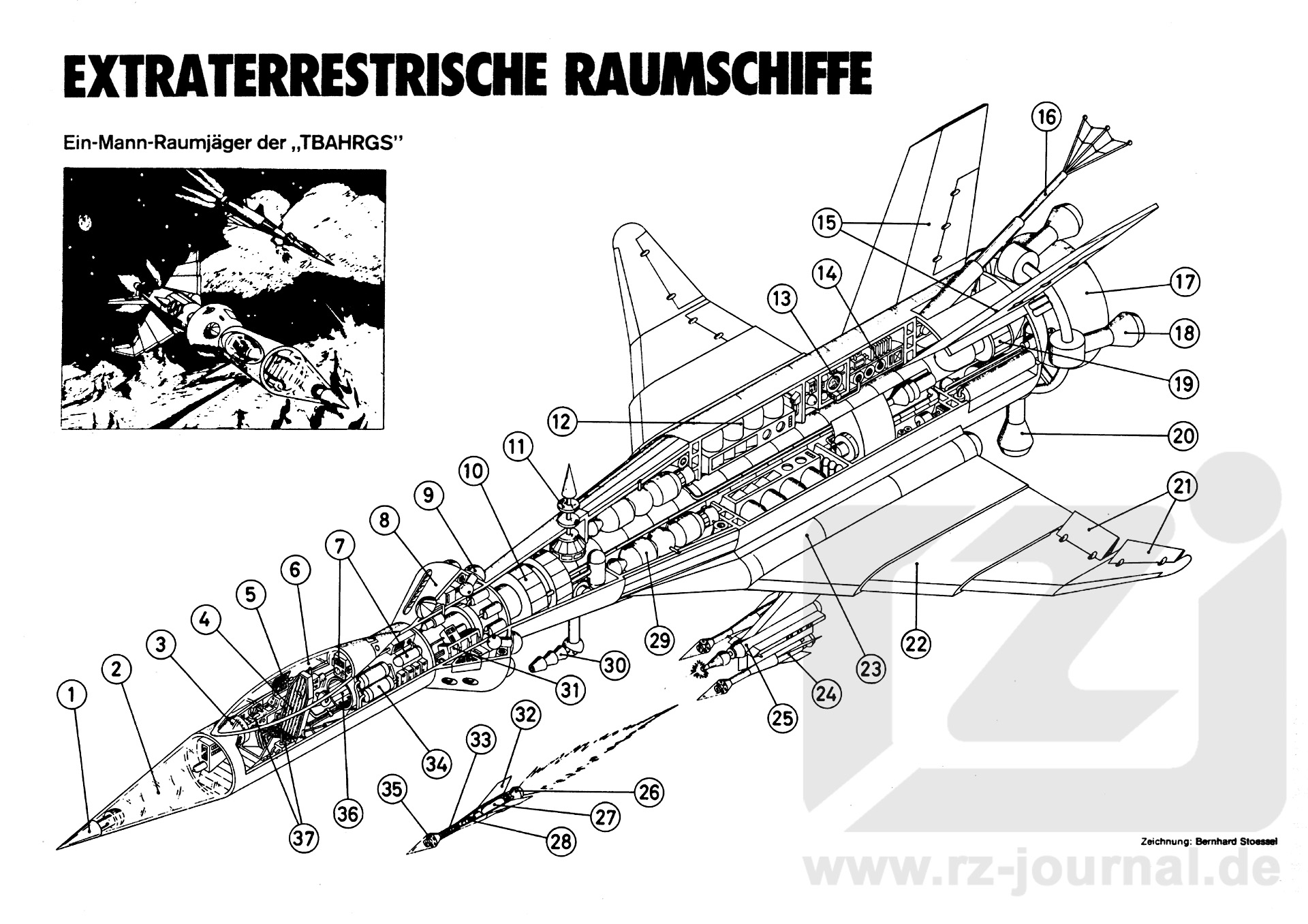 Allgemeines: Dieses 20 m lange und 2 m durchmessende Kleinraumschiff wird von den beiden Hilfsvölkern der „Kaiserin von Therm", den Tbahrgs und den Feyerdalern, für Kurzstreckeneinsätze verwendet. Dabei verzichtet man auf einen Überlichtantrieb. Die ausfahrbaren Tragflächen mit einer Spannweite von 11,5 m sowie das große Doppelleitwerk am Heck geben dem Raumschiff eine gute aerodynamische Stabilität bei Flügen innerhalb einer Planetenatmosphäre. Bei Raumflügen bzw. nach einer senkrechten Landung auf dem wulstförmigen Energiekissen am Heck, werden die Tragflächen eingefahren, da es die Tbahrgs sowie die Feyerdaler in ihrem ästhetischen Empfinden und Schönheitssinn stört. Zum Besteigen des Jägers schwebt der Pilot durch eine enge Antigravröhre zu dem nach hinten geklappten Schleudersitz. |