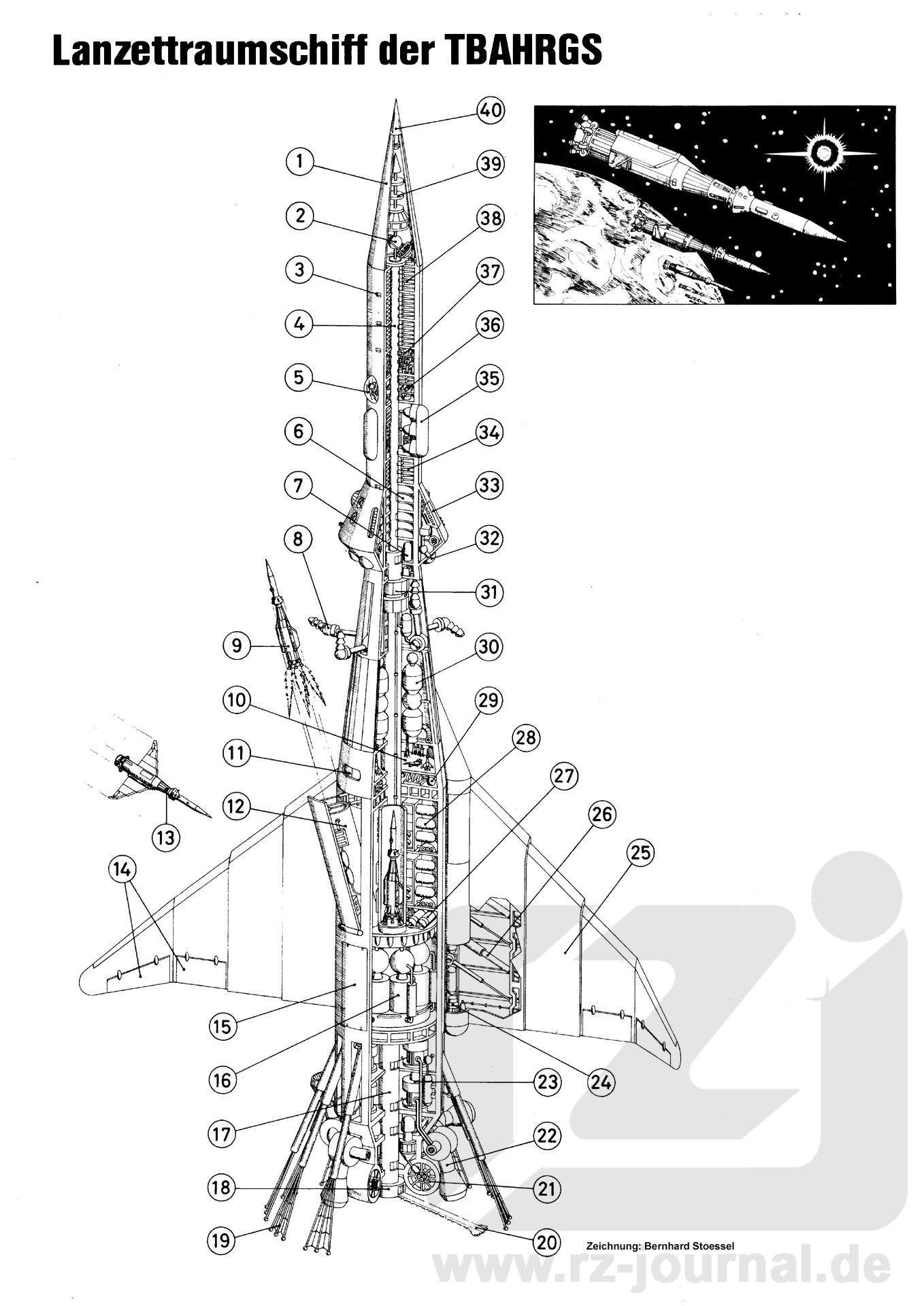 Allgemeines: Die schlanke Form dieses Raumschiffs zeugt von dem hohen ästhetischen Empfinden und Schönheitssinn seiner Erbauer, die eher auf das technisch Optimale verzichten als etwas - nach ihrer Auffassung - Unschönes zu schaffen. Das Volk der Tbahrgs gehört wie das bedeutendere Volk der Feyerdaler zu den untergebenen Hilfsvölkern der „Kaiserin von Therm”. Beide Völker besitzen Raumflotten mit Schiffen dieses Aussehens. Die Rißzeichnung zeigt die größte Schiffseinheit der Tbahrgs. Es hat eine Länge von 1000 m und einen max. Durchmesser von 100 m sowie eine Besatzung von 700 Mann. Die Feyerdaler besitzen noch größere Schiffe, die bis zu 1500 m lang sind; 150 m Durchmesser und eine Besatzung von 1500 Mann haben. Sie sind auch technisch auf einem höheren Stand als die Raumschiffe der Tbahrgs, mit stärkeren Maschinen und Bewaffnung. Die Lanzettraum- schiffe beider Völker besitzen riesige, ausfahrbare Deltaflügel, die bei Landeanflug innerhalb der Atmosphäre eines Planeten verwendet werden. Nach der Landung werden die Flügel wieder eingezogen, um dem gelandeten Raumschiff ein gefälligeres Aussehen zu geben. Das Raumschiff ruht nach der Landung auf einem wulstförmigen Energiekissen, und die 12 ausgefahrenen Landebeine dienen nur als Stütze, um das Schiff vor dem Umkippen zu bewahren. |