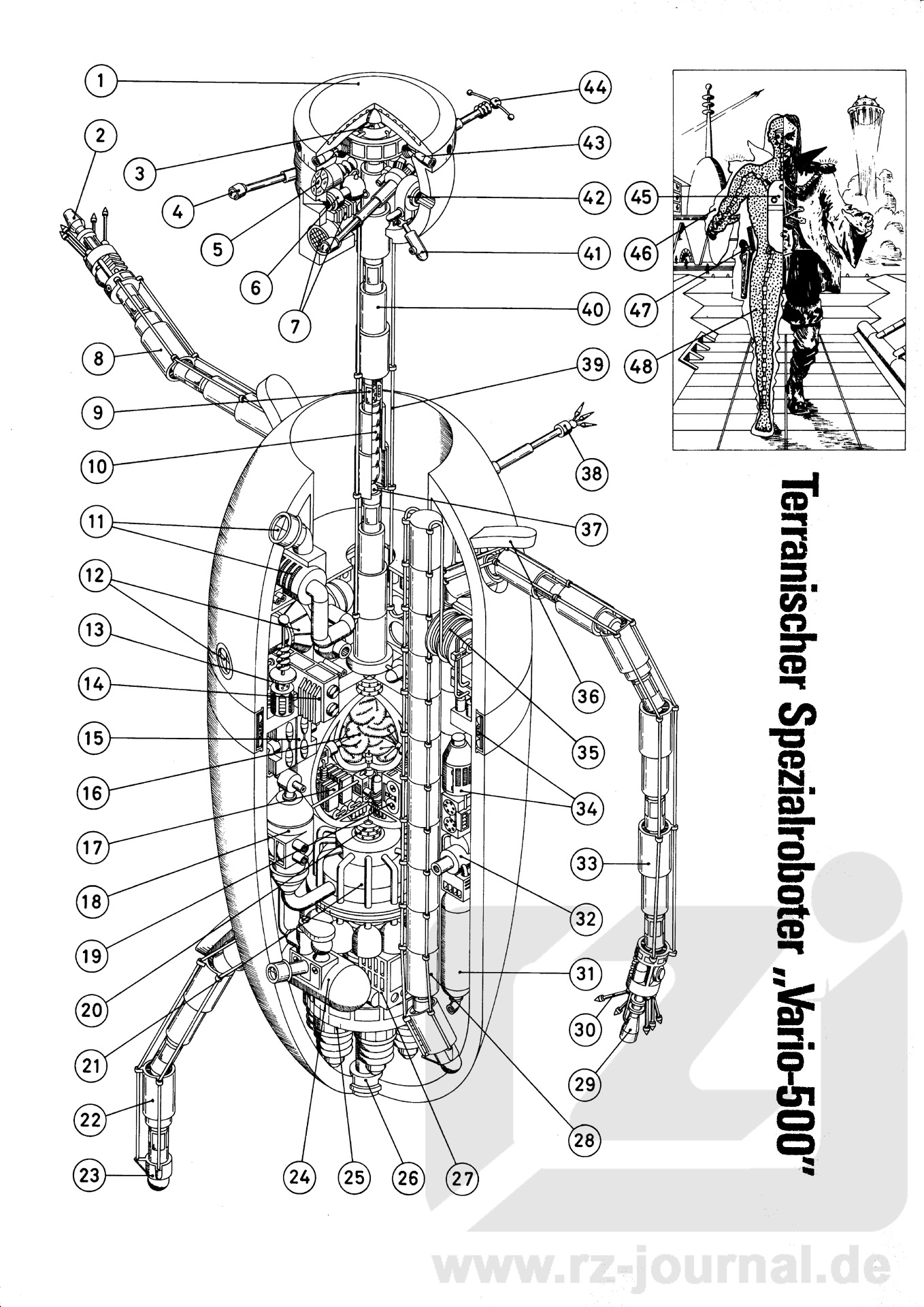 Allgemeines: Dieser Superroboter wird in erster Linie auf dem Planeten Olymp in der Maske des Freifahrerkaisers und Patriarchen Anson Argyris eingesetzt. Hülle und belastungsgefährdete Teile bestehen aus Atronital-Compositum. Der Grundkörper von Vario-500 ist eine eiförmige Konstruktion mit elliptischem Querschnitt; die Höhe beträgt 50 cm, die Breite 20 cm, der mittlere Durchmesser ebenfalls 20 cm. Die Enden sind abgerundet. Alle Innengeräte sind in siganesischem Mikrobauverfahren hergestellt. Das biopositronische Gehirn (egopositronischer und egobioplasmatischer Teil sind funktionsverbunden durch einen Bioponblock) des Roboters verbindet die Denkgeschwindigkeit einer hochwertigen Positronik mit dem intuitiven schöpferischen Denken und dem Individualbewußtsein einer organischen Intelligenz. Die ausfahrbaren Teleskopglieder können wahlweise durch einen Hydraulik- Funktionskreis odereinen Hochenergie-Feldsteuerungskreis bewegt werden. Dies ermöglicht dem Roboter die Kraftentwicklung eines Haluters und eine Höchstgeschwindigkeit von 100 km/h. Der ausfahrbare Ortungskopf enthält neben den technischen Entsprechungen menschlicher Sinnesorgane auch Ortungs- und Meßgeräte, die z.B. ein kleineres Raumschiff besitzt. Der Vario-500 verfügt über 48 Stimmen-Modulatorschalteinheiten, die es ermöglichen, seine Stimme der jeweiligen PVK-Maske anzupassen. Der Grundkörper enthält auch alle Aggregate zur Kreislaufregulierung, Sauerstoff- und Nährstoffversorgung, sowie Abfallbeseitigung seiner jeweiligen PVK-Maske. Das Eigengewicht des Roboters beträgt 52 kg. Die 48 verschiedenen Pseudo-Variablen- Kokonmasken sind biologisch lebende, labormäßig gezüchtete Gebilde, die auch in ihrem Innern voll einem menschlichen Körper nachgebildet sind. Der Vario-500 kann wahlweise in eine der Masken hineinschlüpfen, um durch diese Verkleidung Perry Rhodan und der Menschheit zu dienen. |