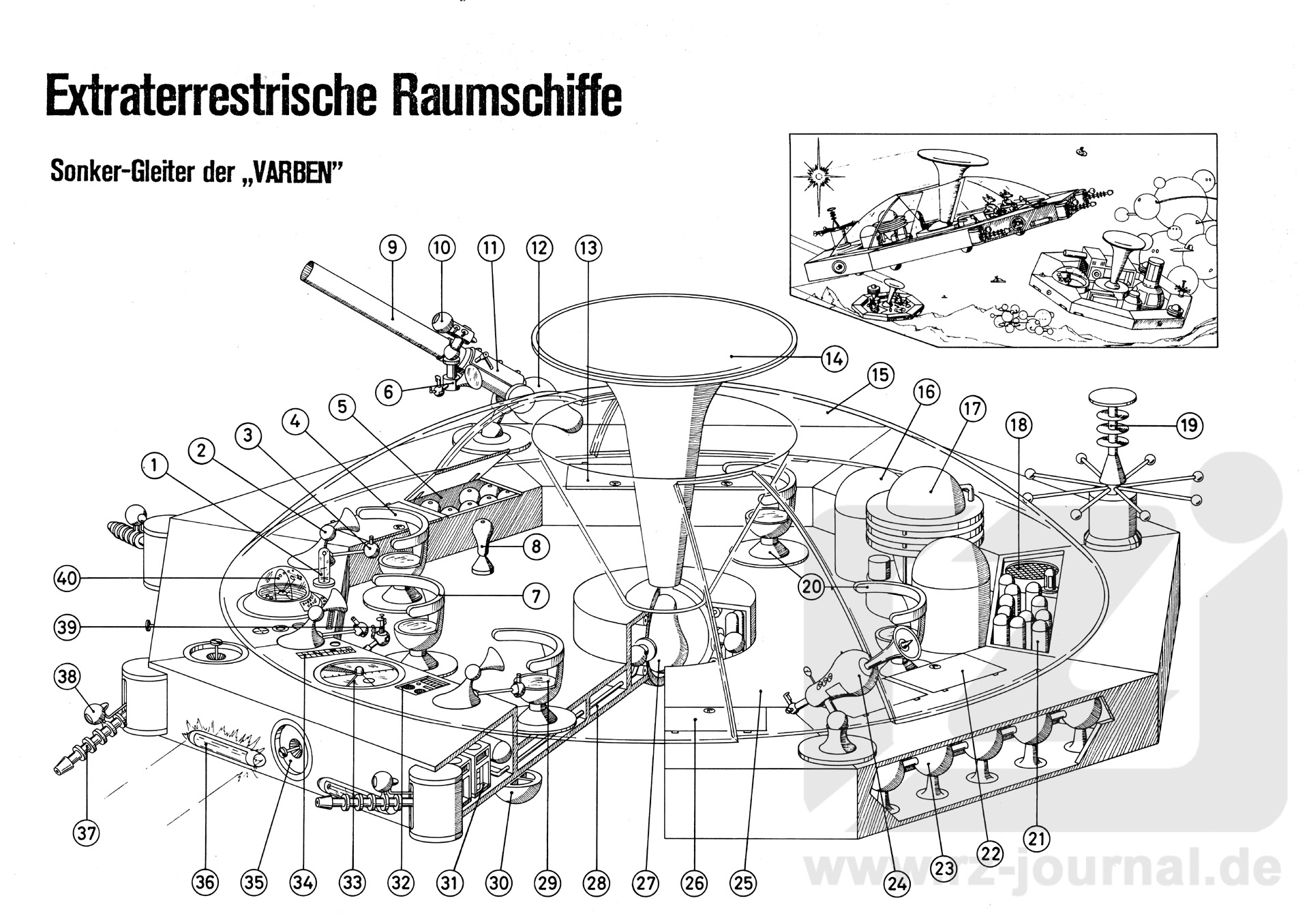 Allgemeines: Die Mentalität der Varben sowie die Art des Antriebs prägten die Ähnlichkeit des Aussehens ihrer Raumschiffe und Gleiter. Der Sonker-Gleiter gleicht einer flachen achteckigen Scheibe mit einem Durchmesser-Dickeverhältnis von 15:1. Außerdem haben sie an ihrer Oberseite einen schwenkbaren trichterförmigen Aufsatz, dessen Höhe und Außenranddurchmesser ¼ des Gleiterdurchmessers beträgt. Die „Gravo-Leimrute” fängt 5-D-Gravitationsenergie ein, um die Energie durch Verstärkeranlagen an der Unterseite der Rumpfhülle weiterzuleiten. Es entsteht ein blauleuchtendes Gravitationsfeld, das den Gleiter aufsteigen läßt. Durch veränderte Energiezufuhr in den 8 Segmenten des Rumpfes kann der Gleiter gut beschleunigen und sehr genau gesteuert werden. Die kleinsten Sonker-Gleiter haben einen Durchmesser von 5 m und können 4 Mann aufnehmen. Die größten haben einen Durchmesser von 25 m und werden als Lasten-Gleiter verwendet. Der gebräuchlichste Sonker-Gleiter hat 10 m Durchmesser und wird neben seiner Aufgabe als Passagier-Taxi und leichter Lasten-Gleiter auch als bewaffneter Polizei-Gleiter verwendet. Dieser Typ findet auch Verwendung als Forschungs- und Expeditions-Gleiter auf Fremdplaneten und wird in jedem Varben-Raumschiff von über. 100 m Durchmesser mitgeführt. |