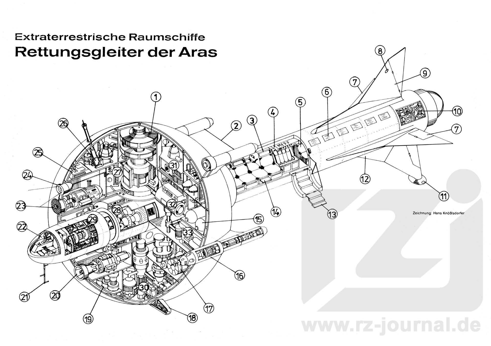 Allgemeines: An Bord von Ara-Kreuzern benutztes Rettungs- bzw. Transportraumschiff mit einer Aufnahmekapazität von 12 Mann und einem Piloten. Bei Feindeinsätzen können die drei Traktorstrahl Projektoren gegen Energiegeschütze ausgetauscht werden. Die Notsitze können ausgebaut und der so entstandene leere Raum als Laderaum benutzt werden. Technische Daten: Gesamtlänge 24 m; Rumpfdurchmesser 2,50 m; Kugeldurchmesser 10 m; einfach lichtschnell |