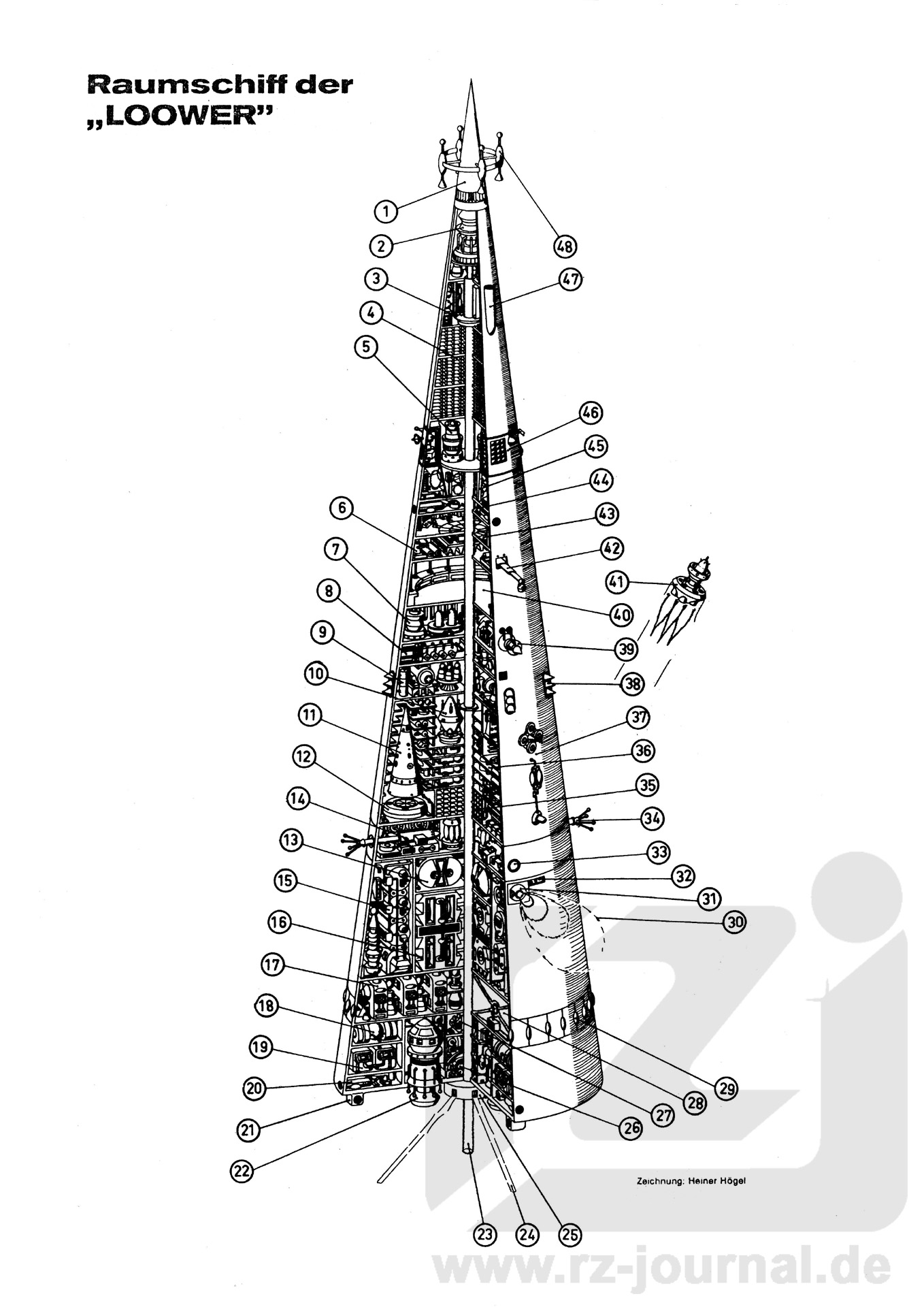 Allgemeines: Seit Jahrhunderttausenden bauen die Loower Raumschiffe und haben in dieser Zeit ihre Konstruktionen zu einer hohen Vollendung gebracht. All ihren Schiffen ist die relativ spitze Kegelform gemeinsam. Unterschiede existieren lediglich beim Längen-Breiten-Verhältnis. Während die sehr alten Einheiten ein Verhältnis des Heckdurchmessers zur Länge von 1:2,8 aufweisen, besitzen die modernsten Typen - aufgrund eines Verhältnisses von 1:4- eine langgestrecktere Form. Zur Energieversorgung wird der Hyperraum angezapft, wobei alle wichtigen Aggregate unabhängig von einer etwaigen zentralen Energiequelle sind. Als Fernantrieb dienen die Transmiterm-Rotatoren. Sie bauen ein hochwertiges Transmitterfeld um das Schiff auf, das durch den vorher aufgebauten Strukturriß-Einlaßsektor mit Nullfeld-Überschußabstrakten angereichert wird. Dadurch wird eine Transition ausgelöst, mit der eine Entfernung von maximal 5213 Lichtjahren überbrückt werden kann. Größere Strecken werden mittels einer vollautomatischen Transitions-Pulsation bewältigt. Dies gilt insbesondere für die Beiboote. Die Zeichnung stellt das größte und gleichzeitig modernste Raumschiff der Loower dar. Technische Daten: Länge 800 m; Heckdurchmesser 200 m; Schiffsmasse 9 000 0001; Maximalbeschleunigung 900 km/sec²=92 000 g; Besatzung 450 Mann. |