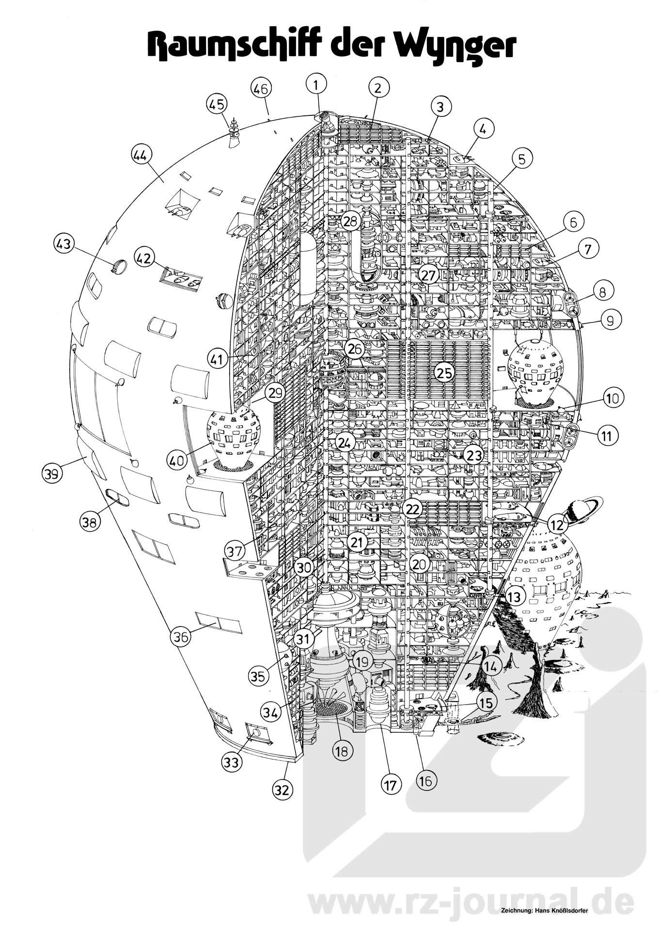 Allgemeines: Auf der Suche nach der PAN-THAU-RA gelangte Perry Rhodan in die Galaxis Algstogermaht. Dort traf er unter anderem auf das Volk der Wynger, welches von dem Roboter Laire mit Zuhilfenahme des Allesradglaubens jahrtausendelang nach seinem Willen manipuliert wurde. Auserwählte Wynger (Berufene) erhielten von Laire den Auftrag, nach dessen linkem Auge im Universum zu suchen. Das gezeigte Schiff stellt ein Raumschiff mittlerer Größe dar. Die größten Einheiten können eine Länge von 1200 m erreichen und besitzen noch einen zusätzlich angeflanschten Triebwerksring. Tropfenförmiges Raumschiff: Größtdurchmesser 500 m; Länge 600 m; Durchmesser am Heck 300 m; Beschleunigung: 600 km/sec2; Besatzung zirka 200 Mann. |