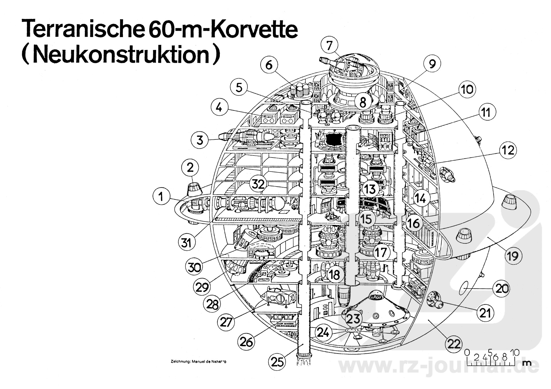 Allgemeines: Die 60 Meter durchmessende Korvette dient hauptsächlich als Beiboot und Überwachungsschiff für Planeten. Für Sonderzwecke ist das Schiff durch seine extrem großen Hangars ebenfalls geeignet. Die Besatzung besteht aus maximal 42 Mann. Durch leistungsstarke Impulstriebwerke erfährt der Raumer Beschleunigungen bis zu 1050 km/sec.2 Technische Daten: Abmessung: 60 Meter Durchmesser; Besatzung: 42 Mann; Beschleunigung: 1050 km/sec²; Beiboote: 1 „Space-Jet“ (14 Meter Durchmesser) 4 Rettungsraumer (10 Mann Besatzung). |