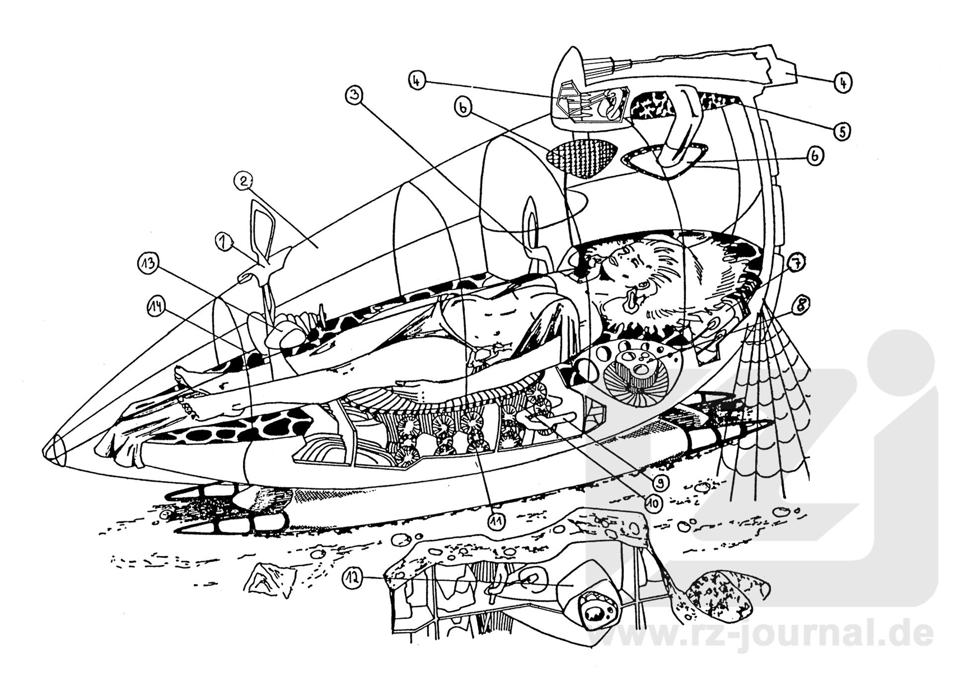 a) Allgemeines: Demeters Schrein wurde im Frühjahr 3586 von dem Archäologen Czek Matzlew auf Kreta entdeckt und kurz darauf von dem Mutanten Boyt Margor geraubt. Margor gelang es, Demeter zu erwecken. Der Schrein wurde dabei zerstört. Demeter ist eine Wyngerin und stammt aus der Galaxis Algstogermaht (Tschuschik). Etwa 8000 v. Chr. strandete sie auf der Suche nach Laires geraubtem Auge auf der Erde und wurde später von den Minoern als Göttin verehrt. Demeters Schrein beinhaltet hochkomplexe Überlebenssysteme für den Tiefschlaf. Neben einem mit psionischer Energie arbeitenden Zeitverlangsamungssystem sorgt eine auf normalenergetischem Niveau arbeitende Apparatur für die physiologische Betreuung der Schläferin. In einem Volumen von 20 Meter Länge, 5 Meter Breite und 3 Meter Höhe befindet sich unter dem Schrein ein überwiegend der Energieerzeugung dienender Gerätepark. Die gesamte Anlage ist mobil. |
