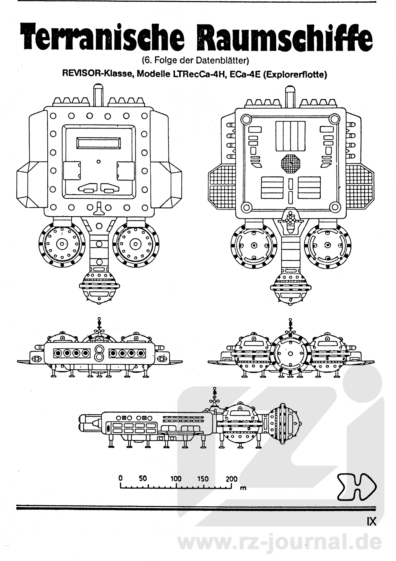 Leichter Tender und Beibootträger bzw. Explorer und Träger. Länge 400 m; Breite 300 m; Höhe 108 m; nutzbare Plattformfläche 173 m mal 173 m sowie 2mal 4050 m2 an den Seiten. Ins. 3,66 x 109 kg; 60-m-Raumer 1,13 x 108 kg; zwei 70-m-Raumer je 1,8 x108 kg; Tender allein 3,19 x 109 kg. Antrieb: 8 Impulstriebwerke zu je 3,477 1014 N Schub; Antigravantrieb; Linear-Überlichttriebwerk. Maximalbeschleunigung 760 kms-2 =77 472 g; Beschleunigung mit leichtem Kreuzer der STAATEN-Klasse auf der Plattform 650 kms-2 = 66259 g; Reichweite 1 450000 Lichtjahre. Alle drei Kugelraumer haben jeweils 4 Paralysatoren, der Tender selbst hat keine Bewaffnung; HÜ- und Paratronschirme (A0 = 1,1 x 1022 Wm -2; für alle Kugelraumer A0 = 1,4 x 1020 Wm-2) Insgesamt 490 Mann (87 Mann Schiffsführung; 96 Computerfachleute; 105 Fach- und Polytechniker für den Werftbetrieb und 118 für die Schiffsfunktionen; 15 Wissenschaftler; 69 Mann Beibootbesatzungen). 7 Einheitsrettungsboote; 17 Jäger der BEAVER-Klasse. |