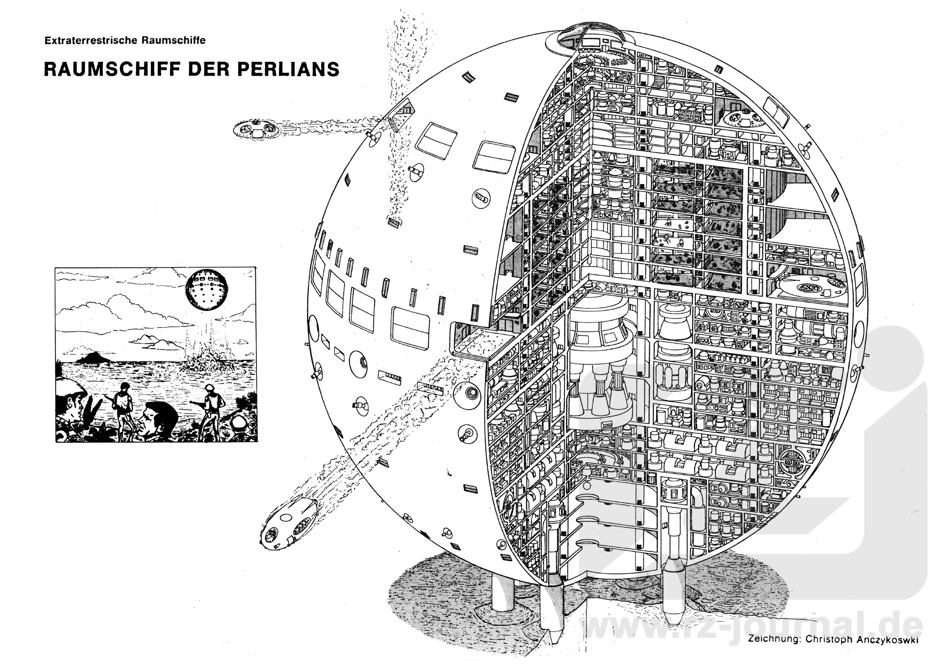 Allgemeines: Die ursprünglich aus der Galaxis M-87 stammenden Perlians stellten als sogenannte Drittkonditionierte das ranghöchste Hilfsvolk der Ulebs dar. Sie siedelten hauptsächlich auf Wasserwelten in der großen Magellanschen Wolke, wo sie zusammen mit den Hypnokri- stallen und den Generälen die dort ansässigen Gur- rads unterdrückten. In der Stirnhöhle jedes einzelnen Perlians befand sich ein ca. 10 cm durchmessender Parasymbiont, dessen hypnosuggestiver Einfluß seine absolute Loyalität gegen die Ulebs gewährleistete. Zusätzlich ermöglichte er es dem Träger, eine Zehntelsekunde in die Zukunft zu sehen, was ihm bei den Terra- nern die Bezeichnung „Zeitauge“ eintrug. Die Perlians verfügen über eine kombinierte Lungen- und Kiemenatmung und sind somit eine der wenigen Rassen aus dem maritimen Lebensraum, die die Raumfahrt entwickelt haben. Entsprechend der amphibischen Lebensweise zeigen ihre Raumschiffe besondere Kontruktionsmerkmale. Die untere Schiffshälfte ist fast ausschließlich den Maschinenanlagen und der Energieversorgung Vorbehalten, während sich im oberen Teil die wichtigsten Steuerzentralen, die Beiboothangars und die Wohnsektionen einschließlich der Lebenserhaltungssysteme befinden. Die Wohnsektionen teilen sich in eine Reihe von Trockenräume und 252 aquarienähnliche Wassertanks, in denen sich ähnlich den Solarien auf terranischen Raumschiffen komplette Unterwasserlandschaften mit vollständiger Flora und Fauna befinden. Außer den Maschinenhallen können sämtliche Schiffsräume nach Bedarf geflutet bzw. leergepumpt werden. Für diesen Zweck steht ein aus 52 Großtanks bestehendes Wasser-Reservoir zur Verfügung. Der Antrieb erfolgt durch 12 sogenannte INTAB- Triebwerke, die mit intermittierenden 5-D-lmpulsfel- dern arbeiten. Diese treffen mit einer Frequenz von 50 Einheiten pro Sekunde auf die energetische Struktur des Normalraums und rufen dort einen überaus starken Abstoßeffekt hervor. Da sich diese Antriebsart für Atmosphären- und Unterwassermanöver nur bedingt eignet, verfügt das Schiff noch über eine Reihe von Staustrahltriebwerken, die sowohl Gase als auch Flüssigkeiten als Medium benutzen können. Die Hauptbewaffnung besteht aus Intervallkanonen, die die Triebwerks-Impulsfelder extrem verstärken und fokussieren, um damit das Ziel zu zerstören. Während des Fluges ist das Schiff meistens in ein paratronähnli- ches Energiefeld gehüllt, das ihm die Gestalt einer konturlosen, rubinrot leuchtenden Kugel gibt, die unablässig leicht vibriert. Technische Daten: Durchmesser: 250 m; Beschleunigung: max. 800 km/sec²; dimetransähnliches Hyperraumtriebwerk; Besatzung: 600 - 700 Perlians |