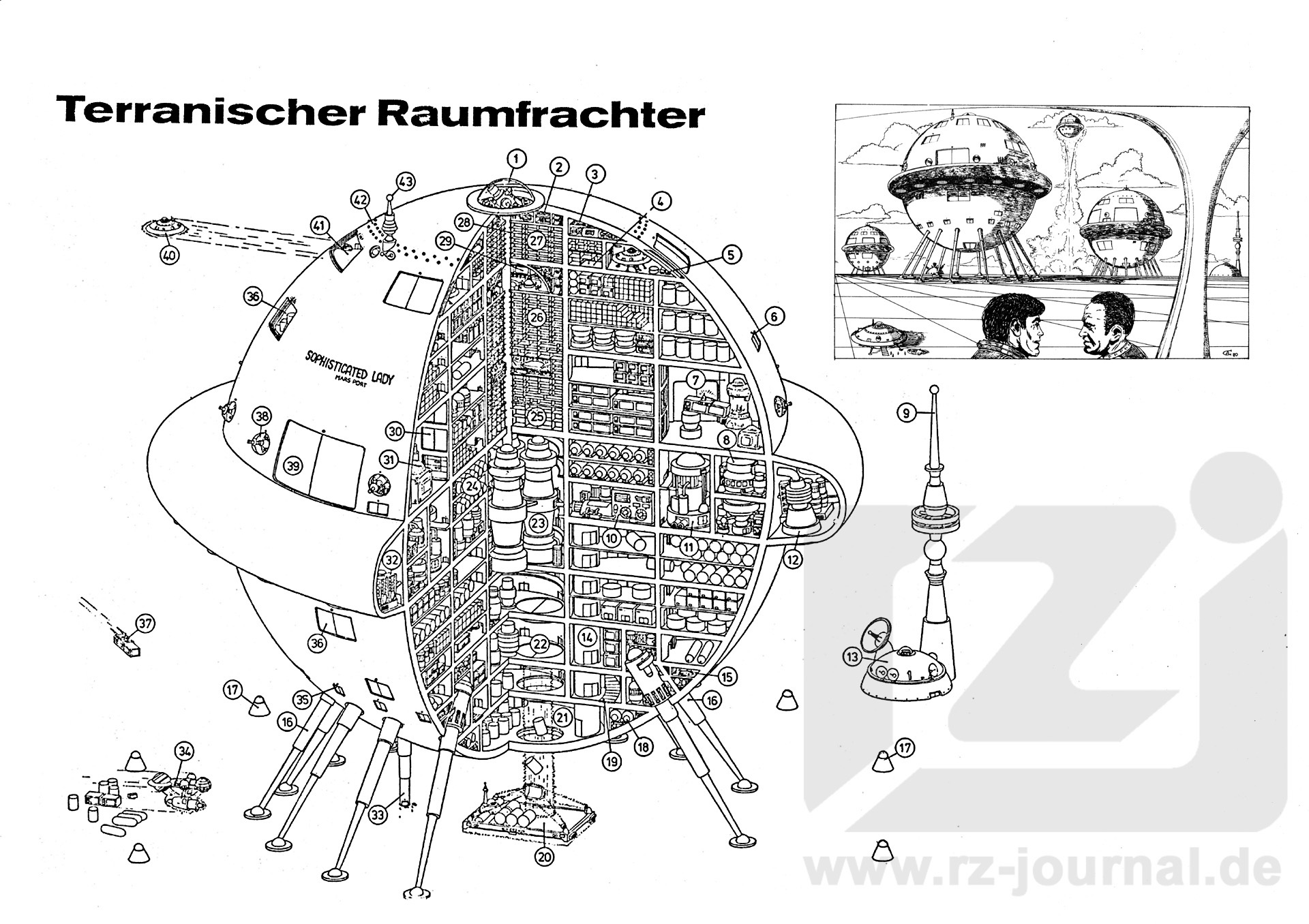 Allgemeines: Der Begriff „Raumfrachter“ umschreibt eine so umfangreiche Palette von Raumschifftypen und -modellen, daß er bestenfalls eine grobschlächtige Einteilung abgeben kann. Vom 80 m durchmessenden Tramp- bis zum 1500 m durchmessenden Großraumfrachter existieren unzählige Versionen, für die zudem keinerlei Größen-Normierung wie z.B. für die Einheiten der ehemaligen Solaren Flotte gelten. Zur Blütezeit des Solaren Imperiums waren alleine im Sol-System annähernd 200 000 Frachter aller Kategorien registriert. Dazu kamen noch eine weitaus größere Anzahl von Schiffen der Kolonialwelten und der Freifahrer vom Planeten Olymp. Oft legten sich auch Springer-Patriarchen aus Prestige-Gründen ein oder zwei dieser Schiffe für ihre Handelsflotten zu. Die äußere Form der Frachter ist wie bei allen größeren terranischen Raumschiffen die Kugel mit ihrem typischen Ringwulst und zeugt so deutlich von dem arkonidischen Vorbild. Die Innenkonstruktion unterscheidet sich jedoch teilweise erheblich von denen der Forschungs- und Kampfeinheiten. Meistens wird die „Scheibenbauweise“ verwendet, d.h. in der Mitte des Schiffes befindet sich ein scheibenförmiges Maschinendeck in Ringwulstdicke, worin sich alle wichtigen Triebwerke und Aggregate befinden. Die Kommandozentrale ist aus dem Schiffszentrum in die Nähe der oberen Polkuppel verrückt, wo sich meistens auch ein zweiter Komplex von Decks mit den Kabinen, Beiboothangars etc. befindet. Natürlich existieren auch zahlreiche andere Bauweisen und -methoden, besonders seit Beendigung der Laren-Herrschaft arbeitet man aus ökonomischen Gründen innerhalb der GAVÖK an neuen Modell-Programmen, deren Schiffsnormen für Frachttransporte geeigneter sind als die alte Kugelform. Das hier gewählte Beispiel zeigt einen mittelgroßen Stückgut-Frachter für die Kolonialwelt-Routen. Neben den Laderäumen verfügt er über einen Kabinenkomplex, in dem er über 2100 Kolonisten bzw. Passagiere mitbefördern kann. Die Ladekapazität entspricht ca. 8 Millionen Tonnen. Technische Daten: Durchmesser: 500 m; Beschleunigung: max. 460 km/sec2; Reichweite: 1 400 000 Lichtjahre; Besatzung: ca. 20 Mann Schiffsführung und 80 Mann Passagierbetreuung und Service. |