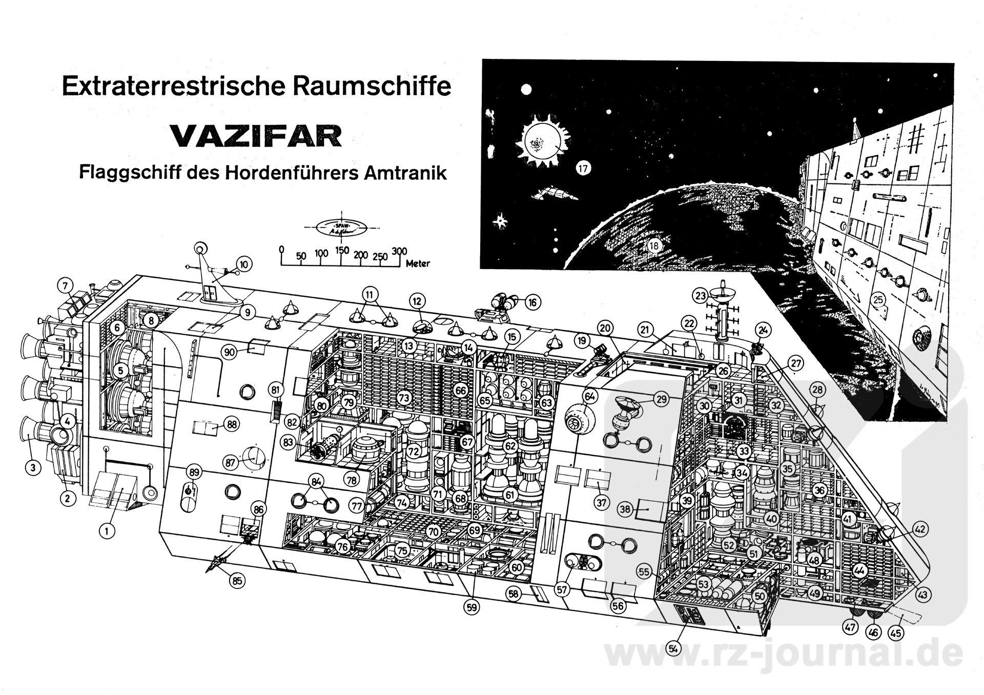Allgemeines: Die VAZIFAR ist das Schiff des Hordenführers Amtranik, der einem Hauptvolk der Horden von Garbesch angehörte, den Laboris. Amtranik war einer der Hauptgegner des Armadan von Harpoon, und seine Armee wurde vor 1,2 Millionen Jahren als einzige Hordentruppe nicht aus der Milchstraße vertrieben. Amtranik versteckte sich, die Laboris und die VAZIFAR im östlichen Zentrumsgebiet der Milchstraße im Sonnensystem der roten Sonne Wahiat Zent, auf dem Planeten Arpa Chai („verstecktes Nest“). Arpa Chai ist marsgroß und an und für sich lebensfeindlich. Die dünne Atmosphäre gibt nur der kargen Vegetation eine Überlebenschance. In der Südpolregion liegt ein hufeisenförmiges Ge- birgsmassiv, in dem der achthöchste Berg die Hauptrolle spielt. In ihm baute Amtranik seine Anlage so aus, daß selbst die mächtige VAZIFAR darin versteckt werden konnte. Die Station fiel später der totalen Zerstörung zum Opfer! Abmessungen: Gesamtlänge: ca. 2 400 Meter; Totalbreite: ca. 800 Meter; Höhe ohne Topdeckring: 540 Meter; Besatzung: 6 470 Laboris; Beibootbesatzung 1250 Laboris; Beschleunigung: 579 km/s²; Masse: 6,5 x 108t = 650 Millionen Tonnen; Bewaffnung: diverse Hochenergiegeschütze sowie Torpedos und Kampfbeiboote; Beiboote: diverse Beiboote aller Arten. |