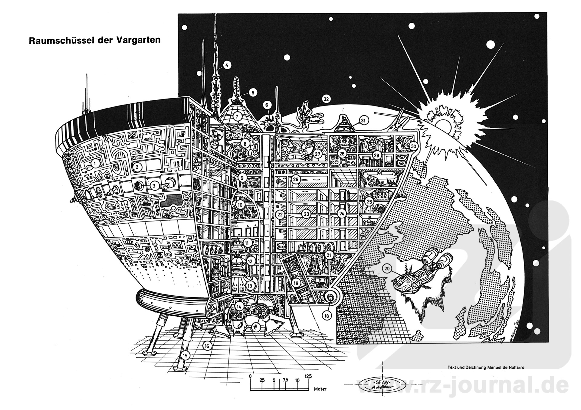 Allgemeines: Dieses bei den Vargarten als Allzweckschiff benutzte Kleinraumschiff ist nur für stellare Raumflüge gedacht. Das Schiff existiert in Größenklassen von 30 - 120 Meter, wobei die 120 Meter durchmessenden Raumschiffe gerade noch für Planetenlandungen geeignet sind. Größere Schiffseinheiten sind Nur- Raumschiffe, die nicht landefähig sind. Privaten Eigentümern kommt dieses, hauptsächlich als Frachtschiff benutzte Raumfahrzeug sehr gelegen, da es einfach, billig und solide gebaut ist. Kontakt mit den Vargarten bekam zum erstenmal Alaska Saedelaere, der mit der Lichtzelle Ganerc-Callibsos die Vargarten beim Energiewalfang beobachtete.