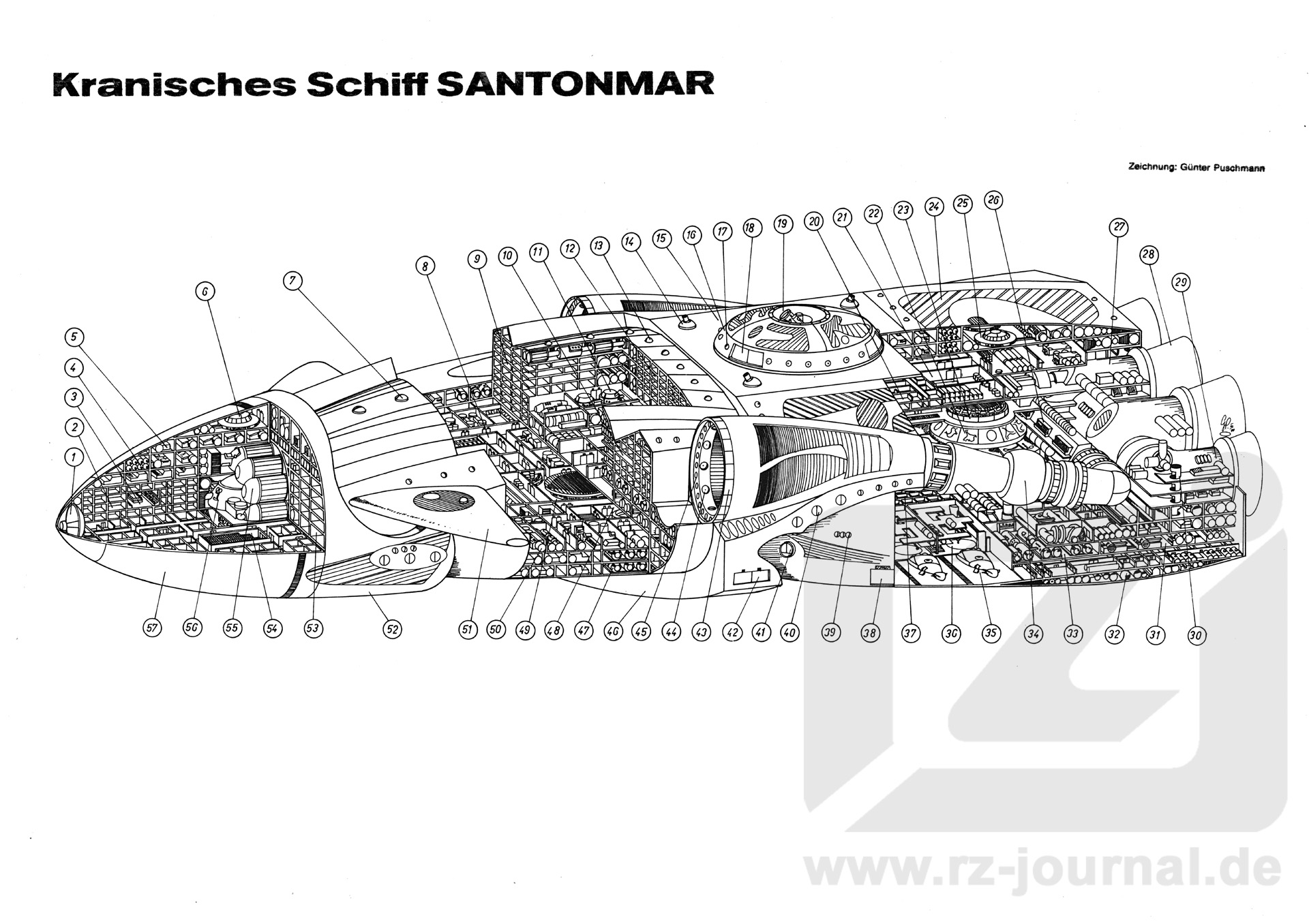 Allgemeines: Dieses Schiff gehört zur Flotte des Nestes der 8. Flotte. Die Bauweise der kranischen Schiffe ist großteils gleich. Die SANTONMAR wurde jedoch verändert gebaut, um an ihr Neuerungen auszuprobieren. Neu ist unter anderem die Größe und Anbringung der Bremstriebwerke sowie der Landefeldprojektor. Das Schiff wurde im Jahr 424 NGZ im Sektor Juumarq der Galaxis Vayquost von Aychartan-Piraten vernichtet. Allgemeines: Länge: 800 m Heckbreite: 400 m durchschnittliche Höhe: 100 m |