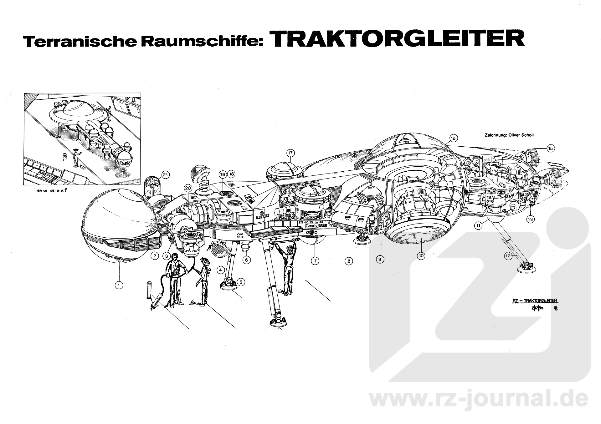 Allgemeines: Bezeichnung: ETS-VC; SpLC Sol. Nr. 1748 „Charly“ Energetic transport System for variable cargo; Spaceport Luna City - Solar System. Fahrzeug Nr. 1748, „Charly“. Allgemeines: Transportfahrzeug für schwere Lasten variabler Form bis zu 15001 Masse. Die hohe Lastkapazität wird durch einen Antigravzonenprojektor zur Aufhebung von Gewichten bis zu Fg = 1,4715 x 107N erreicht. Das Manövrieren der Masse erfolgt durch Fesselfelder und/oder Traktorstrahler für Leistungen bis zu 1,92 x 108W (Fc = 24 x 105N; a = 1,6 m/s2) (Gesamtleistung) Aufgabe: Lastentransport auf Raumhäfen und in Industriebetrieben — Bergungsfahrzeug und Trägerplattform für Schirmfeldprojektoren. Transportausrüstung: Antigravzonenprojektor, Traktorstrahler (2 - 4), Fesselfeldprojektoren (2 - 4), Prallschirmzonenprojektor, Mechanische Verbindungstrossen, Magnethalter an den Landetellern. Technische Daten: Länge: 18,28 m; Standhöhe über alles: 5,71 m; Masse (Leer): 15,00 t; Höchstgeschwindigkeit: 300,0 km/h; max. Last: 1500,00 t |