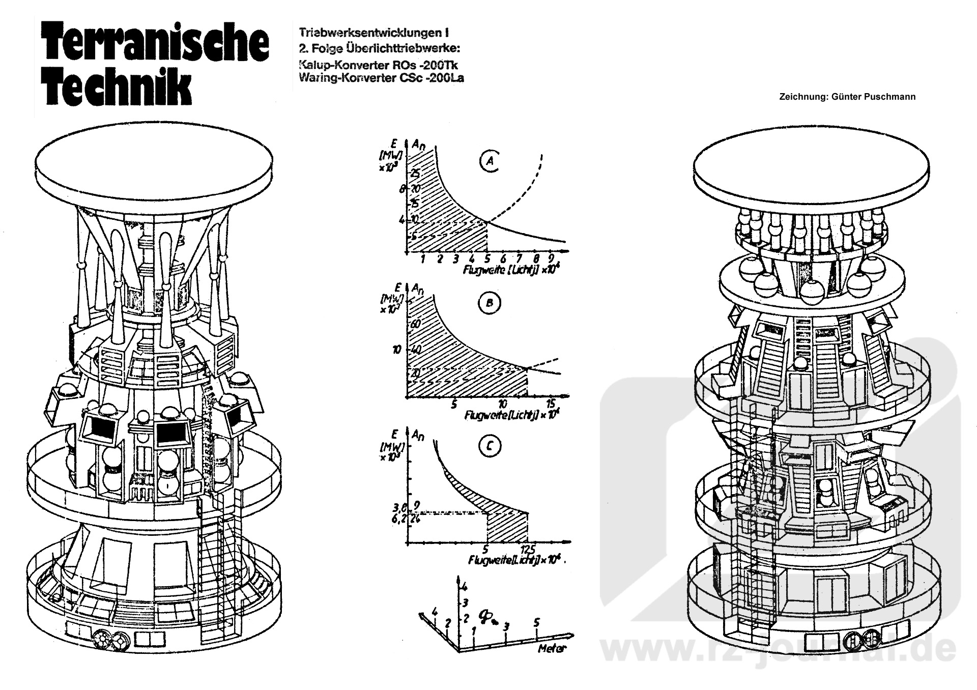 Zeichnungen: Kalup-Konverter: Die linke Zeichnung stellt einen normalen Serienbau des Kalups für 200-Meter-Kreuzer des Jahres 3436 dar. Es ist der letzte Serienbau dieses Konverters, da er vom Waring-Konverter verdrängt wurde. Das Gerät kann grob in drei Teile geteilt werden: den Sockel mit den Energieumformern den Erzeuger des Kompensatorfeldes und den Teil der Hyperschaltkreise, die normalerweise noch weiter verkleidet sind. Die maximale Reichweite beträgt zusammengerechnet etwa 370000 Lichtjahre. Danach hat der Konverter nur noch Schrottwert. Waring-Konverter: Dies ist ein Serienbau aus dem Jahre 396 NGZ, an dem sich nach neuesten Erkenntnissen kaum noch etwas verbessern ließe. Die grundlegende Verbesserung in Bezug auf den Kalup ist die Trennung des eigentlichen Konverters in zwei eigenständige Teile, welche eine Optimierung des Kompensationsfeldes ermöglichen und die Lebensdauer unheimlich verlängern. Die maximale Reichweite dieses Konverters liegt bei 1,9 Millionen Lichtjahren. Diagramme: A) Leistungskurven des Kalup-Konverters. Die durchgezogene Kurve zeigt, wann bei welcher Anzahl von Rügen über eine konstante Zahl von Lichtjahren die ersten Materialermüdungserscheinungen derart auftreten, daß eine Reparatur notwendig wird. Die gestrichelte Kurve zeigt den stetig wachsenden Energieverbrauch bei größer werdenden Flugweiten. B) Leistungskurven des Waring-Konverters. C) Vergleich von A und B. Bemerkungen: Die Daten beziehen sich auf die normalen Triebwerksausführungen dieser Zeit. Natürlich gab es auch' Sonder- und Spezialanfertigungen, welche hier jedoch nicht berücksichtigt werden können. Außerdem wurde davon ausgegangen, daß das Schiff mit einem konstanten Überlichtfaktor von 60 Millionen fliegt |