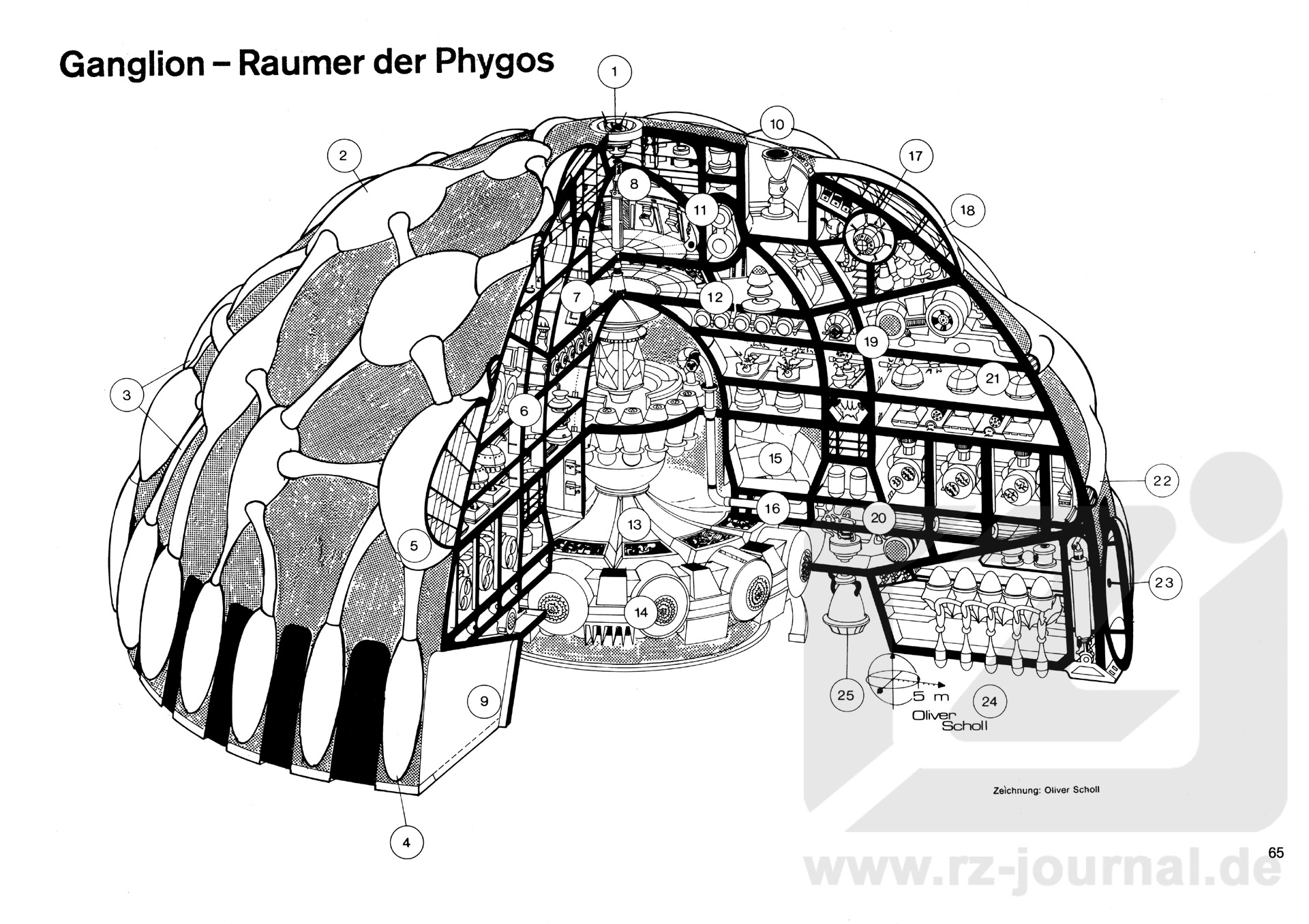 Allgemeines: Das Volk der Phygos gehört in seiner Gesamtheit zur Mächtigkeitsballung von Seth-Apophis und wird von ihr beherrscht. Die tonnenförmigen, 90 cm hohen Phygos bevorzugen im Raumschiffbau die dargestellte Form einer Halbkugel mit ca. 200 m Durchmesser, wobei die Wölbung den Bug und die Schnittfläche das Heck darstellt. Auf der Oberfläche dieser Halbkugel befindet sich ein Geflecht aus linsenförmigen, mit Gangsystemen verbundenen Aufenthaltskuppeln, die optisch den Eindruck einer Ansammlung von Nervenzellen erwecken (Ganglion). In diesem Netz findet das eigentliche Bordleben statt, in diesen Linsen befinden sich auch die Kontroll- und Schiffssteuerungseinrichtungen. Ein Übergang ins Schiffsinnere ist während des Fluges nicht möglich; die sich in der Halbkugel befindenden Triebwerksanlagen und Gerätschaften sind also nur in den großen Dockanlagen der phygischen Raumhäfen erreichbar. Die untere Hälfte des Schiffskörpers ist zahnradförmig ausgebildet. In den Lücken des Zahnrades sind Lastencontainer eingehängt; die Zähne beinhalten die Fahrwerksanlagen (18 inges.) und Schutzschirmprojektoren. Der Ring um die imaginäre Zahnradachse wird von den 18 versenkt angebrachten Haupttriebwerken gebildet, während sich im Achsen- und Schiffszentrum die Überlichttransitionseinheiten befinden. Technische Daten: Ø: 200 m; Beschleunigung: 400 km/s²; Besatzung: zwischen 25 und 250 Phygos, je nach Auftrag. Beiboote werden auf der Schiffshülle zwischen den Linsen magnetisch oder feldenergetisch verankert. |