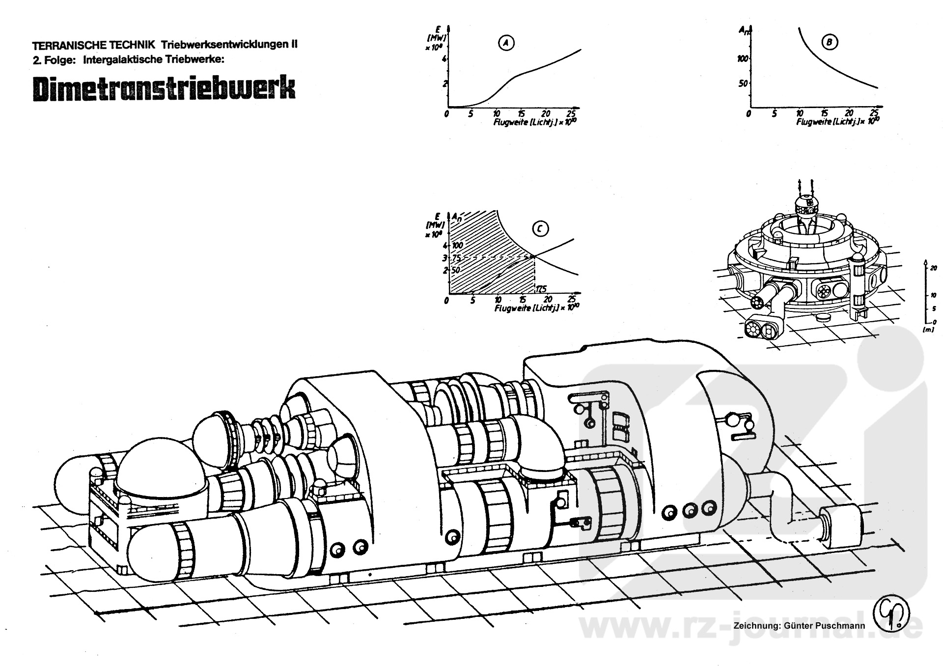 Bemerkungen: Die Zeichnung zeigt einmal die Sextagoniumbank mit dem von Antigravfeldern gehaltenen frei schwebenden Pralitzschen Wandeltaster und einen der acht Dakkarfelderzeuger. Die gesamte Anlage ist auf dem Hauptmaschinendeck angelegt. Die Sextagoniumbank liegt zentral in der Mitte, und an sie sind die acht gleichmäßig verteilten Felderzeuger angeschlossen. Dieses hochkompakte Triebwerk ist die letzte Neuerung in den Serienbaureihen für Triebwerke vor seinem Nachfolger, dem Septim-Parallelspur-Triebwerk. Es ist aus dem Jahre 3512 für Raumer der Galaxis-Klasse. Außerdem wurde ein konstanter Überlichtfaktor von einer dreiviertel billionenfachen Lichtgeschwindigkeit zugrunde gelegt. Sämtliche Daten beziehen sich auf die Serientriebwerke dieser Zeit. Sonder- und Spezialausführungen wurden nicht berücksichtigt. |