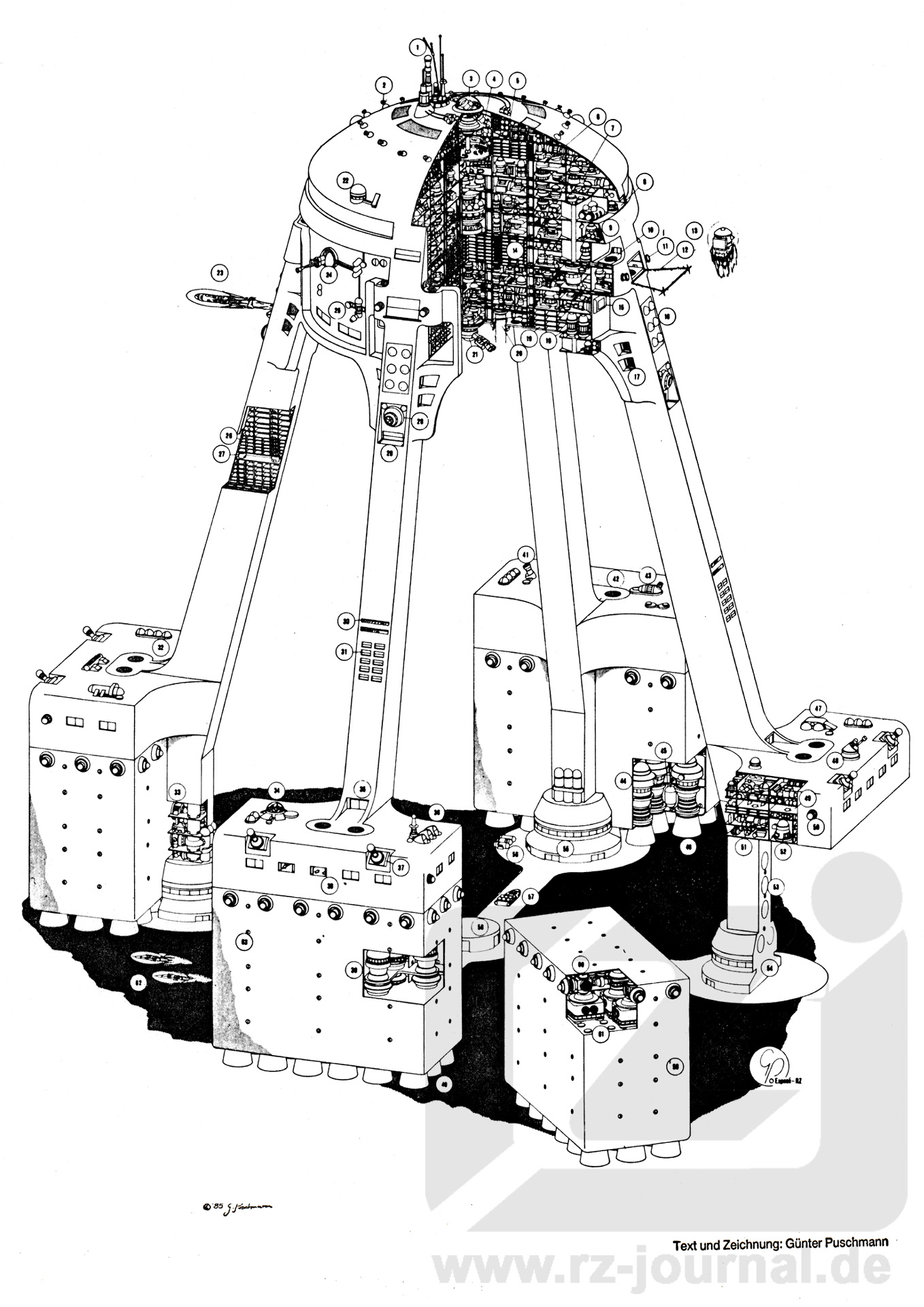 Allgemeines: Am 15. März 426 NGZ kam Perry Rhodan mit der „Galaktischen Flotte“ zum erstenmal in Kontakt mit der Endlosen Armada. Diese Ansammlung von vielen Millionen Raumschiffen verschiedener Völker wird in viele tausend unterschiedlich starke Armadaeinheiten untergliedert, die in Bereichen und Abschnitten operieren. So befindet sich die Armadaeinheit 176 im Bereich hintere Mitte, Flankenabschnitt 34. Die cygrische Armadaeinheit besteht aus 50 000 Einheiten. Neuerbaut und gewartet werden sie in zwei gewaltigen Grydo-Werften, die sie mit sich führen. Außerdem führt man, wie jede andere Einheit auch, Schlafbojen mit sich. Die Zeichnung zeigt das auf einer Grydo-Werft gelandete Flaggschiff BOKRYL. Allgemeines: Gesamtlänge: 1500 m Untere Gesamtbreite: 1500 m Durchmesser des Kessels: 600 m Höhe des Kessels mit Bugaufwölbung: 400 m Breite der Verbindungsstreben: 80 m Besatzung: 2500 Cygriden Beschleunigung: ca. 600 km/s2 |