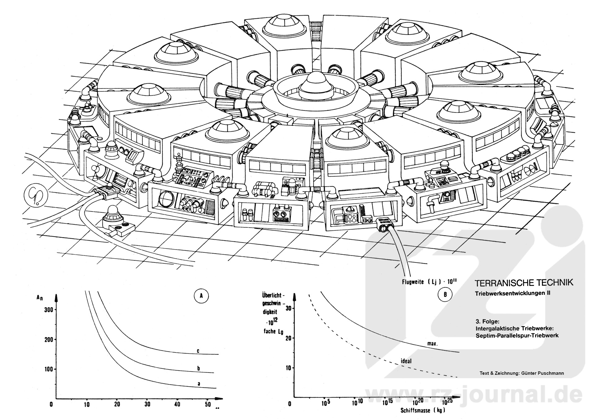 Die terranische Wissenschaft erlebte während der Jahre 3680 bis 3587 einen erneuten Aufschwung. Das Erbe der Konzilsherrschaft wurde ausgeweitet, und viele zur Zeit der Larendiktatur gewonnenen Erkenntnisse wurden verarbeitet und in Erfindungen umgesetzt. Das neue Genie-Payne Hamiller brachte zusätzlich neue Denkanstöße. Ein frühes Resultat dieser neuen Wissenschaft ist das Septim-Parallelspur-Triebwerk, das seine Existenz-allerdings mehr einem Zufall als einer konsequenten Forschung verdankt. Den Anstoß zu dieser Zufallserfindung machte - wie auch anders? - Geoffry Abel Waringer. Wie bekannt, hielten sich Professor R. Bull und Roi Danton gegen Anfang des Jahres 3584 auf Luna auf, um dort die Terrapatrouille zu unterstützen und Vorbereitungen zur Reaktivierung NATHANS zu treffen. Während dieser Zeit gelangte Waringer bei einer Routineüberprüfung in ein altes aphilisches Forschungslabor, in dem mit Sextagonium experimentiert wurde. Es ging dabei um eine sechsdimensionale Instabilität beim Transformieren von erhöhten Energiemengen. Waringer beschäftigte sich ein wenig mit diesem Problem und erkannte bald einige neue Aspekte, die auf eine siebendimensionale Aktivität des Minerals schließen ließen, wenn man es mit einer bestimmten hyperfrequenten Quantenstrahlung übersättigte. Leider konnte sich Waringer wegen des Projekts Heimat II nicht weiter damit beschäftigen, aber er überließ es einem von NATHANS Spezialinkubatoren, sich weiter damit zu beschäftigen und es auf .technische Anwendungen hin zu untersuchen. Diese Sache geriet dann in Vergessenheit, bis im Januar 3586 die BASIS von Nathan erbaut wurde. NATHAN hatte die, 7-D-Aktiva konsequent erforschen lassen und das Prinzip eines neuen Fernflugtriebwerkes erkannt. Er ließ einige Prototypen erbauen und praktisch mit Robottendern erproben. Schließlich fertigte die Biopositronik ein Triebwerk dieses neuen Typs für die BASIS an und ließ es nach Überprüfung einbauen. Aber auch dieses Triebwerk wurde wieder von einer Neuerung abgelöst. Das während des Jahres 300 NGZ entstehende METAGRAV-Triebvverk löste sowohl das Septim-Parallelspur-Triebwerk als auch die normalen Linear- und Impulstriebwerke ab. Funktionsweise: Wie beim Dimesextatriebwerk bewegt sich ein mit diesem Triebwerk ausgerüstetes Schiff durch eine Halbraumzone zwischen dem Dimensionen. Die Sextagoniumbank des Dimesextatriebwerkes schirmt das Schiff gegen alle Einflüsse des 4- bis 6dimensionalen Raumes ab. Durch die abgesprochenen 7-D-Aktivitäten und geeignete Zusatzaggregate läßt sich nun auch eine Abschirmung der 7-D Einflüsse erreichen und somit auch eine Fortbewegung im Halbraum zwischen der 8. und 7. Dimension. Kernstück des neuen Triebwerks ist der Hochenergietransformator mit dem modifizierten Sextagonium. Kennlinien: A) Das erste Kennlinienfeld des Septim-Parallelspur-Triebwerks zeigt, bei wie vielen Flügen über eine konstante Anzahl von Lichtjahren die ersten Materialermüdungserscheinungen auftreten, so daß umfangreich Reparaturen notwendig werden. Da der Energieparameter durch die fortgeschrittene Technik (Nugas, Hypertrop) nicht mehr relevant für die Wirtschaftlichkeit des Triebwerkes ist, kann man diesem Triebwerk ziemlich unbegrenzt Energie zuführen, um eine Optimierung des Abschirmungsfeldes und somit eine höhere Reisegeschwindigkeit zu erreichen. Allerdings führt diese erhöhte Energiezufuhr auch logischerweise zu einem höheren Materialverschleiß. b) ist die Kennlinie bei einer Leistungszuführung von drei Milliarden Megawatt und eine erreichte Reisegeschwindigkeit von max. 25billionenfacher Lichtgeschwindigkeit Vorausgesetzt wurde hier eine konstante Masse von ca. 1010 kg. Dies ist auch die Hauptkennlinie, da dieses Triebwerk meist bei dieser Leistung betrieben wird, da dies eine relativ hohe Reisegeschwindigkeit bei relativ kleinem Verschleiß bringt. a) ist die Kennlinie bei P - 6 Milliarden MW b) bei P -1,8 Milliarden MW.