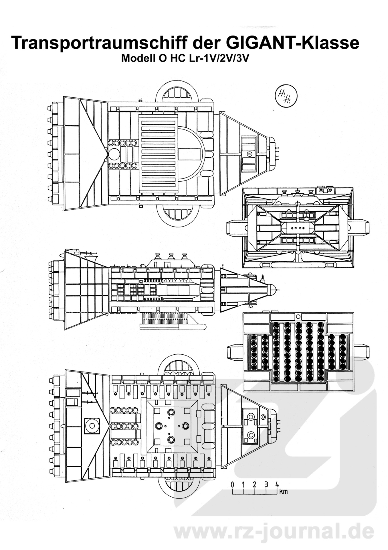 Kategorie: Überlichtschnelles schweres Frachtraumschiff mit großer Reichweite Abmessungen: Länge 20400 m; Gesamtbreite 12800 m; größte Höhe 7000 m Masse: 9,6x1018 t (leer) Antrieb: 37 Protonenstrahltriebwerke (2 Schubdüsen pro Triebwerk) mit je 1,7 x 10'8 N Schub; Antigravtriebwerk; Lineartriebwerk (Modell O HC Lr-2V: Transitionstriebwerk; Schubtriebwerke wie Modell O HC Lr-1V; Modell O Hc Lr-3V: Metagravtriebwerk) Leistungen: Beschleunigung: 65 km/s² (6626 g); Reichweite: 6 Millionen Lichtjahre (O HC Lr-2V: pro Transitionssprung max. 7500 Lichtjahre; O HC Lr-3V: unbegrenzt) |