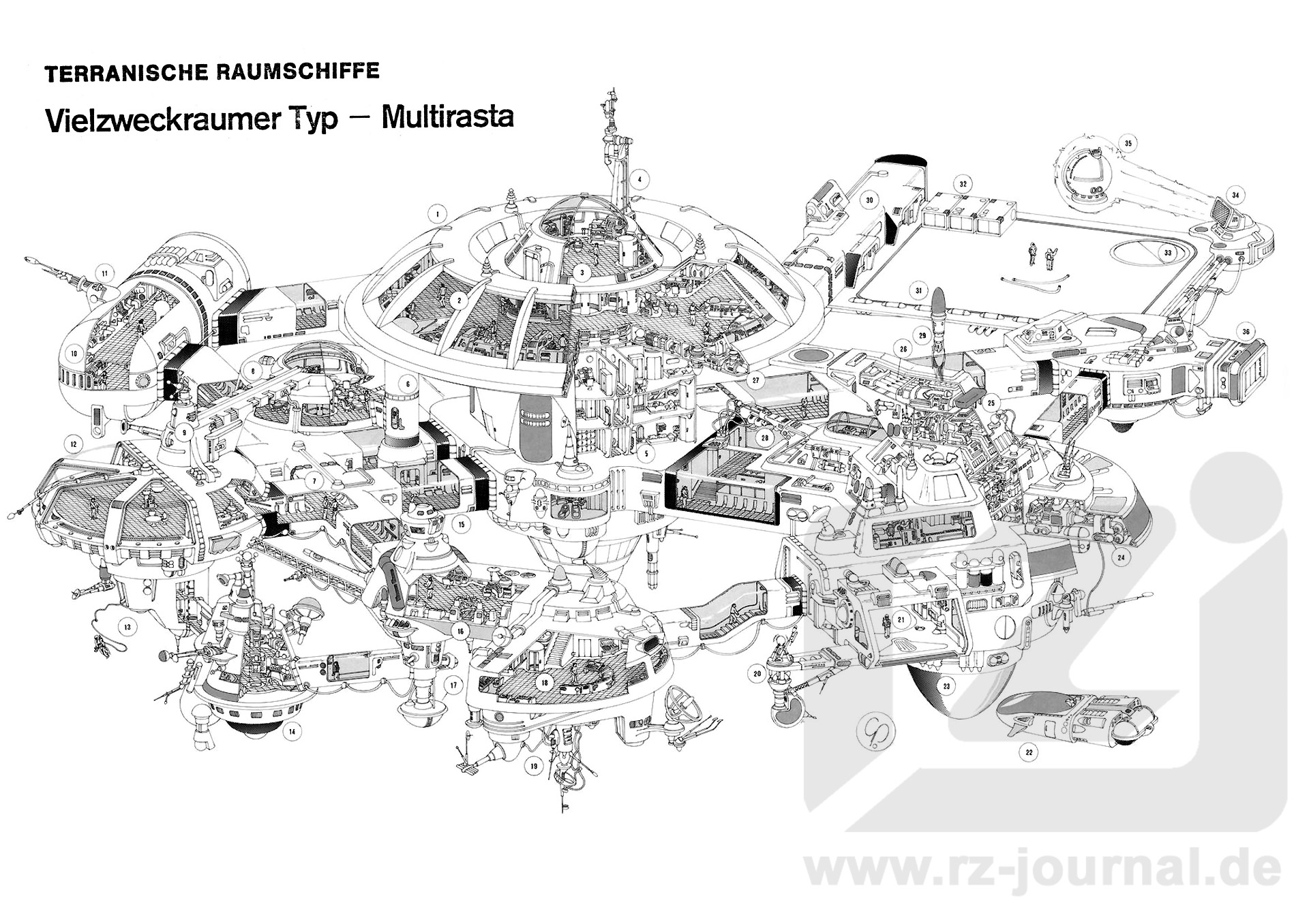 Allgemeines: Der Typ Multirasta (multiple Raumstation) entstand erstmals als Prototyp im Jahre 426 NGZ in einer lunaren Werft. Das Prinzip, das man hiermit verwirklichte, war einen Raumer zu schaffen, der fast sämtliche Aufgabengebiete abdecken kann. Der Konstrukteur war hierbei vollkommen frei von statischen Bedingungen, die dieser Raumschiffstyp erfüllen mußte, da sich das Raumschiff durch den neuen Antrieb (Metagrav) ständig im freien Fall bewegte und somit Bauformen und Aussehen keine Grenzen gesetzt wurde. Ebenso fielen dadurch übergroße Andruckabsorber weg. Dieser Vielzweckraumer kann ebenso als Forschungs-, Aufklärungs- oder leichter Frachtraumer verwendet werden, wie auch als Orbitalstation über Planeten oder als Hyperfunkrelaisstation im interstellaren Raum.
