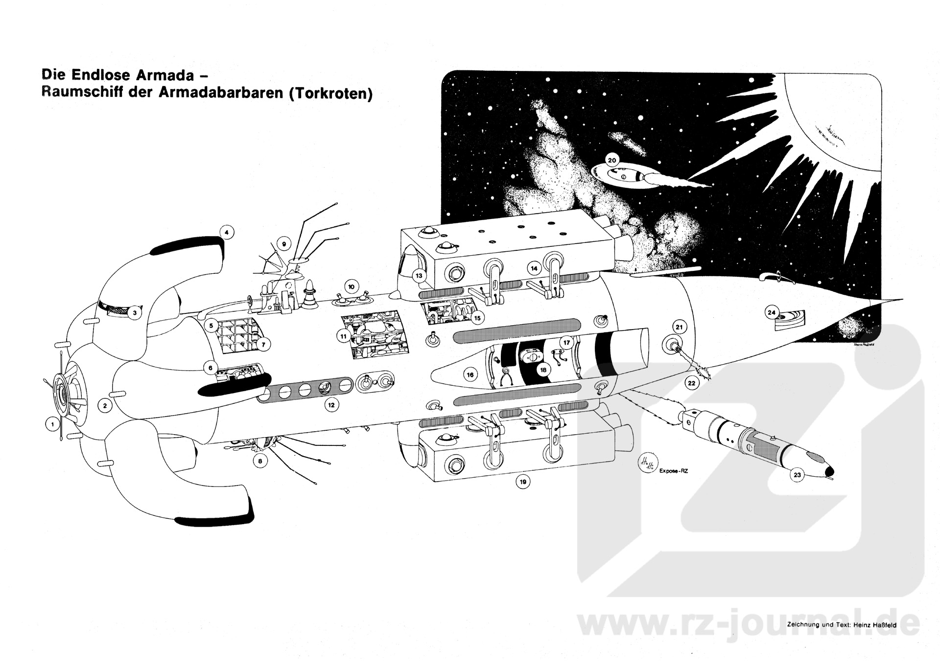 Allgemeines: Die Armadabarbaren ziehen im Auftrag des Armadaherzens quer durch die Endlose Armada und greifen immer wieder ausgesuchte Armadaeinheiten an. Auf diese Weise wird vom Armadaherzen aus festgestellt, ob die Armadaeinheiten noch funktionstüchtig sind. Nach der jeweils erzielten- Reaktion ziehen die Armadabarbaren weiter - zur nächsten Einheit. In der Endlosen Armada gibt es 18 Flotten der Armadabarbaren, sie werden auch „Barbarenwellen“ genannt. Das hier dargestellte Raumschiff ist ein kleinerer Typ. Der Standardtyp dieser Raumer hat eine Länge von 800 m und einen Rumpfdurchmesser von ebenfalls 40 m.