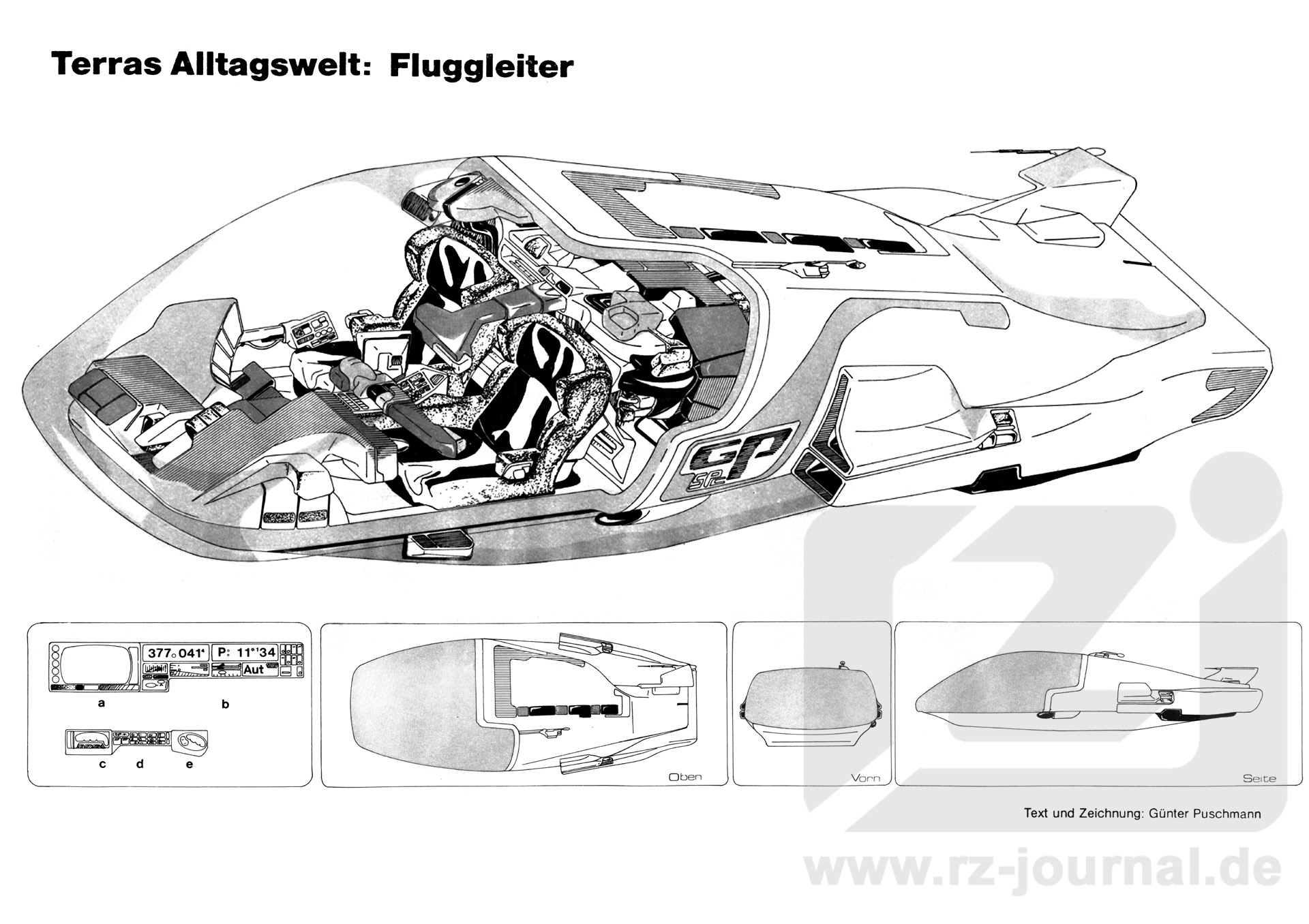 Allgemeines: Nach der Stadtlandschaft und den Wohnungen möchte ich diesmal einen kleinen Abstecher in die Fahrzeugindustrie wagen. Der Gleiter gehört seit knapp 2000 Jahren zum gewohnten Stadtbild, ein übliches Fortbewegungsmittel, das keinerlei Aufsehen mehr erregt. Doch die Produktkette, die mittlerweile hinter diesem einfachen Wort Gleiter steht, ist wahrhaft gigantisch. Sie reicht von diversen SGs (single glider) über kleine Zweimann- zu großen Achtmanngleitern, sowie Luxus- und Sportgleitern und weltraumtüchtigen Landungsfahrzeugen bis zu gigantischen Transportgleitern zur Lastenbeförderung. Der Gleiter kann ein einfaches Beförderungsmittel ebenso wie hochgezüchtetes Spezialfahrzeug sein. Aber zu solch speziellen Gleitervarianten wollen wir hier einmal Abstand nehmen und nur einmal einen betrachten, wie ihn ein Terraner Anno 427 NGZ kaufen könnte. Die Zeichnung stellt einen der momentan beliebtesten Gleiter dar, einen Drummond SPc, ein recht sportliches und schnittiges Modell. Wie viele Wagen der neuesten Generation besitzt der SPc statt einer durchsichtigen und aufklappbaren Plexiglashaube ein variables Energiefeld, das allen Ansprüchen gerecht wird. Der Hochleistungsbordcomputer steuert das Energiefeld selbsttätig, ob der Wagen nun gefahren wird oder nicht. Ebenfalls übernimmt der Computer selbständig das Fahrzeug, sobald der Wagen in eine gefährliche Situation gerät, die vom Fahrer nicht mehr bewältigt werden kann. Der SPc besitzt außer einem Innenstromgravo-Jet-Triebwerk auch ein neuartig konstruiertes Pulsatortriebwerk für geringere Geschwindigkeiten. Übrigens ist die äußere Form des Fahrzeugs kaum noch relevant, da bei Geschwindigkeiten um 200 km/h (modellbezogen!) der Gleiter einen optimal windschlüpfigen Prallschirm erzeugt, um somit einen möglichst günstigen (in diesem Falle möglichst kleinen) Luftwiderstand zu bieten. Der dargestellte Drummond SPc erreicht bei einer maximalen Steighöhe von 100 m eine Höchstgeschwindigkeit von 2500 km/h, womit er fast 500 km/h schneller ist als sonst übliche Fahrzeuge. Bei derart hohen Geschwindigkeiten steuert aber üblicherweise der Autopilot. Das Cockpit besteht aus einer recht übersichtlichen Anzahl von multiplen Anzeigen wie (a) Rückmonitor und (b) über akustische Servos ansprechbare Datenfelder wie Geschwindigkeit, Uhrzeit, Verbrauch etc. Die Steuerung erfolgt über zwei Handgriffe (c Höhenregulator, e Kurvensteuerung), sowie einem kombinierten Beschleunigungs-/Bremspedal; zwischen den Handgriffen ist einen Computertastatur angebracht, über die per Handbetrieb z. B. das Visaphon gesteuert werden kann (d). |