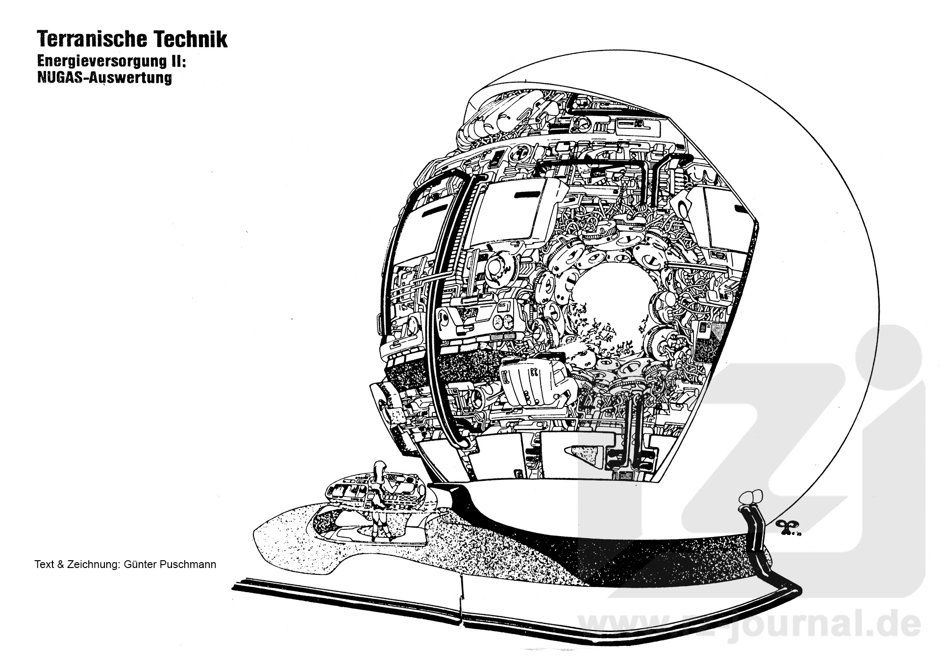Allgemeines: Mit dem Drängen nach größeren Reichweiten terranischer Raumschiffe kam gleichzeitig eine notwendige Weiterentwicklung der Kraftwerke, um die Schiffsfunktionen länger in Betrieb zu halten. Die Lösung war hier recht simpel, ein neuer, besserer Treibstoff - das NUGAS. An dem alten Schwarzschildreaktor mußten nur unwesentliche Veränderungen angebracht werden, um ihn auch mit dem NUGAS betreiben zu können. Die erste ausgereifte Anlage dieser Art wurde nachträglich in die MARCO POLO eingebaut, bei deren Betrieb allerdings die (bekannte) Katastrophe geschah; die Schranken zwischen unserem und einem Paralleluniversum wurden niedergerissen. Mit der Einsicht, daß es nicht am NSR (NUGAS-Schwarz- schildreaktor) gelegen hatte, sondern ein Zug im kosmischen Schachspiel von ES und Anti- ES war, begann man dann auch später wieder NS-Reaktoren zu bauen, z. B. für die SOL und die neuesten terranischen Raumschiffe. Doch was ist dieses NUGAS? NUGAS ist ein Kürzel und steht für ein nur aus Nukleonen bestehendes Gas. Nach Ansicht der Wissenschaftler stellt dieses Gas nach Festkörper, Flüssigkeit, Gas und Plasma den fünften Aggregatzustand dar. Zur Entstehung dieser nur aus Protonen bestehenden Substanz bedarf es Temperaturen von einigen hundert Millionen Grad, kommt in der Natur also ausschließlich in den Kernen heißer Fixsterne vor. Die künstliche Herstellung ist äußerst aufwendig. In einem Aufbereitungsschritt wird natürlicher Wasserstoff in einer Kammer bis auf Temperaturen um 10 000 Grad erhitzt und gleichzeitig einer kräftigen Dosis Röntgenstrahlung ausgesetzt. Die hohe Temperatur bewirkt eine weitgehende Aufspaltung des molekularen in atomaren Wasserstoff. Die Röntgenquanten führen zur teilweisen Ionisierung des hocherhitzten Gases. Dieses Wasserstoffplasma fließt durch Kanäle, die unter ständigem Röntgenbombardement stehen, in eine Trennkammer, wo etwa 13 000 Grad Hitze herrschen. Beim Eintritt in die Kammer ist es fast hundertprozentig ionisiert. Die Hitze sorgt dafür, daß es zu keiner Wiedervereinigung der Elektronen und Protonen kommt. Die Separierung wird durch geteilte elektrische Felder höchster Intensität bewerkstelligt. Die Impulsfolge des Feldes beträgt etwa eine Milliarde positive oder negative Impulse pro Sekunde. Durch weitere elektrische Felder kann die nun gewonnene Protonensubstanz, das NUGAS, in den Treibstoffbehälter überführt werden. Dieser Treibstoffbehälter (Zeichnung) besitzt einen Durchmesser von 12 m. Da die Protonen unter einem großen inneren Druck stehen, müssen sie durch energiereiche Fesselfelder komprimiert werden. Die eigentliche Treibstoffladung dieser 12-m-Kugel besteht aus einer „nur" 2,2 m durchmessenden NUGAS-Kugel mit einem Gewicht von 200.000 Tonnen! Die restliche Kugel ist angefüllt mit technischen Geräten zur Aufrechterhaltung und Erzeugung des Fesselfeldes, sowie einem Energiespeicher, der die internen Aggregate etwa fünf Minuten in Betrieb halten kann, falls die externe Stromversorgung nicht angeschlossen ist. Aufgrund der Katastrophe, die sich unweigerlich bei einem Totalausfall der Energie ergeben würde, besitzt die Kugel eine Selbstreparaturanlage mit zahlreichen Mikrorobotern. Außerdem läuft meist nur die Hälfte der Fesselfeldgeneratoren und -Projektoren, um bei technischen Ausfällen trotzdem die NUGAS-Kugel Zusammenhalten zu können. Bei einer durchschnittlichen Einschußrate von 0,7 kg/sec des NSR (maximal 1 kg/sec) würde eine NUGAS-Treibstoffkugel etwa 63 Jahre halten. Die umfangreichen Sicherungsmaßnahmen sind angesichts dieser langen Zeitspanne also gerechtfertigt. Da jedoch meist nicht nur ein NSR-Reaktor an einer Treibstoffkugel hängt, sondern zumeist mehrere Reaktoren daran angeschlossen sind (bei der SOL wurden jeweils acht Reaktoren zu einem Kraftwerk zusammengefaßt und von einem Tank versorgt), verringert sich die Haltbarkeit eben dementsprechend auf - um beim Beispiel der SOL zu bleiben - zirka acht Jahre. |