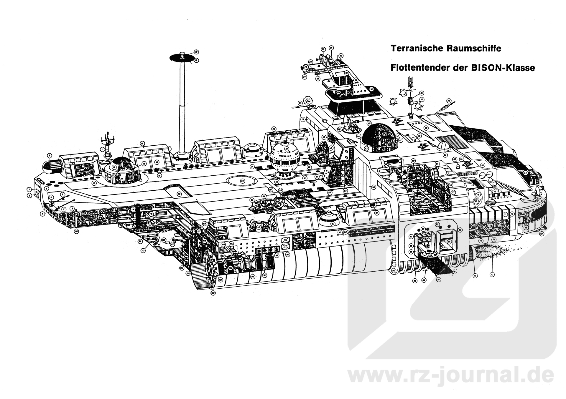 Allgemeines: Bei diesem Typ eines Flottentenders handelt es sich um eine für die GAVÖK gebaute Version, die mit den besten Erzeugnissen der terranischen Technik ausgerüstet ist. Nachdem die ersten Versionen, noch mit Korpuskulartriebwerk und Septim- Parallelaggregaten ausgerüstet, mit Hilfe anderer galaktischer Völker entwickelt wurden, sind die Schifte dieses modernen Typs terranischen Ursprungs. Beschleunigung: max. 1145 km/s² Die Besatzung konnte durch konsequenten Einsatz von positronischen Hilfsmitteln auf 419 Mann verringert werden, wovon 250 auf die wissenschaftliche Besatzung entfallen. Die Bewaffnung wurde dahingehend geändert, daß anstelle von acht Paralysatoren nur noch vier vorhanden sind, die durch Startrampen für Raumabwehrraketen ergänzt wurden. Die Abmessungen sind weitestgehend gleich geblieben. |