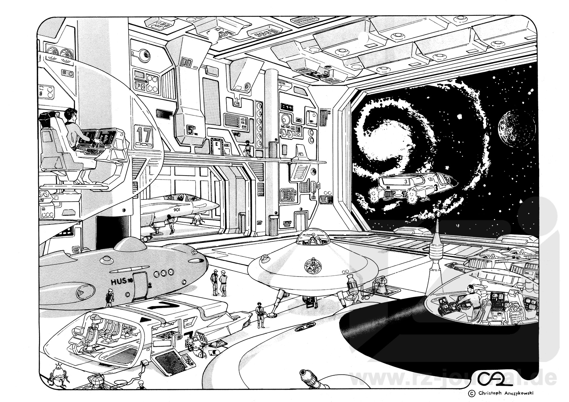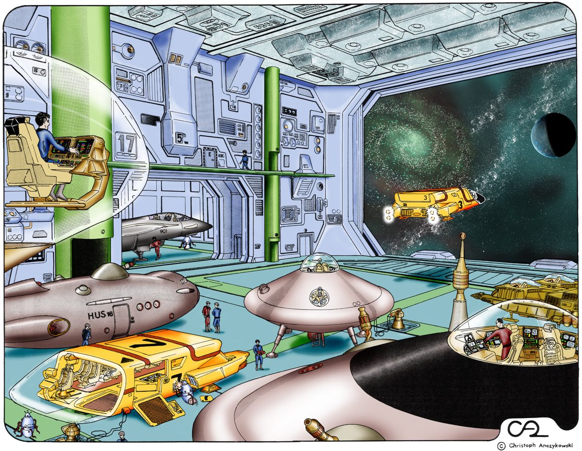 Selbst wenn man die gesamte, an Superlativen gewiß nicht arme Geschichte der terranischen Raumfahrt betrachtet, stellt die BASIS in jeder Hinsicht eine Ausnahmeerscheinung dar. Dies wird schon allein durch die wichtigsten technischen Daten - Länge 14 km, Breite 12 km, über 12.000 Besatzungsmitglieder - verdeutlicht. Bei all diesen Zahlen wird jedoch oft überschon, dass für das reibungslose Funktionieren dieses Schiffsgiganten auch eine Reihe von kleinen und .nebensächlichen" Systemen und Vorrichtungen notwendig sind, die wegen ihrer Selbstverständlichkeit innerhalb der PR-Serie kaum eine besondere Erwähnung finden. Dieser „Alltagstechnik“ will die hiermit beginnende Datenblatt-Serie ihre Aufmerksamkeit widmen. Zum einen soll sie einen Einblick in die speziellen Details der „fliegenden Stadt“ BASIS vermitteln, zum anderen aber auch jene tägliche Normalität des Raumfahrer-Lebens darstellen, wie sie überall auf den Schiffen Terras und der Kosmischen Hanse stattfindet. Den Anfang macht die Darstellung eines Mehrzweckhangars. Großraumschiffe, also auch die BASIS, verfügen meistens über zwei Arten von Hangars. Einerseits handelt es sich um die sogenannten Flottillen-Hangars. In ihnen sind jene großen Beiboot-Geschwader untergebracht, die in Reserve gehalten und nur bei besonderen Situationen ausgeschleust werden. Sie sind nur für die Stationierung eines speziellen Schiffstyps vorgesehen, den sie dann aber auch in einer großen Stückzahl aufnehmen können. Im Gegensatz dazu sind die Mehrzweckhangars vielseitiger ausgelegt und für zahlreiche Baumuster verwendbar. Daher laufen die „normalen“ Beiboot-Manöver - ca. 70% aller derartigen Schiffsbewegungen - fast ausschließlich über ihre Docks. Auf kleineren Raumern, in denen nur wenig Platz zur Vorfügung steht, ist dieser Hangar-Typ allein vertreten. In der Darstellung des Hangars sind aus diesen Gründen eine Reihe von verschiedenen Beibooten zu erkennen. Im Vordergrund sieht man eine SPACE-JET, ein Raumtaxi (Weiterentwicklung der MONDFÄHRE), einen H. U. S.-Gleiter und eine Kleinst-Space-Jet Im Nachbarhangar steht ein Raumjäger HFOLr „Topsider*. auf der rechten Seite halb verdeckt zwei neuartige Shifts vom Typ TACAN G. Auf dem Hangarboden befinden sich die Vorrichtungen zur magnetischen Beiboot-Verankerung, ein Teil der Schutzschirmaggregate und ausfahrbare Versorgungssäulen. Diese liefern im Bedarfsfall die Energie für mobile Reparatureinheiten oder die Aggregate derjenigen Beiboote, deren Meiler desaktiviert wurden. Die Seitenwände und die Decke des Hangars werden von den Schleusenaggregaten, Last- und Personenantigravschächten, der Klimaanlage, weiteren Schutzschirmaggregaten, diversen Traktorstrahl-Projektoren einschl. entsprechender Versorgungsleitungen eingenommen. Das Kontrollpult des Hangarmeisters befindet sich unter einer autarken Vollsichtkuppel aus Panzer-Troplon, die ihm auch ohne technische Hilfsmittel einen vollständigen Überblick über den Hangarbereich ermöglicht. Eine technische Besonderheit, die sich auch im Jahre 427 NGZ nur auf den modernsten Einheiten befindet, stellt das neuartige energetische Schleusenschott dar. Es ist für Materie aller Art undurchlässig, kann jedoch von einem in einen Prallschirm gehüllten Objekt problemlos passiert werden, solange dessen Geschwindigkeit ca. 80 km/h nicht übersteigt. Dadurch kann der Hangarbetrieb bei Beiboot-Manövern ohne weiteres aufrechterhalten werden. Zudem entfällt das aufwendige Ein- und Auspumpen der Schleusenatmosphäre. Alle entsprechenden Aggregate verfügen über eine mehrfache Redundanz, um eine Katastrophe durch den schlagartigen Ausfall des Energieschotts zu verhindern. Natürlich existiert auch noch ein mechanisches Schott, das den Hangar innerhalb von 0,02 sec luftdicht verschließen kann. Es wird zu den Zeiten verwendet, in denen keine Flugmanövor stattfinden. Der Hangar vermag auch extraterrestrische Raumschiffe bis zu der Größe einer 70-m-SPACE-JET aufzunehmen. Aus diesem Grunde kann er im Bedarfsfall sowohl chemisch und biologisch als auch hyperenergetisch vollständig vom restlichen Schiff abgeriegelt werden. |