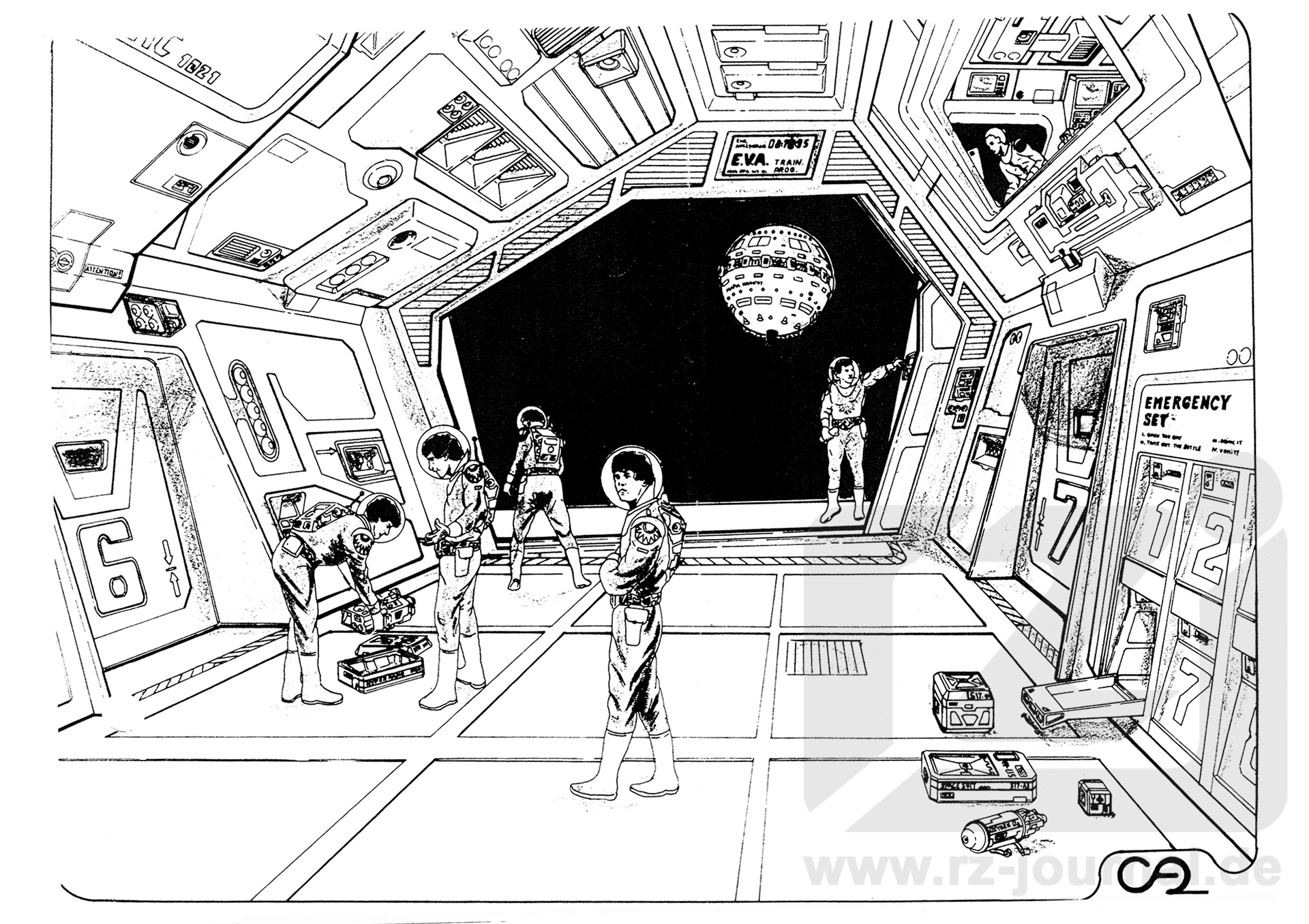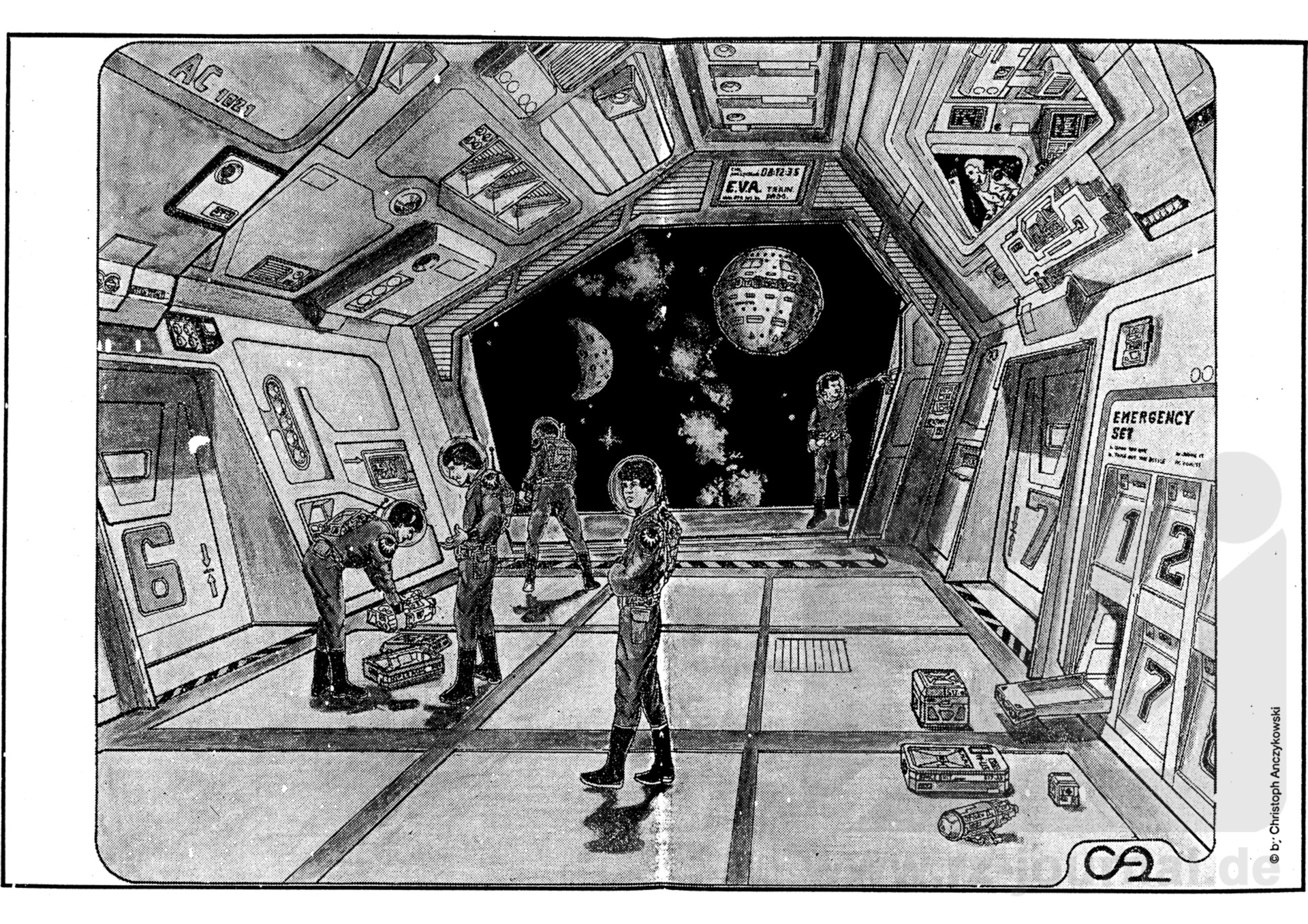 Raumschiffkonstrukteuren stellt sich besonders mit zunehmender Größe Ihrer Schiffe immer wieder die Frage, auf welche Weise sie der Besatzung den Ausstieg ins All aus jedem Teil des Schiffrumpfes ermöglichen können. Dies Ist speziell in Notfallsituationen entscheidend, in denen der Raumer evakuiert werden muss; gilt aber genauso für Reparaturen an der Außenhülle oder ähnlichen Aufgaben. Für diese Zwecke existieren auf den Raumschiffen Terras die sogenannten Mannschleusen, die hauptsächlich für Raumfahrer und Roboter gedacht sind. Mit der fortentwickelten Technik ist jedoch Ihre Bedeutung im Jahre 427 NG2 stark gesunken und fast nur auf den Notfall beschränkt. Daher werden sie auf kleineren Raumem oft als zusätzlicher Stauraum oder - bei ausreichender Größe - als Bedarfshangar für RAUMLINSEN „zweckentfremdet". Auf einem Schiffsgiganten wie der BASIS Ist Ihre Zahl und ihre Lage vor allen Dingen von der entsprechenden Schiffssektion abhängig. Natürlich befinden sich in dem dicht bevölkerten Bugsegment relativ gesehen mehr Schleusen als in dem gigantischen, menschenleeren Heck mit seinen Triebwerksanlagen. Jedoch ist jede Sektion mit mehreren, unabhängigen Ausstiegsmöglichkeiten versehen, damit die sich dort befindenden Raumfahrer bei einer Katastrophe nicht vom restlichen Schiff isoliert sind, falls die normalen Transport- und Verbindungswege unterbrochen sein sollten. Bei einer Schiffslänge von max. 14 km und über 12000 Besatzungsmitgliedern ist es nicht verwunderlich, dass die BASIS über ca. 2900 dieser Schleusen verfügt. Die Zeichnung zeigt eine jener Schleusen, die sich im vorderen Bugsegment befinden. Sie wird gerade für eine größere Rettungsübung vorbereitet; durch das geöffnete Schleusenschott erkennt man in einiger Entfernung einen Raumer der STAR-Klasse. der wie im Ernstfall die ansteigenden Raumfahrer aufnehmen wird. Wie auf vielen der neueren Schiffe Terras ist die Geometrie der Schleusenkammer asymmetrisch und auf maximale Ausnützung des Schiffsvolumens angelegt. An den Wänden und der Decke befinden sich die Schleusenaggregate, Umwälzpumpen zum Evakuieren und Fluten der Schleusenatmosphäre. Schutzschirmaggregate und kleine Traktorstrahlprojektoren. Links neben der Schleusenöffnung ist eine Notvorrichtung zu erkennen, an den im Notfall ein Raumanzug angeschlossen und mit Sauerstoff, Energie etc. versorgt werden kann. Auf der rechten Seite die Armaturen zur manuellen Bedienung der Schleuse. Die Schleusenkammer verfügt über insgesamt 7 Zugänge. von denen 2 sichtbar sind. So kann sie von den verschiedenen Abteilungen der zugeteilten Schiffssektion Jeweils problemlos erreicht werden. In die rechte Schleusenwand sind Fächer mit kompletten Notausrüstungen eingebaut. Zu Demonstrationszwecken ist eins von ihnen geöffnet und teilweise ausgeräumt worden. Man erkennt auf dem Schleusenboden einen Behälter mit komplettem Raumanzug, einen 90 Tage-Sauerstoffbehälter mit Regenerator, eine MEDO-Box und einen kleinen Projektor zum Erstellen einer luftdichten Energiesphäre. Weiter links haben zwei Mitarbeiter des Teams offensichtlich Schwierigkeiten mit einem Hyperfunk-Peilsender. Der Kontrollstand rechts oben stellt in einer Mannschleuse die Ausnahme dar und verdankt seine Existenz nur der Tatsache, dass die gezeigte Schleuse oft für das Raumfahrer-Training benutzt wird. Vor der Schleusenöffnung befinden sich an der Außenseite des Schiffsrumpfes verdeckt Projektoren, die ein trichterförmiges, ca. 1 km langes Traktorfeld erzeugen können. In ihm steigt die Gravitationsstärke bis in Schottnähe auf 0,3 g an, was ein problemloses Ein- und Ausschleusen der Raumfahrer ermöglicht. Die maximale Kapazität der Schleuse beträgt 112 Personen. |