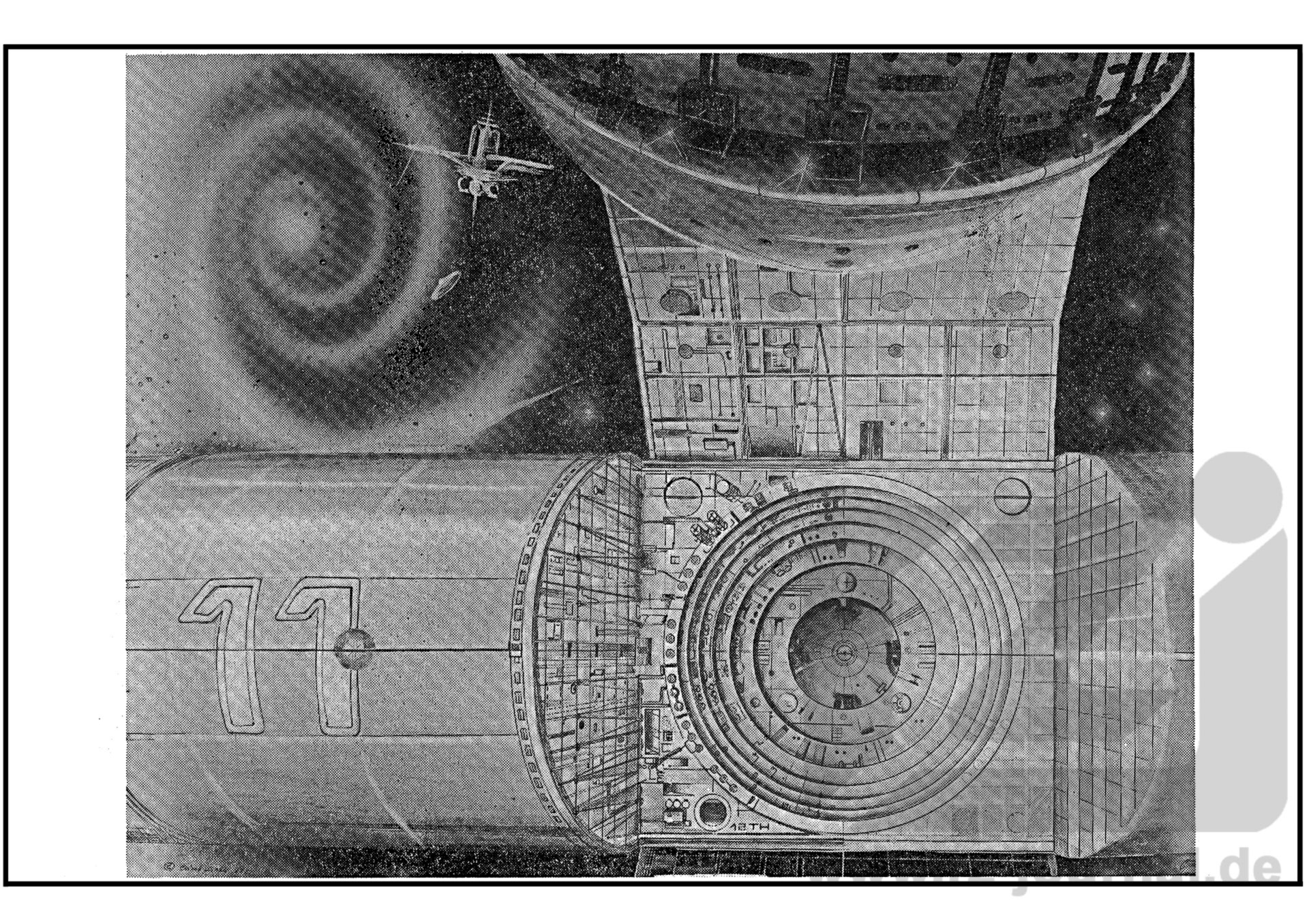 Allgemeines: Die größten abschottbaren Hangaranlagen der BASIS befinden sich im Ringwulst. Sie sind zur Aufnahme jeweils eines THEBEN-Kugelraumers bestimmt, der dort gewartet und sogar totalüberholt werden kann. Dazu existieren in den Hangaranlagen komplette Werft- und Produktionseinrichtungen, die auch ansonsten typisch für die auf höchstmögliche Autarkie ausgelegte BASIS sind. Die Rohstoffe erhalten diese Einrichtungen von Zubringerflügen der Beiboote, insbesondere des umgebauten Trägerschiffes der Galaxisklasse, das auf der Oberen Plattform der BASIS verankert bzw. stationiert ist. Die untere Hälfte des Ringes (basiszugewandte Seite) ist als Formhangar ausgelegt. Die Hauptdecks (100 m Abstand untereinander) liegen also fast an der Schiffshülle des angedockten Kugelraumers an, es verbleiben etwa 20 m Zwischenraum. Die obere Hälfte des Hangars ist hohl. Von den Seitenwänden und den großen Toren, die vollständig integrierte Arbeitsplattformen sind, lassen sich jedoch Formenergiedecks aufbauen. Durch die so verringerte Masse der Tore ist eine Öffnung des Hangars in ca. 4 Minuten möglich. Dabei werden die Hangarschotte mit ihren jeweils ca. 1760 x 103 m2 Fläche und einer Masse von jeweils 6.8 x 107t durch Preßfelder auseinandergerückt. Die Anlage wird dabei nicht evakuiert, da ein Prallfeld die Atmosphäre zurückhält. Die Skizze zeigt die BASIS mit allen geöffneten Ringwulsthangars. Die Hauptzeichnung zeigt einen geöffneten Ringwulsthangar und einen THEBEN-Raumer (rechts oben) beim Einflug in sein Dock. |