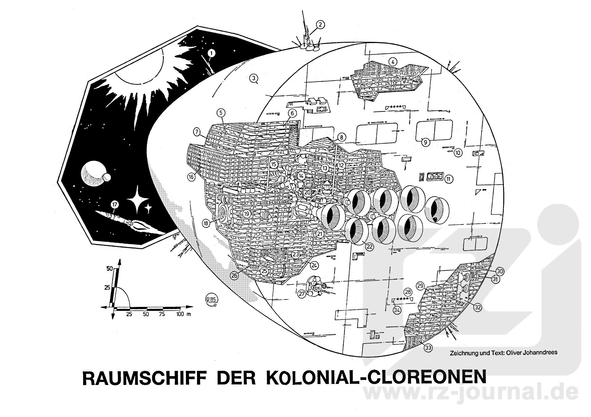 Allgemeines: Die Cloreonen haben vor 5000 Jahren in der Galaxis Erendyra sechs Sonnensysteme auf engem Raum besiedelt. Diese haben sich nach der Isolierung der Mutterwelt durch den Krieger Kalmer allmählich zu Militär-Regimes entwickelt, die einander sehr ähnlich sind. Die internen Machtkämpfe haben den technischen Fortschritt gehemmt, selbst die Waffentechnik ist auf der Stelle getreten, so daß der Status quo wie von vor 5000 Jahren besteht. Eine Ausnahme bildet nur die Gen-Technologie. Alle sechs Kolqnialwelten liegen in Richtung galaktisches Zentrum. Kontakt besteht nur untereinander, kaum zu anderen Völkern. Technische Daten: Länge: 500 Meter (Kleinere Einheiten: 200 Meter) Heckdurchmesser: 400 Meter (Kleinere Einheiten: 160 Meter) Beschleunigung: 400-475 km/sec² Besatzung: ca. 800-1000 Cloreonen Ruhende Masse: 1,96 Milliarden Tonnen |