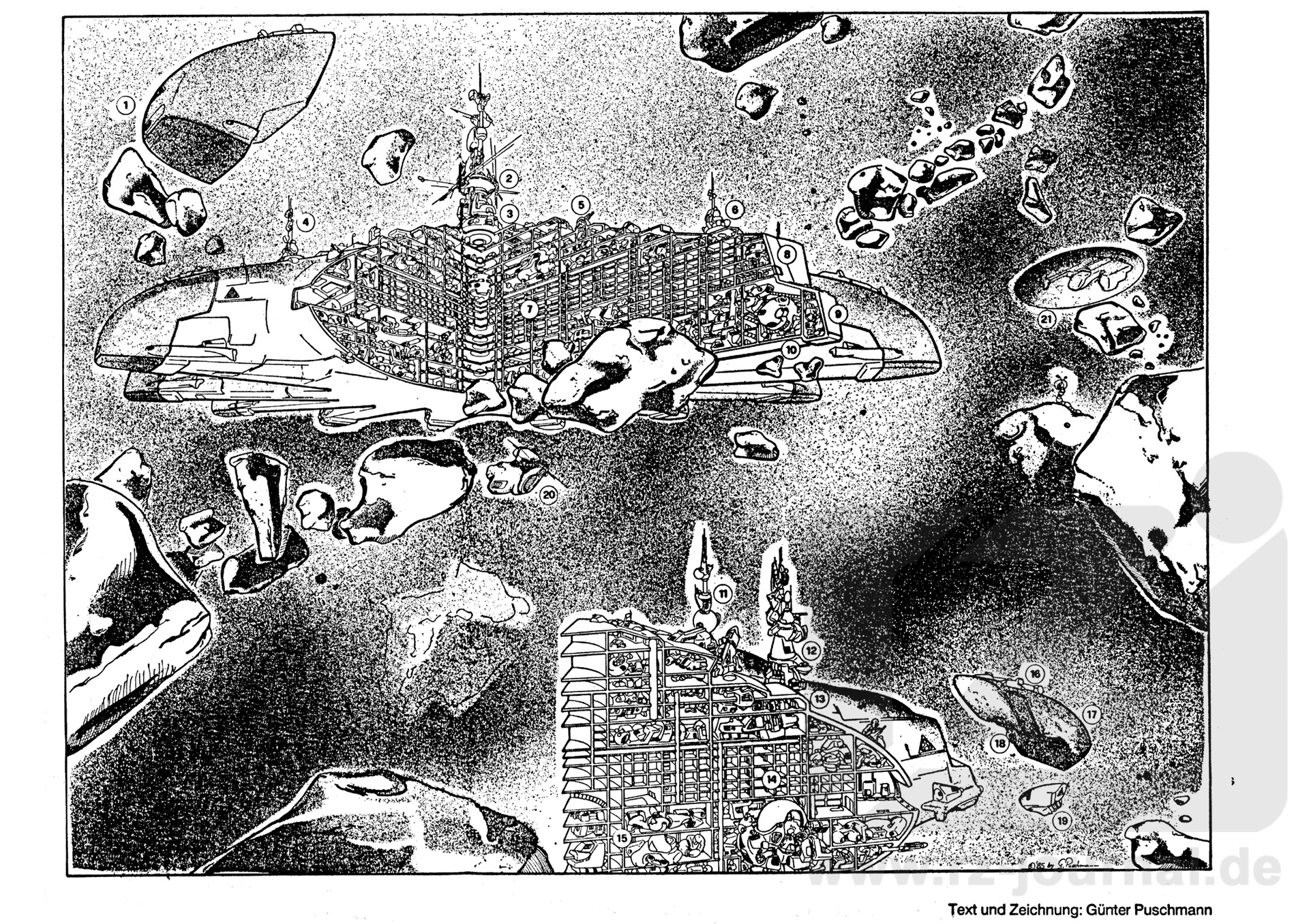 Allgemeines: Die ESTARTU ist das Raumschiff Stalkers, der 429 NGZ erstmalig ins Licht der galaktischen Öffentlichkeit tritt. Doch wie sich herausstellt, ist der Gesandte der Mächtigkeitsballung ESTARTU keinesfalls mehr ein Unbekannter - er war der WARNER, und nur Homer G. Adams und drei seiner engsten Mitarbeiter wussten um seine Identität. Die Entdeckung der ESTARTU beruht mehr oder weniger auf einem Zufall, da Ronald Tekener auf dem Flug zu seinem Virenschiff LASHAT die Position der ESTARTU streifte. Bemerkung: Die Zeichnung zeigt die ESTARTU beim Durchflug durch den Asteroidengürtel, um eine bessere Einsicht ins Innere zu haben, wurde der herausgeschnittene Schiffsteil umgedreht und näher an den Betrachter heranpositioniert. Technische Daten: Maximaldurchmesser: 400 m Durchmesser ohne Beiboote: 300 m Sterneinbuchtung: 25 m Höhe außen: 40 m Maximalhöhe: 100 m Höhe Zentralturm: 100 m Besatzung (laut Stalker): 200 Personen |