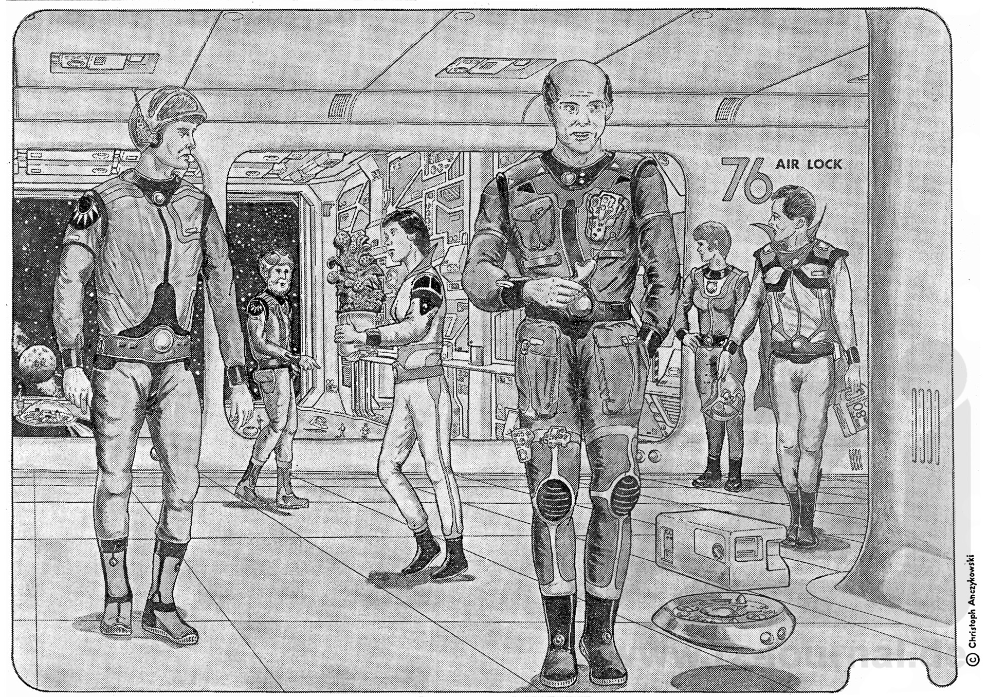 Ein astronautischer Laie, der schon von den zahlreichen Vorzügen und Möglichkeiten eines SERUNS gehört hat, wird zu seinem Erstaunen bei einem Besuch an Bord der BASIS feststellen, daß diese Superversion eines Raumanzugs bei den Raumfahrern nicht in dem Maße beliebt ist, wie man es vielleicht im ersten Augenblick annehmen könnte Dies liegt vor allen Dingen an der Schwerfälligkeit und der daraus resultierenden Unbequemlichkeit, mit der der Träger eines SERUNS zu kämpfen hat. So haben die leichteren Raumanzüge und -Monturen durchaus noch Ihren Platz im Arbeitsleben des Raumfahrerkorps. Das vorliegende Datenblatt zeigt einige Jener Modelle, die man häufig an Bord der BASIS findet. Die Hauptaufgabe eines Raumanzuges entspricht im wesentlichen derjenigen einer Bordkombination - er soll den Träger möglichst vollständig und umfassend in lebensbedrohlichen Situationen schätzen. Währenddessen dies jedoch bei den Bordmonturen nur in Notfällen geschieht, ist der Raumanzug speziell auf den Aufenthalt in einer lebensfeindlichen Umgebung hin konstruiert. Ein Raumanzug besteht im wesentlichen aus vier Teilen: a) DER EIGENTLICHE ANZUG Er besteht aus verschiedenen Lagen unterschiedlicher Stoffe und Materialien. Die Innenseite besteht üblicherweise aus einem biosynthetischen Polymer, um eine gute Hautverträglichkeit und ein funktionierendes Mikroklima zu gewährleisten. Darüber liegen eine Reihe von Isolations- und Schutzschichten, in die das Heiz- und Kühlsystem, Terkonitfasern zur Verstärkung und Vorrichtungen zum Sammeln und Weiterleiten der menschlichen Ausscheidungsprodukte eingearbeitet sind. Die Oberfläche verfügt noch einmal über eine besonders wirksame Schutzschicht aus reflektierendem und schmutzabweisendem Material. Sie toleriert ohne weitere Hilfsmittel Temperaturen bis zu 320°C. b) DER AGGREGAT-GÜRTEL In ihm befindet sich hauptsächlich ein linsenförmiger Schutzschirmprojektor mit eigenem Energiesystem. Dazu kommen ein mikrominiaturisierter Hyperfunksender und eine O2 Patrone mit einfachem Regenerationssystem. Der Träger kann sich auf diese Weise auch in solchen Situationen schützen, in der ihm kein Raumhelm und/oder Rückentornister zur Verfügung steht. Dieser Schutz währt aber nur ca. 18-20 Stunden, seine vollen technischen Möglichkeiten kann der Gürtel nur im Zusammenspiel mit den Aggregaten des Rückentornisters entfalten. c) DER RÜCKENTORNISTER In ihm befindet sich das technische Herz des Raumanzugs, eine Reihe von Aggregaten in siganesischer Mikrobauweise: Feld- und GRAVO JET-Triebwerk, Antigravgenerator, Mikrogravitator und -absorber, Generatoren für Paratron-, HÜ- und Prallschirme, Deflektorfeldgeneretor, Mikrofusionskraftwerk mit Energiespeichern, Klimaanlage und Regeneratoren für Wasser und Sauerstoff (einschl. entsprechender Vorratstanks), Normal- und Hyperfunksender, Ortungsanlagen einschl. Auswertungspositronik. Dazu kommen Notvorräte an Nahrungskonzentraten und Medikamenten. Diese Maximalausstattung ist jedoch nicht immer vorhanden. Je nach Modell variiert sowohl die Zusammenstellung als auch die Leistungsfähigkeit der Aggregate. d) DER RAUMHELM Von ihm existieren so viele Varianten und Versionen, daß eine vollständige Erwähnung den Rahmen dieses Datenblattes sprengen würde. Grob vereinfacht unterscheidet man zwischen den starren Konstruktionen, die nach dem Einsatz abgenommen oder auf den Rücken zurückgeklappt werden, und den semistabilen Modellen, die im Ruhezustand kapuzenartig zusammengefaltet auf der Schulter des Trägers liegen, im Einsatz nehmen sie dann infolge hyper- energetischer Aufladung des Materials wieder eine stabile Kugelform an (sogenannter Memory-Effekt). Alle Teile sind dank genormter Verbindungssysteme miteinander kombinierbar. Dies gilt auch für die Raumstiefel und Handschuhe. Das Datenblatt zeigt einen Verbindungsgang im Bereich von Mannschleusen des Zentralsegmentes. Vorne rechts sieht man einen Raumfahrer in einem typischen Raumanzug mittlerer Kategorie. Erwähnenswert sind die kleinen Schutzschirm-Zusatzprojektoren auf der Brust und an den Stiefeln. Sie dienen zur Stabilisierung und zur Oberflächenreduzierung des Schirmfeldes, das sich mit ihrer Hilfe den Körperformen des Trägers besser anpaßt und somit Energie spart. Auf der rechten Schulterseite erkennt man das alte traditionelle Sonnensymbol des terranischen Raumfahrerkorps, wie es schon seit den Tagen der 3. Macht bekannt ist. Das junge Besatzungsmitglied in der Mitte des Bildes trägt einen jener Anzüge, die man in den überall an Bord der BASIS vorhandenen EMERGENCY-Sets findet. Sie sind vorwiegend für Notfälle gedacht und so konstruiert, daß fast sämtliche Aggregate und Systemmodule von außen her zugänglich und auswechselbar sind. Auf diese Weise können technische Defekte, wie sie bei längerer Lagerung mitunter auftreten, von Wartungsrobotern schnell und problemlos behoben werden. Zudem sind auf diese Weise im Ernstfall trainierte Raumfahrer besser in der Lage, ihren unerfahrenen Kollegen bei Aggregat-Ausfällen beizustehen. Die Dame, die ihren Rücken dem Betrachter zuwendet trägt einen Anzug mit den typischen Symbolen des wissenschaftlichen Korps. Es ist eine jener einfachen Konstruktionen, die allgemein als Raummontur bezeichnet werden. Im wesentlichen handelt es sich um eine Bordkombination mit verstärkten Isolations- und Schutzschichten, an die ein Rückentornister und ein Raumhelm angebracht werden können. Der starre Aggregat-Gürtel garantiert ohne weitere Hilfsmittel eine Überlebenszeit von 5-6 Stunden. Der Raumanzug ihres Gesprächspartners zeichnet sich durch eine Reihe dekorativer Zierstreifen aus, auch der Funkhelm verfügt über ein extravagantes Design. Die Besatzungsmitglieder der BASIS sind also auch durchaus modebewußt - ertaubt ist, was gefällt, solange der Betreffende für die eventuell anfallenden Zusatzkosten selber aufkommt. Im Hintergrund erkennt man auf der linken Seite eine Expeditionseinheit mit aufwendige