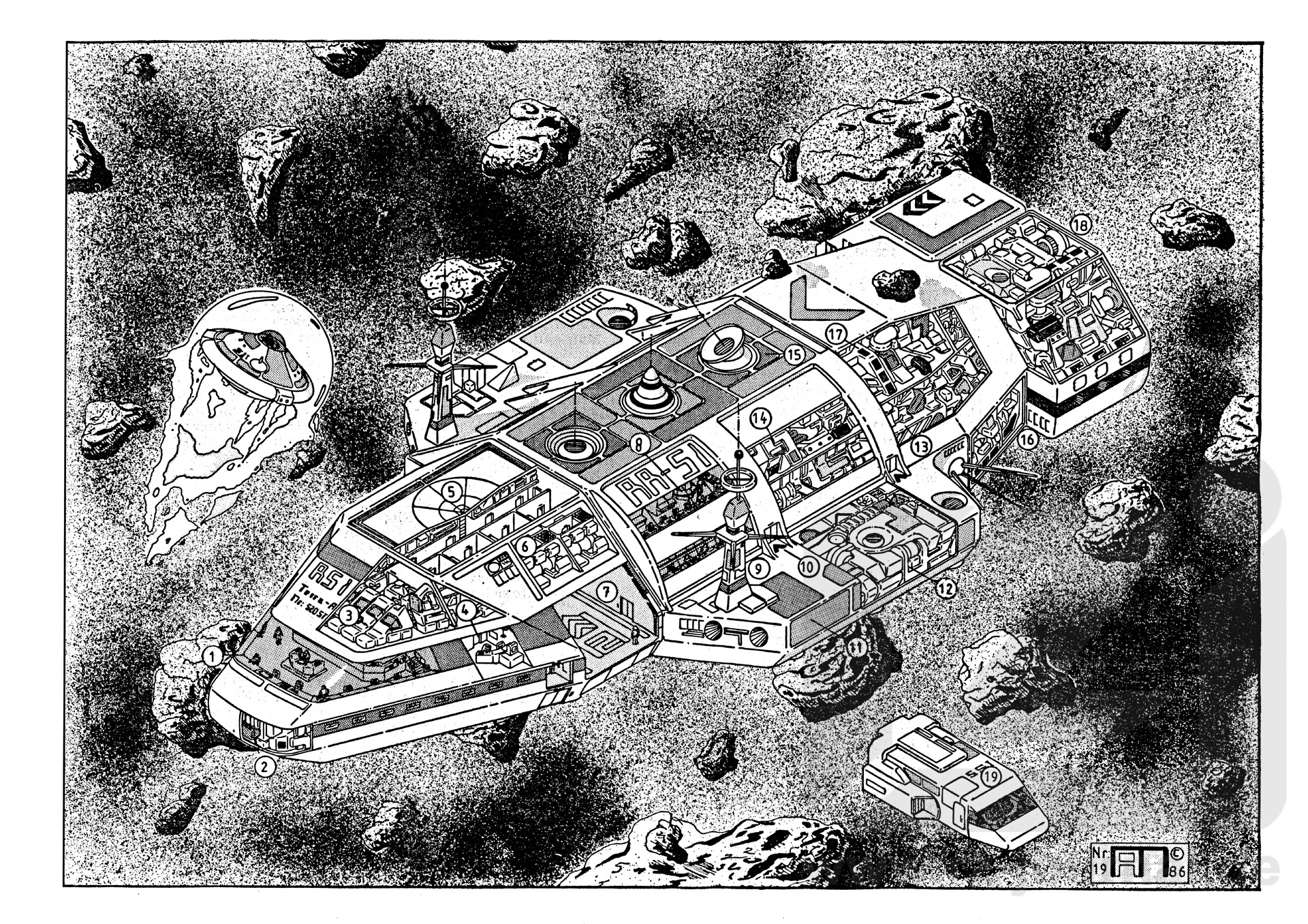 Allgemeines: Im Zuge der Ausweitung des terranischen Einflußbereiches wurden die Entfernungen für einzelne Hyperfunkanlagen zu groß. Deshalb richtete man schon früh Funkrelaisbrücken aus Raumschiffen ein. Diese Schiffe waren anfangs umgebaute Kreuzer, später wurden für diese Aufgabe Raumstationen und Spezialschiffe eingesetzt. Die Funkrelaisschiffe spielten während des Falls LAURIN eine wichtige Rolle. Sie übermittelten die Befehle aus dem zeitversetzten Solsystem an die In der Normalzeit operierenden Einheiten der Solaren Flotte. Daher musste ein Funkrelaisschiff Nachrichten ver- und entschlüsseln können. Auch leitete es Notrufe weiter, oder die Besatzung sah mit der Space-Jet an Ort und Stelle nach dem Rechten. Des weiteren befanden sich zwei Gleiter bzw. Shifts und eine Raumfähre an Bord. In Notfällen konnte der Kommandoteil mit den Hangars abgesprengt werden. Um sich vor der Entdeckung zu schützen, umgab sich das Schiff mit einem Ortungsschutz und tarnte sich zusätzlich in Asteroidenfeldern o.ä. Die Schiffe der Baureihe ASICO. 81 -7 wurden in den Jahren 2933 bis 3460 in kleinen Stückzahlen produziert und gehörten zu den ersten Typen des Solaren Imperiums, die von der strikten Kugelform abwichen. Trotz vieler Vorzüge und ständiger technischer Verbesserungen konnte sich das ASICO-Programm nicht entscheidend durchsetzen. Das hier gezeigte Schiff verließ die Werft im Jahr3308 und war bis 3445 in Dienst Besatzung: 20 Personen Länge ca.: 100 m Höhe ca.: 20 m Reichweite der Funkgeräte bei Richtfunk: 50000 Lj Streuung: 1000000 Lj |