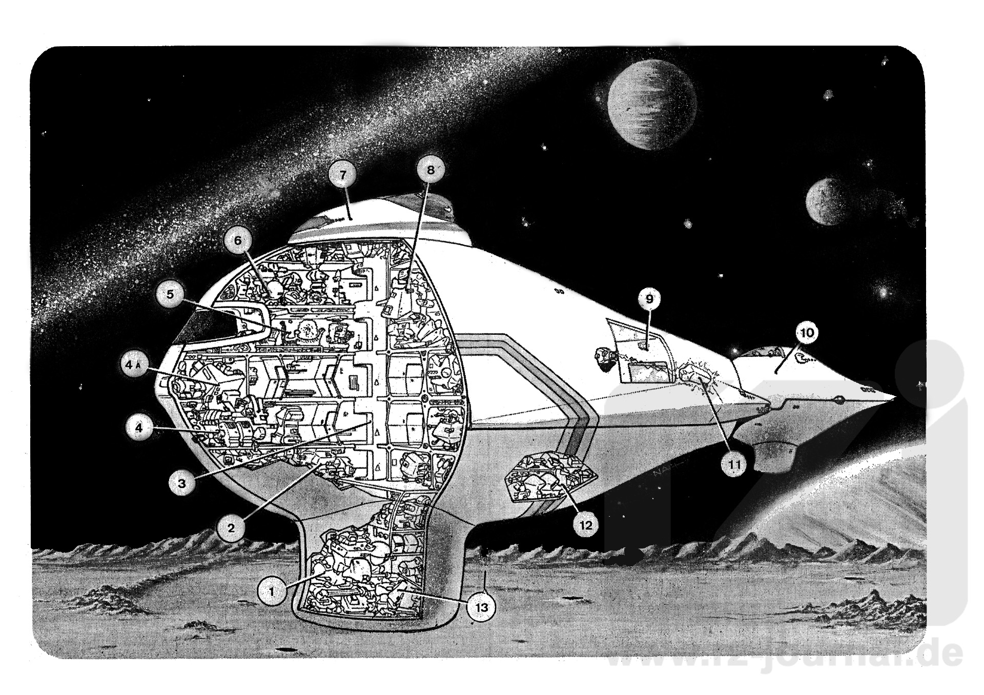Allgemeines: Die TALSAMON wurde von Alaska Saedelaere nach einem See auf der namenlosen Querionenwelt benannt. Alaska bekam das Schiff nach seiner Aufnahme von den Gängern des Netzes. Jeder Gänger des Netzes kann sich ein Raumschiff nach eigenen Wünschen oder vorliegenden Bauplänen aussuchen. Interessantes Detail des Schiffes ist das Beiboot in gleicher Form, das am Heck angekoppelt ist. Die Länge des Schiffes beträgt 70 Meter, der Durchmesser 30 Meter. Der an der Schiffsunterseite befindliche Grave n-Block ist 10 Meter hoch und 15 Meter im Durchmesser. Das Beiboot hat eine Länge von 10 Meter. Zum Antrieb: Der Enerpsi-Antrieb hat einen Oberlichtfaktor von 400 Millionen; ebenfalls im Schiff befindet sich ein Metagrav-Triebwerk mit ÜL- Faktor von maximal 25 Millionen. |