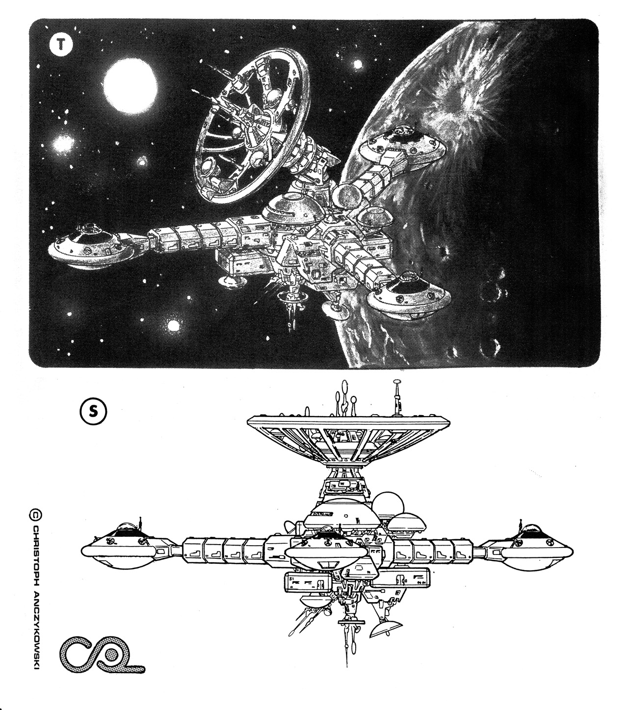 T. Draufsicht und Bemerkungen Dieser Hyperflugtaugliche Stationstyp wurde hauptsächlich für astronomische Forschungen und Orbitanalysen von zur Besiedlung vorgesehenen Sonnensystemen verwendet. Sowohl der Überlicht- als auch der Unterlichtflug erfolgten in einem Verbundsystem, bei dem die Antriebsaggregate der Station und der Space-Jets durch eine zentrale Steuerpositronik koordiniert und synergetisch eingesetzt wurden. Nach Erreichen des Zielgebiets konnten sich die Space-Jets vom Stationsteil abkoppeln, um dann vollkommen autark für die verschiedensten Aufgaben zur Verfügung zu stehen. Die archaisch anmutende Antennenschüssel diente als Träger für die Unzahl von Antennen, Sensoren und Meßvorrichtungen der Fernortungsanalyse, deren Daten in den Stationspositroniken gespeichert und einer Vorauswertung unterzogen wurden. Je nach Bedarf konnten Module mit Wohneinheiten, Labors oder zusätzlichen Auswertungssystemen angekoppelt werden, um die Stationen an ihre jeweilige Aufgabe optimal anzupassen. Auf der dargestellten Station EX-ST-34 fanden in den Jahren 3447 - 3450 jene Experimente und Tests statt, die die Technik der SPARTAC-Energieteleskope perfektionierten und einsatzfähig machten. |
