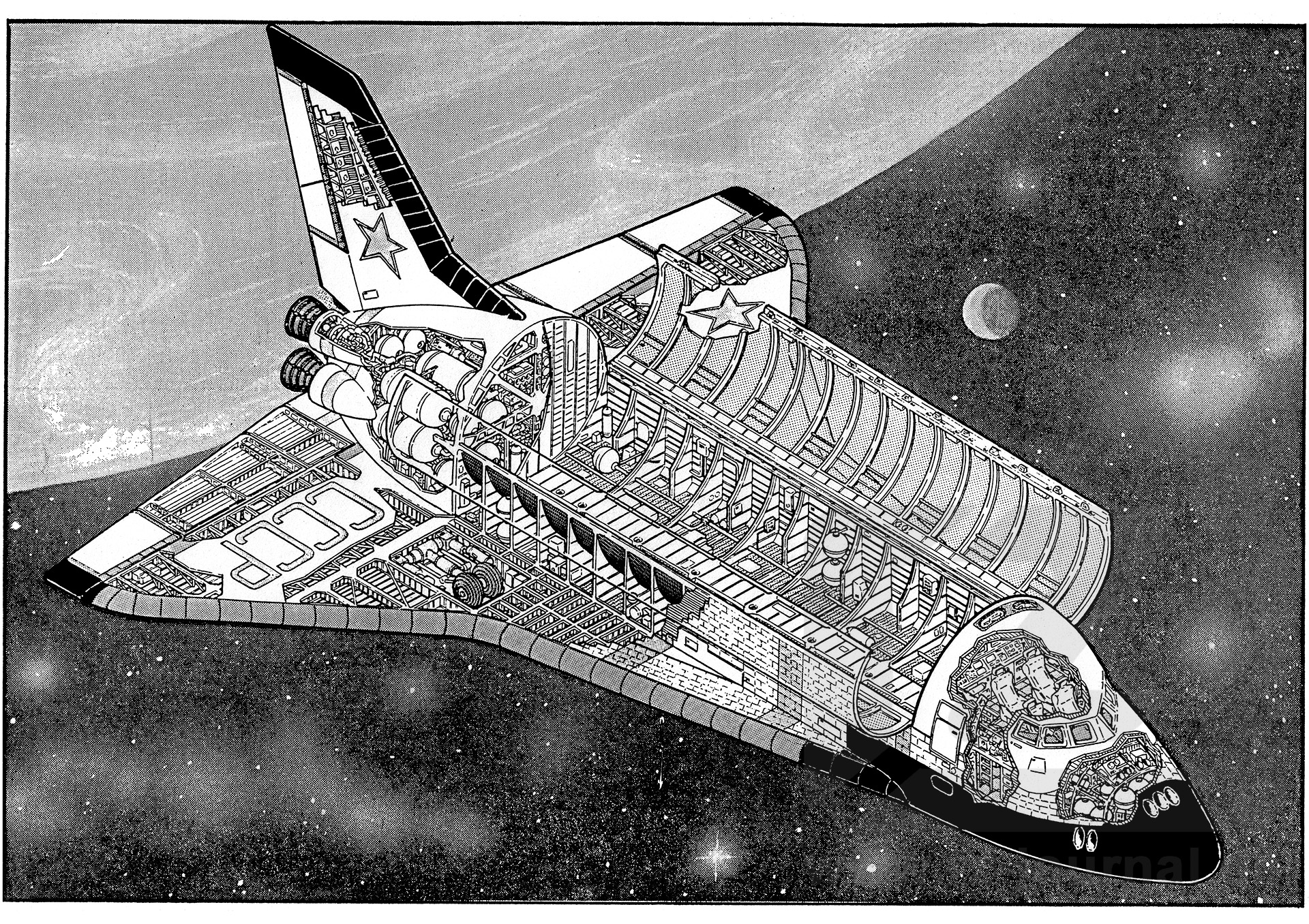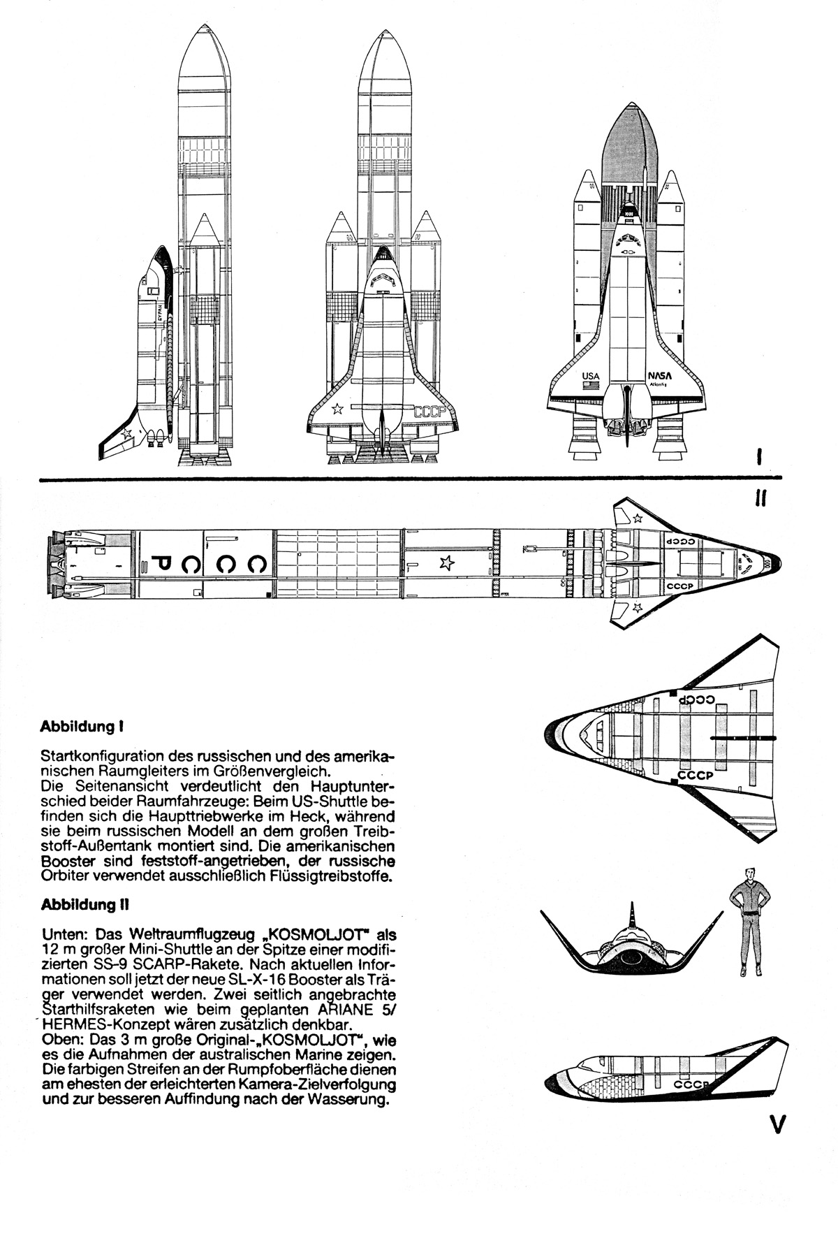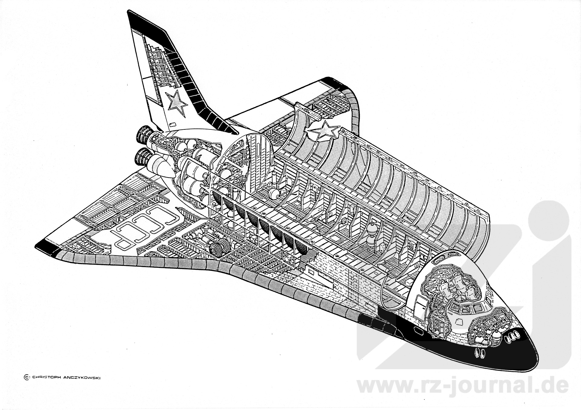 Rißzeichnung der russischen Raumfähre (umseitig) Falls der russische Shuttle wirklich weitestgehend seinem amerikanischen Vorbild gleicht, dürften auch bei der Innenkonstruktion keine wesentlichen Unterschiede bestehen. Der Bugspitze mit den kleinen Steuertriebwerken folgt der zweistöckige Aufenthaltsbereich der Besatzung einschließlich Cockpit. Dahinter befindet sich der große Laderaum mit seinen nach oben aufklappbaren Toren. Die Hecksektion verfügt nur über 4 Traktionstriebwerke, die möglicherweise kardanisch aufgehängt sind. Zur Hitze-Isolierung dürften wie beim US-Shuttle Keramik- Kacheln verwendet werden. Nicht berücksichtigt wurden bei dieser RZ die Radiatoren und die neuerdings beschriebenen Jet-Triebwerke. Falls sie auch in den Einsatzmodellen eingebaut sein sollten, befinden sie sich entweder ebenfalls im Heckbereich oder werden während der Landephase aus dem Mittelrumpf herausgeklappt. Zumindest der Prototyp soll auf seiner Rumpfoberfläche über rote Streifen zur erleichterten Kamera-Zielverfolgung verfügen. |