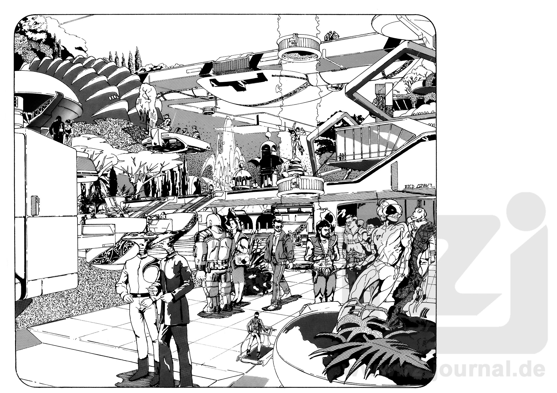 Die Kaufhäuser des Jahres 427 NGZ sind eigentlich eher geschickt angelegte Freizeitanlagen, in denen es alles gibt, was man für eine optimale Gestaltung eines längeren Zeitraumes braucht. Behilflich dabei ist die mit allen Raffinessen ausgestattete galaktische Technik, die in diesen Kaufhäusern dezent und unsichtbar, aber dennoch allgegenwärtig für das Wohl der Besucher sorgt. Ein gewaltiger Stab von Technikern, Servicekräften und Arbeitsdroiden unterschiedlichster Konfigurationen sorgen zusätzlich, und ebenso geschickt wie unauffällig für die Wartung sowie der optimalen Betreuung der in der Anlage wohnenden Galaktiker. Das Datenblatt zeigt einen Blick auf eine Einkaufspassage die mit einer auf mehreren Ebenen gelegenen Panorama-Galerie versehen ist. Die Einkaufspassage, die von exotischen Kuppel- und Turmbauten zu einem galaktischen Zentrum unterschiedlichster Kulturen gebildet wurde, stellt einen der Hauptanziehungspunkte für die Besucher der Kaufhausanlagen da. Hier bekommt man alles, was es auf dem galaktischen Markt an exklusiven Dingen zu haben ist. Gegenstände für den alltäglichen Bedarf bekommt man ohnehin durch das ausgebaute Versorgungsnetz, welches die Planeten des Versorgungs-Bundes der Kosmischen Hanse überzieht. So werden in den Kaufhäusern vorwiegend jene Artikel angeboten, an die man sonst nur ungleich schwer herankommen kann und dieses Konzept scheint bei der Bevölkerung sehr gut anzukommen. In den Straßen der Einkaufspassage stösst man oft auf sogenannte »fliegende Händler- die ihre Ware in improvisierten Antigravständen zum Kauf anbieten. Diese sind jedoch in Wirklichkeit keine »fliegenden Händler«, sondern fester Bestandteil einer geschickt aufgebauten Szenerie galaktischer Vielfalt. Auf dem Datenblatt tot ein solcher Galaktischer Händler - allerdings ohne Ware - als dritter links neben der Statue eines kosmischen Helden zu sehen. Ferner sind Gebäude unterschiedlichster Form zu sehen, die alle kleine Warenhäuser in sich darstellen. |