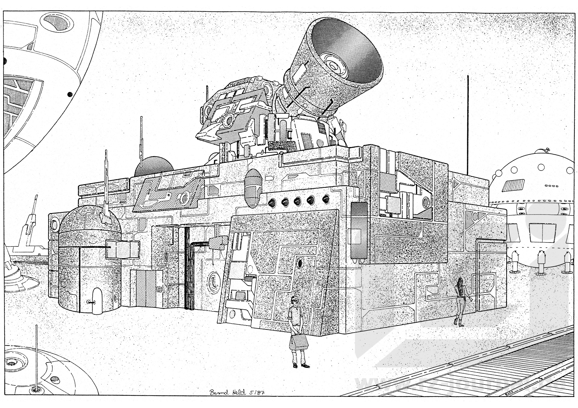 Hierbei handelt es sich eigentlich nicht mehr um ein Feld sondern um einen Fesselpunkt, der zum Beispiel unter ein gelandetes Raumschiff projeziert wird und dieses so am starten hindert. Bei dem gezeigten Datenblatt handelt es sich um einen kleineren Fesselfeldprojektor aus der Kategorie der gravoenergetischen Projektoren. Er wird von einer Zentrale aus ferngesteuert, kann aber im Notfall autark von zwei speziell geschulten Personen bedient werden. Seine Leistungsfähigkeit erlaubt es, Raunfahrzeuge mit der Startleistung von Korvetten am Boden zu halten. Bei diesem Modell ist es gleichzeitig möglich, wie übrigens bei allen etwas größeren Fesselfeldprojektoren neuerer Bauart, ein Dreischichtenfeld über das gebundene Objekt zu legen und so Paragaben im Inneren des Objekts lahmzulegen. Am linken Rand des Bildes ist gerade noch ein Raumfrachter beim Löschen der Ladung zu sehen, während am rechten Bildrand ein weiterer Frachter darauf wartet, abgefertigt zu werden. Im Vordergrund erkennt man einen reichlich deprimierten Angehörigen der Raumstreitkräfte der LFT in seiner Ausgehuniform. Der arme Mensch erholt sich gerade von seiner Niederlage bei einem Annäherungsversuch, den die junge Dame rechts schroff ablehnte. Rechts im Eck sieht man noch ein bischen von den weit verbreiteten Personenförderbänder, die auch auf einem Raumhafen nicht fehlen dürfen. |