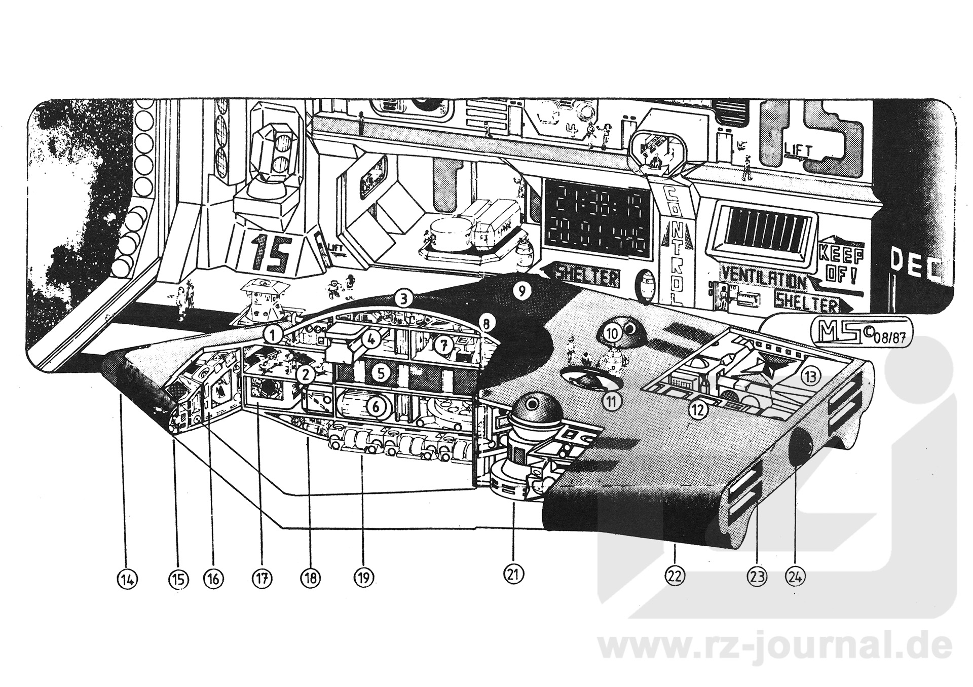 Der hier abgebildete Jäger befindet sich in einem Mehrzweckhangar (100x100x50 m) an Bord eines Schweren Holks, der - wie ein Blick durch das von einem materiedurchlässigen Energieschirm geschützte Hangartor zeigt - eine Mission im Bereich des Nordamerika-Nebels durchführt. Vor dem Tor wirft ein Ertruser einem Hangarrobot vor, dass die Hangarpositronik mal wieder langsamer ist als der Mensch, da er im Dichtungswulst vor dem Robotpersonal eine Beschädigung entdeckt hat. Beide stehen auf einer von vier energetischen Startschienen. Hinter ihnen steht eine einfahrbare Versorgungssäule mit Standardanschlüssen zur Energieversorgung etc. Darüber ist ein Traktorstrahlprojektor für die bevorstehende Ausschleusung in Bereitschaftsstellung. Links daneben sieht man die Projektionsköpfe des Fesselballonprojektors, der dazu dient, sperriges Ladegut bis zum Einsatz von Transportgerät vor dem Hangar zu halten. Durch die Verbindungsschleuse zum Nachbarhangar wird auf einer großen Antigravplatte Ersatzteilmaterial zum Schwesterschiff des Jägers transportiert. In der Seitenwand finden sich Energiefeld-. Traktorstrahl- und Fesselballonprojektoren, Schleusenschotthydraulik, Anlagen zur Be- und Entlüftung usw. Ganz rechts ist noch ein Ausschnitt eines großen Lastenantigravlifts zu sehen. Allgemeines: Durch die aggressive Haltung Sotho Tyg lans sah sich die GOI gezwungen, die Beschränkungen des Galaktikums, was die Bestückung mit aktiven Waffen anbetraf, zu mißachten. Es entstand, nach 41/2jähriger Entwicklung, ein weitgehend computerisiertet, stark bewaffnetes Angriffsraumschiff, ausgestattet mit modernster galaktischer Technik. So ist der „Stingray“ mit quasinatürlicher Intelligenz beseelt und kann fast sämtliche Operationen und Notwendigkeiten selbständig ausführen. Daneben gehören ein Netzstriktor und ein hochwertiger Anti-Ortungsschirm zur „selbstverständlichen“ Ausrüstung. Technische Daten: Baujahr: 445 NGZ Länge: 60 m Breite: 58 m Höhe: max. 12 m Antrieb: Meta-Grav, Gravo-Jet, Antigravtrieb- werk Reichweite (ungewartet): 15000000 Lichtjahre Leistung: 1124 km/s2 (= 114576 g) in Atmosphäre: Mach 9 Besatzung: 8 Mann normal |