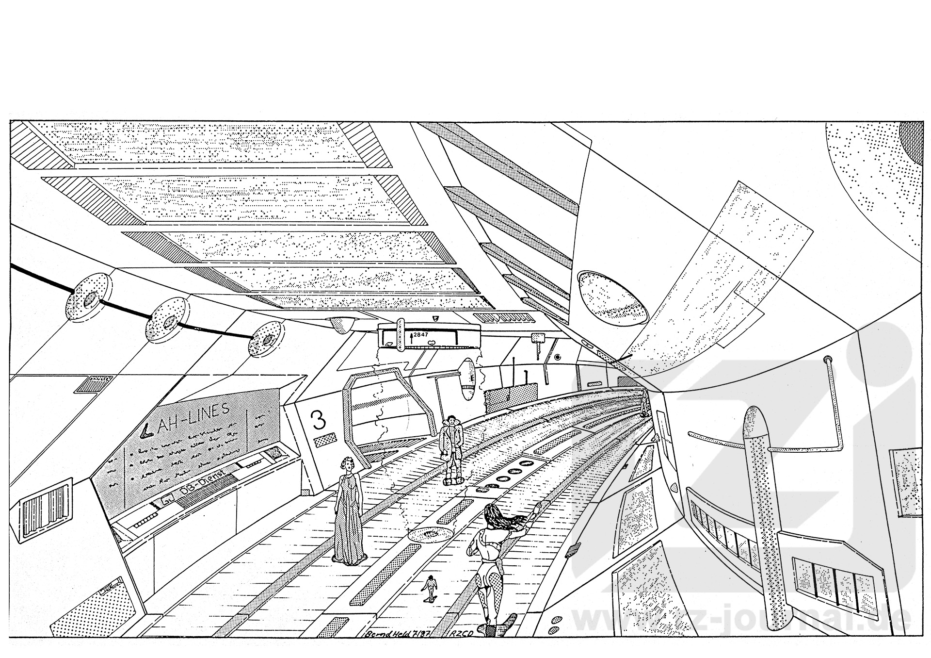 Bei dem gezeigten Rollbahnschacht handelt es sich um einen kleineren Typus. Größere Systeme haben bis zu vier verschieden schnell laufende Bänder pro Richtung. Wir sehen hier einen Gang, der sich im Privatjachtbereich von Terrania Space Port befindet und über zwei Bänder pro Richtung verfügt. Die Dame rechts vorne wurde gerade auf ein Angebot der AH-Lines auf dem großen Monitor aufmerksam. Bildschirme dieser Art sind in regelmäßigen Abständen im Schacht verteilt. Die Frau gibt also mit ihrer rechten Hand ein optisches Signal an den über ihr befindlichen |