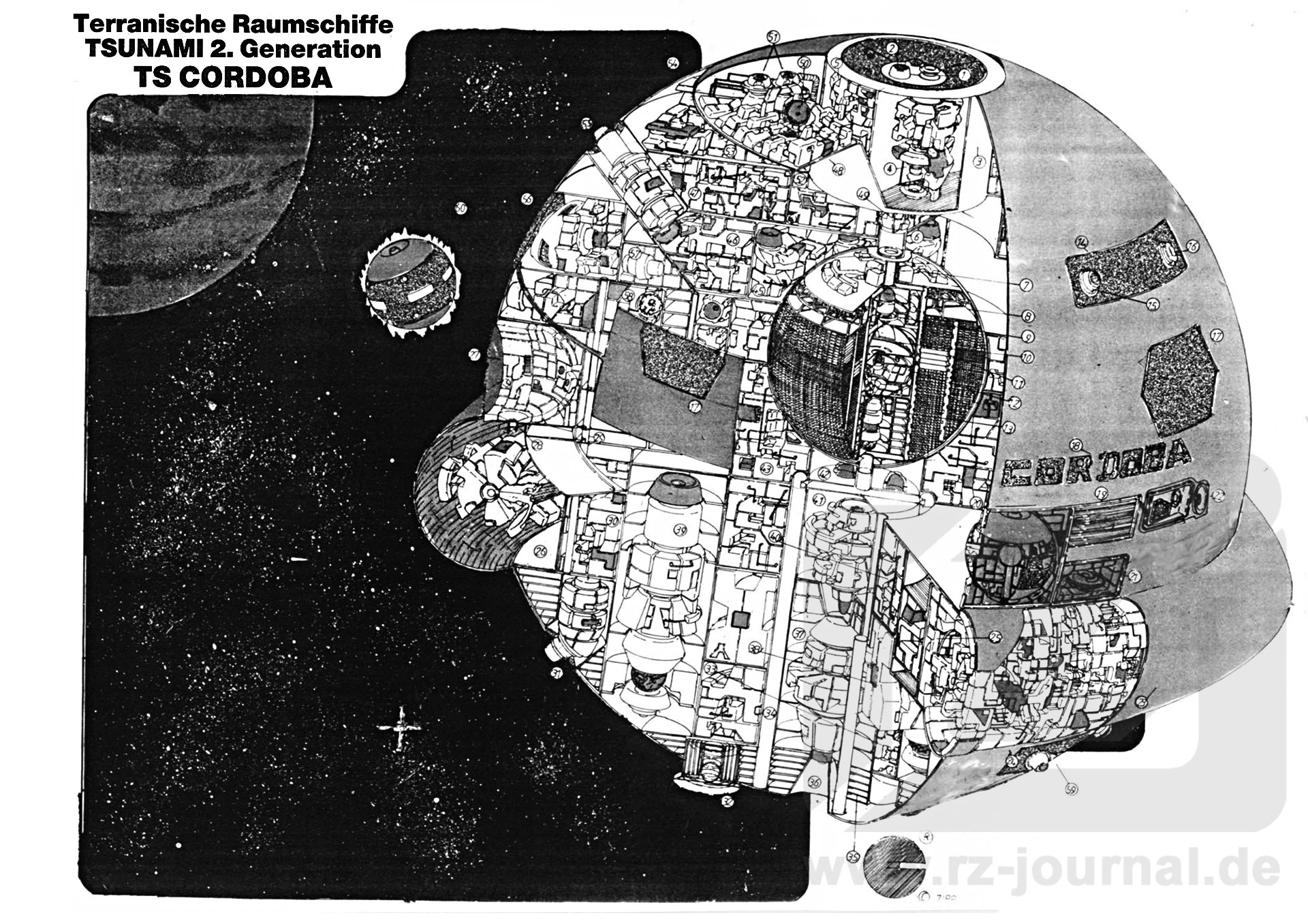 Allgemein: Die TS-CORDOBA ist ein Tsunami der 2. Generation. Dir Durchmesser beträgt statt 200 (wie bei den alten Tsunamis) nunmehr 500 Meter. Bei den Tsunamis der CORDOBA-Klasse entfällt ein Schwesterschiff, was durch die ebenfalls ATG-bestückten 5 Korvetten und 10 Space-Jets ausgeglichen wird. Die CORDOBA verfügt neben den Hypertropanlagen über 6 Großkraftwerke auf NU-GAS/Schwarzschild-Basis. Diese ermöglichen sowohl ein Auftanken (Fluten) der Gravitrafspeicher (beispielsweise nach einem Strangeness-Schock) als auch einen völlig normalen Betrieb, sogar Gefechtssituationen sind zu meistern, da fast alle Waffen und andere Systeme autarke Kleinkraftwerke besitzen. Die 6 Großkraftwerke werden hauptsächlich für die Speisung der Triebwerke in diesen Situationen verwandt. Die CORDOBA besitzt einen Ringwulst, in dem der Antrieb, bestehend aus Metagrav-Projektoren (und Generatoren), sowie Grigoroff-Systeme untergebracht wurden. Die Bewaffnung besteht aus 8 Transformkanonen, die sich in eine Doppelkanone am oberen Pol und je drei Kanonen ober- und unterhalb des Kugeläquators aufteilen. Dazu kommen 6 MHV-Geschütze (ebenfalls 3 oben/3 unten) und ein Konstantenriß-Nadelpunkt-Geschütz (KNG). welches sich am oberen Pol befindet. Die Defensivbewaffnung setzt sich aus einem 5fach gestaffelten Paratronschirm, einem 3fach staffelbaren Hochenergie-Überladungsschirm sowie einem Paratron-Schlüsselfangfeld, das jedoch seine Wirkung nur entfalten kann, wenn dem Syntron (besser den Projektoren) genügend Zeit bleibt, das Feld an berechneter Stelle aufzubauen (dieses ist nicht immer der Fall), zusammen. Dio CORDOBA wurde 448 NGZ speziell für Ratber Tostan gebaut. Die Stammbesatzung besteht aus 157 Mann, von denen 150 in dem ringförmigen Medocenter den Strangeness-Schock im Medoschlaf überständen, während die 7 Mann der Zentrale eigene Medoliegen hatten. Technische Daten: Durchmesser (ohne Wulst): 500 Meter Durchmesser (mit Wulst): 850 Meter Antrieb: Metagrav Beschleunigung: 965 km/sec² (in Ausnahmefällen 1100 km/sec2) Überlichtfaktor: 95 Millionen x LG Steuerung: 7 Syntrone im Verbund, zusätzlich dreifach redundante Notpositronik, Überrangeingabe, SERT-Systeme zuschaltbar Bewaffnung: