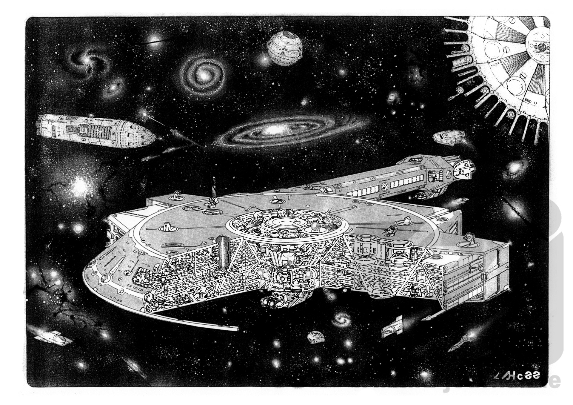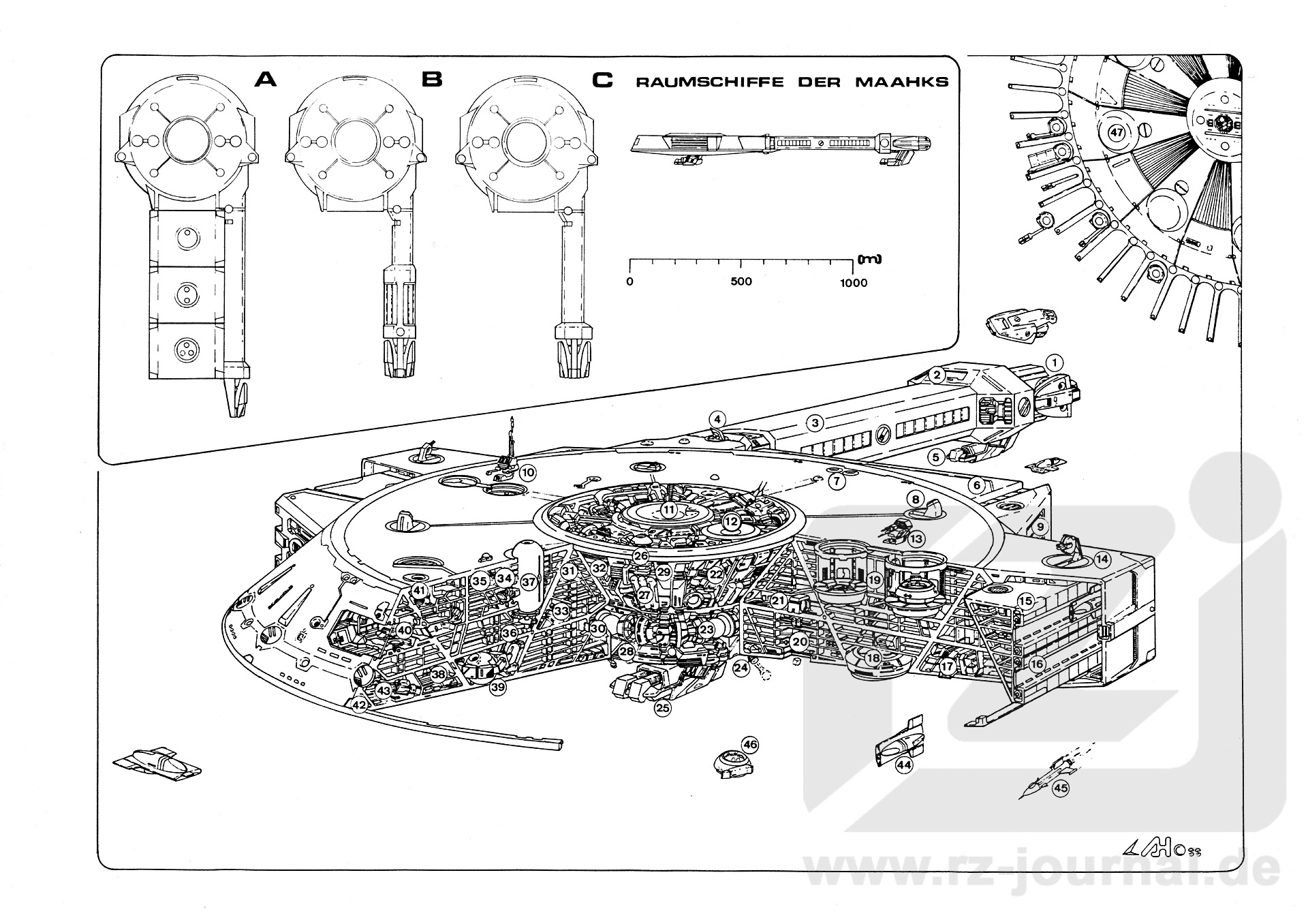 Allgemeines: Am 15. April 1143 NGZ flog der terranische Kugelraumer TS CORDOBA unter Commander Ratber Tostan die LOOKOUT-Station, einen Weltraumbahnhof der Maahks, an, wo die Terraner feindselig empfangen wurden. Die Maahks sandten sechs ihrer neuesten Raumer aus, um die TS CORDOBA abzufangen. Diese Raumer stellen eine neue Generation maahkscher Raumschiffetechnik dar, deren ungewöhnliche asymmetrische Form nicht mehr an die ursprünglichen Walzenraumer erinnert. Die neuen Raumer bestehen aus zwei Teileinheiten, einer diskusförmigen Trägereinheit und einem länglichen Funktionsausleger. Ersteres, auch Primäre Operation Trägereinheit bzw. P.O.T. genannt, bildet die Basiseinheit des Räumers. Sie hat einen Durchmesser von 640 m und eine Höhe von 150 m. An die Basiseinheit kann je nach der Art des Einsatzes ein bestimmtes Funktionsmodul angekoppelt werden, so daß der Raumer der Credo-Klasse ein breites Einsatzspektrum aufweist. Das Funktionsmodul ist der asymmetrisch angedockte Ausleger, weicher als S.F.M. oder Sekundäres Funktionsmodul bezeichnet wird. Die Trägereinheit sowie die Varianten des S.F.M. sind mit Hyperantrieben ausgestattet, was beide Teileinheiten zu eigenständig operierenden Raumschiffen macht. Für Raumflüge unterhalb der Lichtmauer sorgen eine Reihe von Feldantrieben, welche auch für Start- und Landemanöver verantwortlich sind. Mit Hilfe des metagravähnlichen Antriebes sind Raumflüge im superphotischen Bereich mit einer Geschwindigkeit von 80millionenfacher c möglich. Die minimale Beschleunigung des Raumtitanen liegt bei etwa 1040 km/ s². Achthundertsechzig Maahks bilden die Besatzung, die sich in 260 Mann Schiffsführung und 600 Mann Techniker und Beiboot-Besatzungen aufteilt. Die Schemazeichnung zeigt drei der bekannten Varianten dieses Raumschiffstypen. Auf der Graphik A erkennt man die Basiseinheit mit einem verlängerten Funktionsmodul. Zusammen bilden beide Teileinheiten einen CARGO-Transporter. Am Sekundären Funktionsmodul sind drei maahksche Großraum-Normcontainer angekoppelt. Der so entstandene Raumfrachter hat eine Gesamtlänge von 1560 m. Die Graphik B zeigt die Carrierversion des Credo-Raumschiffes. Das Funktionsmodul enthält neben zwei am Heck angedockten Korvetten noch zwei Landungsboote für militärische Einsätze. Zudem sind im Ausleger für 3000 Mann Landungstruppen Wohn- und Aufenthaltsbereiche vorhanden. Die Gesamtlänge dieser Version beträgt 1350 m. Auf der Graphik C erkennt man die Kreuzerversion, weiche wie die Carrierversion ebenfalls zwei Korvetten besitzt und gleich lang ist. Zudem befinden sich außen an beiden Längsseiten des Funktionsmoduls noch vier Frachtmulden für 30 kleine Normcontainer. |