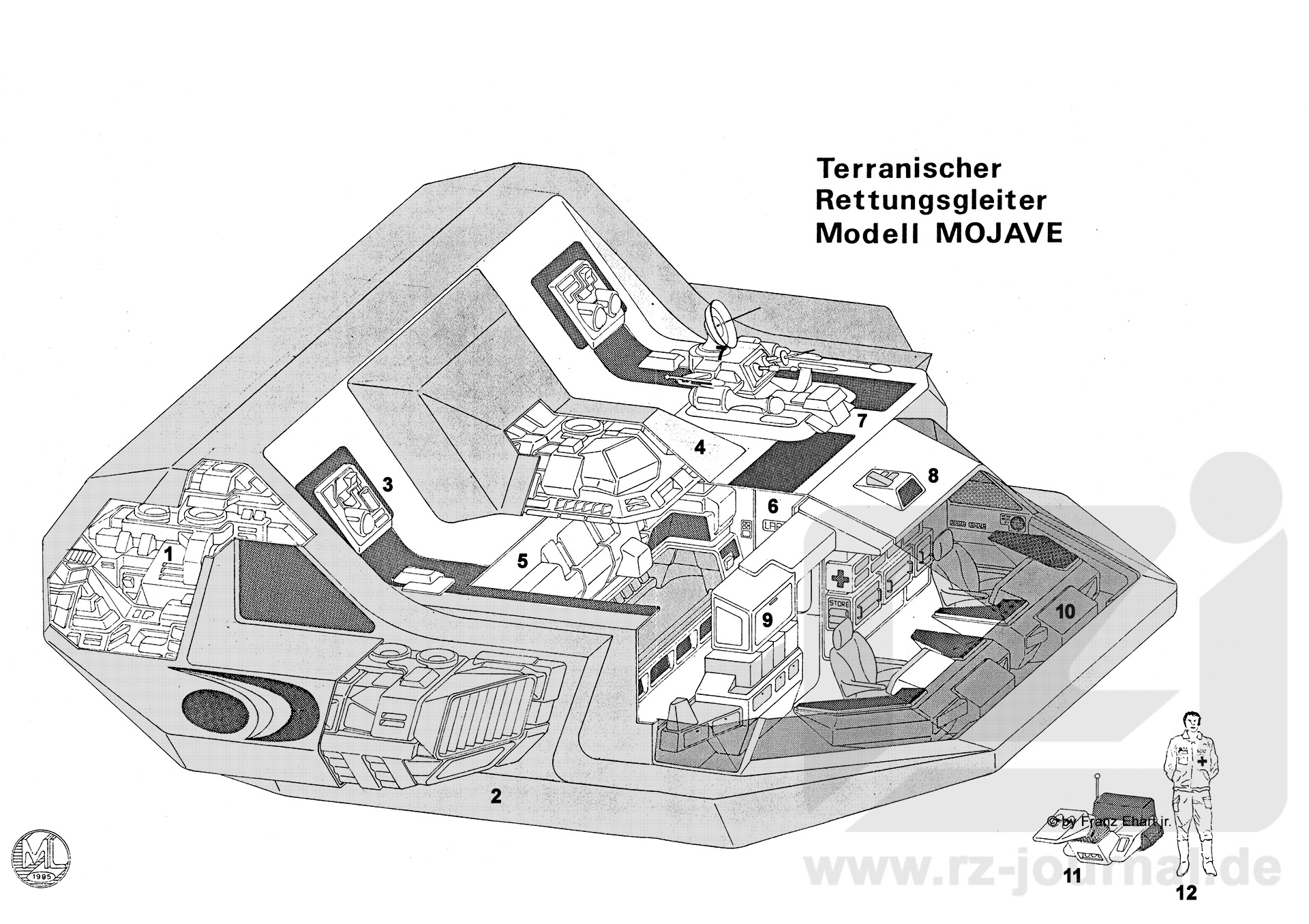 Allgemein: Der Rettungsgleiter MOJAVE wird von dem in Sydney ansassigen Luftfahrtunternehmen FastAir gebaut und findet aufgrund seiner hohen Geschwindigkeit und exzellenten Manövriereigenschaften galaxisweit Abnehmer, u.a. bei planetaren Rettungsdiensten aber auch bei den vielen Off-Road-Freaks, die es auch 446 NG2 noch gibt. Der hier abgebildete Rettungsgleiter ist in Porto Allegra/ Südamerika stationiert. Er wird von einem Kosmomediziner gesteuert, dem bei Bedarf ein Spezialist zur Seite gestellt wird. Zur Gleiterausstattung gehört auch ein MedoRob neuester Bauart. Sein Äußeres wurde nach psychologischen Gesichtspunkten gestaltet. Anstelle von Armen besitzt er zwei Multi-Gravoprojektoren, die bis zu 140 Gravofelder aller Größen projizieren können, was die medizinischen Möglichkeiten von Händen bei weitem übertrifft. Ein Satz Hochdruck-lnjektoren kann über größere Distanzen Medikamente aus dem Vorrat des Robs verabreichen, der viele gängige Kosmopharmaka enthält. In einer Gravo-Blase, die der Rob erzeugt, können Hilfsbedürftige durch eine Dachöffnung in den Medo-Tank transportiert worden.