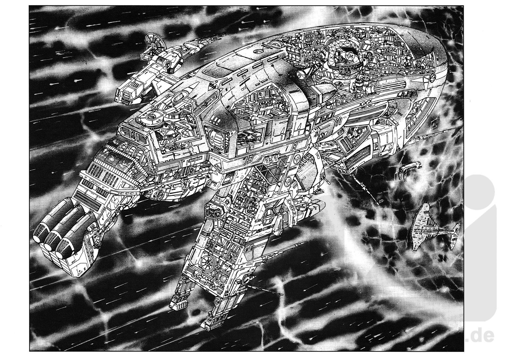 Zur Zeichnung: Das Ewigkeitsschiff hat gerade den Ereignishorizont des Black Hole passiert und fliegt durch einen Hyperraumtunnel die Hyperraumblase an. Technische Daten: Das Ewigkeitsschiff hat eine Länge von 250 m, eine Breite von 120 m und eine Höhe von 150 m. |