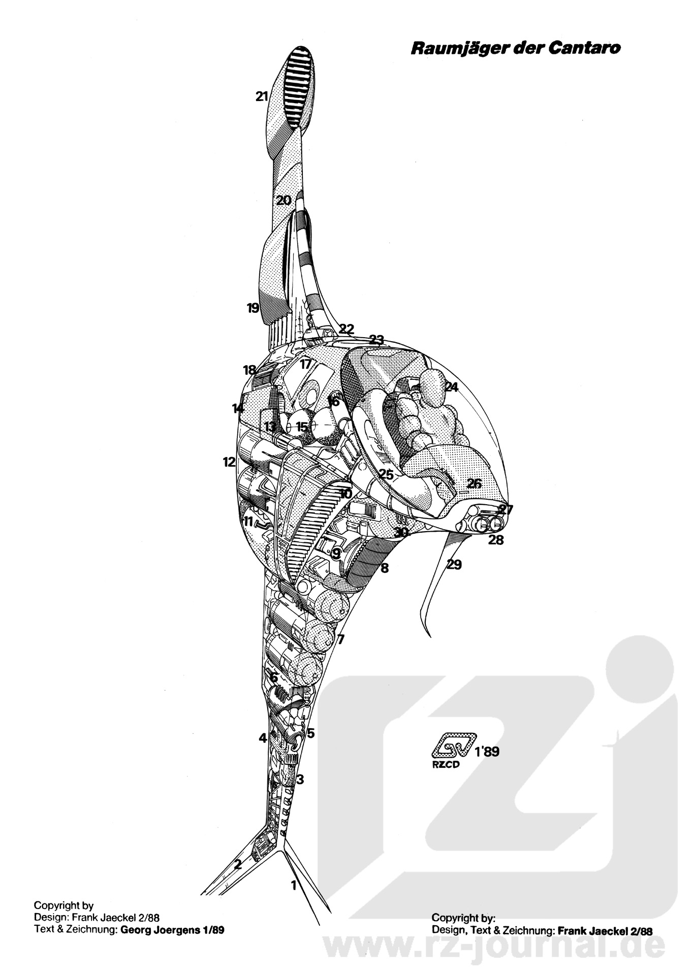 Technische Daten: (Angaben entstanden durch wissenschaftliche Extrapolation durch bestehende und bekannte Fakten der Cantaro-Technologie) Typ: Vertikalraumjäger der Cantaro Verwendung: Taktischer Mehrzweck-Kampfjäger und Aufklärer Triebwerke: atmosphärisch: 1 Innenstrom-Gravojettriebwerk 1 Turbobuster für Notbeschleunigung unterlicht: 2 Zwillings-Jettriebwerke überlicht: 3 in Verbund geschaltete Transitionstriebwerke mit potentialer Leistungsstaffelung Besatzung: 1 Cantaro Höhe: 13,6 m Breite max: 1.75 m Länge: 4.6 m Leergewicht: 4737 kg; Gesamtlast: 6840 kg Startgewicht: 11577 kg maximal Außenlast: 3175 kg maximal Bewaffnung: offensiv: 1 Transferstrahler 1 Front-Hochleistungs-Kombi defensiv: (wahrscheinlich) Pandimensionaler Schutzschirm Metall-Struktur: gravomechanisch verdichtetes Polymermetall Legende: 1. Leistungsstarke Nadelantenne 2. aerodynamische Stabilisierungsfinne mit integriertem Funkdecoder 3. Pandimensionaler Deflektorschirmprojektor (PAN-Deflektor) 4. Energiemeiler mit Umformerbank 5. Energiereservespeicher 6. Steuersyntronik für Transitions-Triebwerksblock 7. gestaffeltes Tri-Transitions-Triebwerk 8. Abstrahlpol für Transferstrahler (ähnlich Transformkanone) 9. Transmissionsprojektor für Thermoquanten 10. Lufteinlaß für Innenstrom-Gravojettriebwerk 11. Antigrav-Triebwerksblock 12. Zwillingsjettriebwerk für Unterlichtflug 13. Separat-Syntronik mit Kontrollfunktion 14. Multi-Logik auf Pikosynbasis 15. Lebenserhaltungssystem 16. leichter Schwerkraftkompensator für extreme Manöver 17. zentrale Schiffssyntronik. 18. Energiezapfer mit darüber liegendem Speicherblock 19. Funk- und Ortungsmodul 20. Schiffswandung aus gravomechanisch verdichtetem Polymermetall 21. Turbobuster für Notbeschleunigung 22. Sensorleiste mit Raumüberwachungsscannern 23. Defensivschirmprojektor 24. Cantaro in schwerer Schutzkombi mit integrierten Pikosyntroniken 25. Instrumentenleiste mit Manualinstrumentierung 26. Konsole für audiovisuelle Dielektik-Steuerung 27. Fernleitscanner 28. Hochleistungs-Frontkombi (Desintegrator. Impuls, Thermonadler) 29. aerodynamisches Steuerelement |