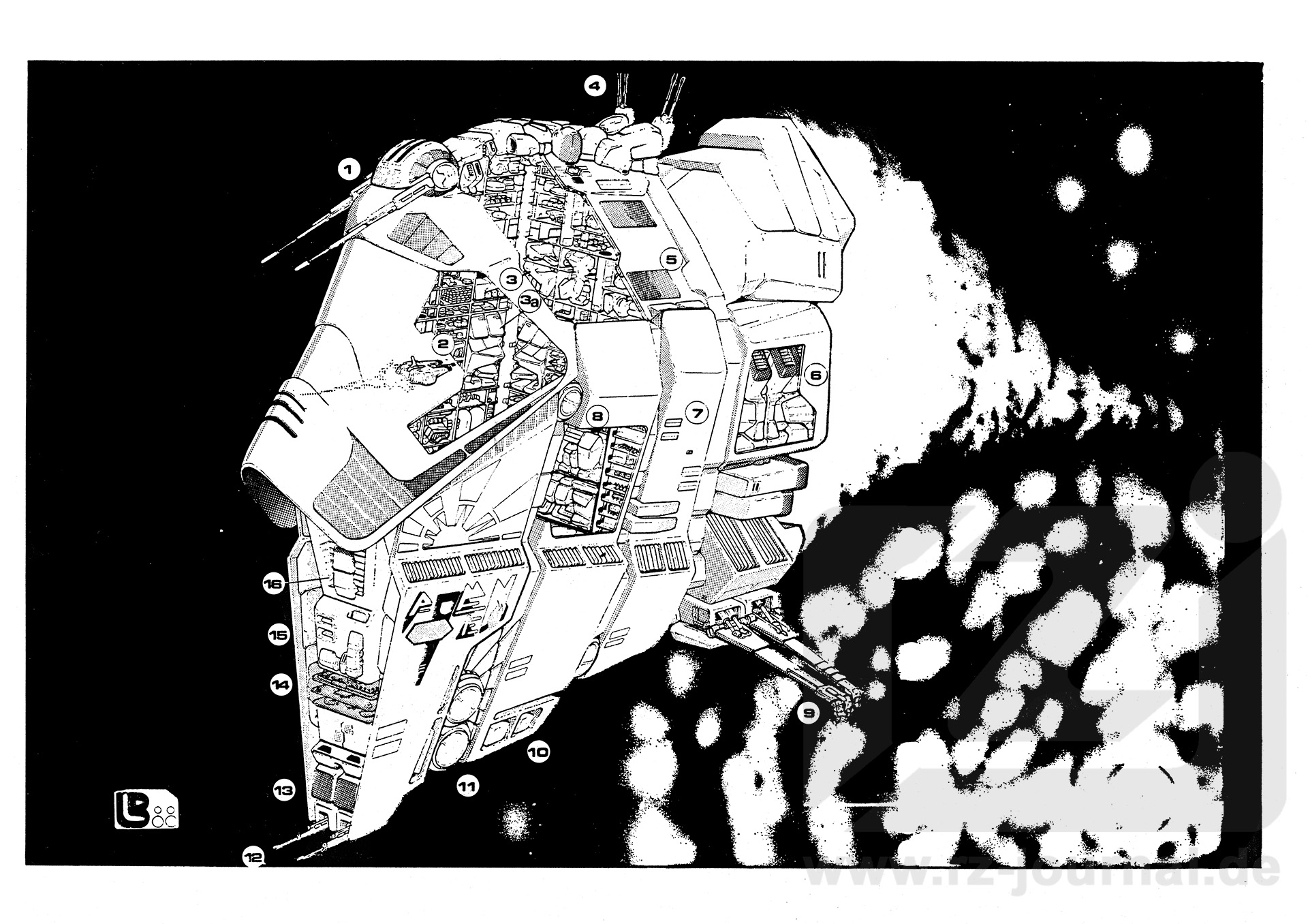 Defensiv-Bewaffnung: Antiortungsschirme Beiboote: Besatzung: unbekannt Zeichenerklärung: 1. Weitreichende Offensivwaffe 2. Anfliegendes Beiboot der Hauri 3. Energiewandler 3a. Hauptenergiespeicher 4. Hyper- und Normalfunkantennen 5. Hangartor 6. Triebwerksreaktoren 7. Jägerhangartore 8. Antigravtriebwerk 9. Ausleger der Energiezapfanlage 10. Psifeld-Projektoren 11. Schutzschirmprojektoren 12. Kurzdistanzwaffe 13. Orterblöcke 14. Kommandozentrale 15. Projektorplatte für großflächiges Desintegratorfeld 16. Traktorfeldprojektor Textentwurf, Design und Zeichnung: Lars Bubitz |