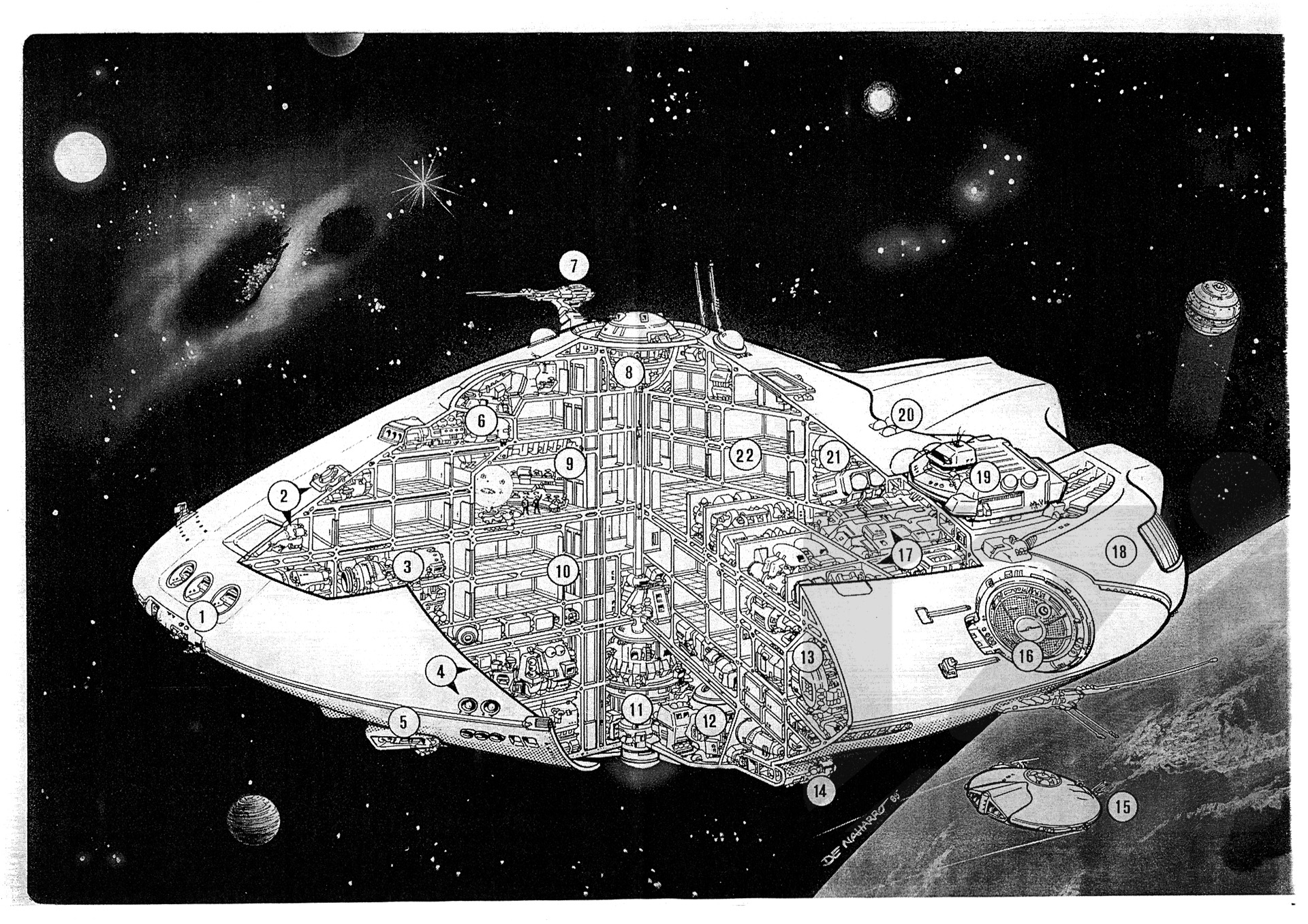 Allgemeines: Auch die Blues wurden durch die Vorherrschaft in der Milchstraße unterdrückt. Die Raumfahrt lag so gut wie brach. Durch die tatkräftige Unterstützung, in wirtschaftlicher sowie technischer Hinsicht, des Galaktikums und der Kosmischen Hanse wurden die Raumschiffe und anderes raumfahrttechnisches Material der Blues wieder einsatzfähig gemacht. Etwa 50 % der Diskusraumer wurden auf neuesten technischen Stand gebracht. Die Diskusform wurde beibehalten. Die größte und offensichtlichste Änderung war die Verlegung der Triebwerke in den äußersten Teil der Scheibe, daher auch die Änderung der Flugrichtung. Blues-Schiffe bis 400 Meter stellen die größten Einheiten dar. Das hier gezeigte Schiff hat einen Durchmesser von cirka 120 Meter, eine Länge von 132 Meter und eine Höhe von 54 Meter. Die Einsatzbereiche der Schiffe in, dieser Größenklasse sind weit gefächert. Das hier Gezeigte Wird mehr zum Personen- und Materialtransport eingesetzt. Der von Technik in Anspruch genommene Raum liegt bei 55 %. Beschleunigungswerte von 840 km/s² und das Metagrav-Triebwerk mit ÜL-Faktor 18 Millionen zeigen schon daß es sich hier nicht um ein kraftstrotzendes Kampfschiff handelt. |